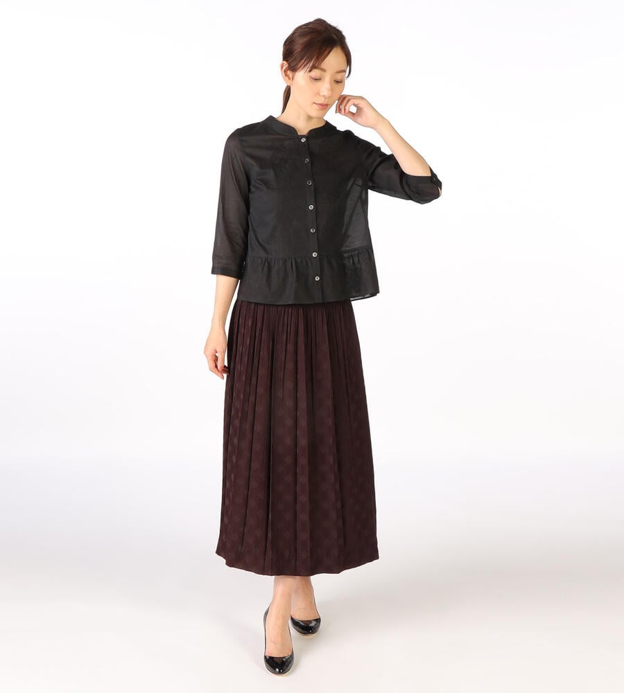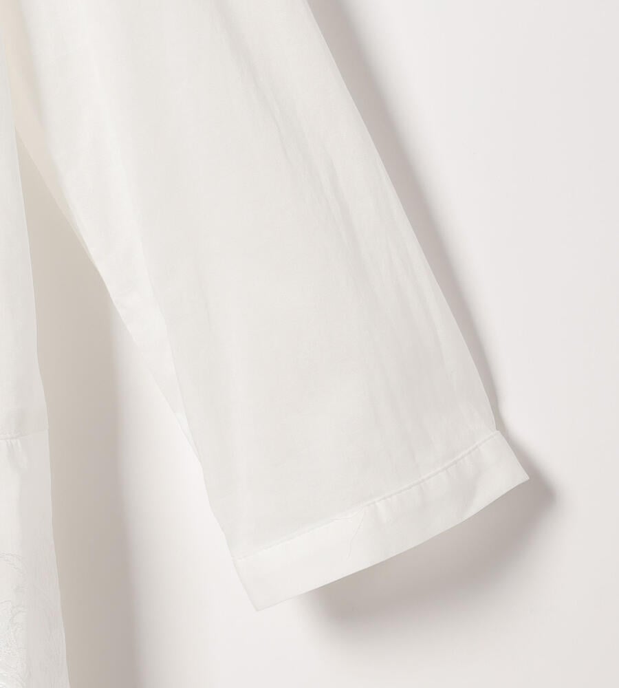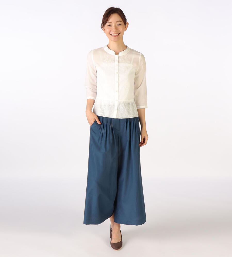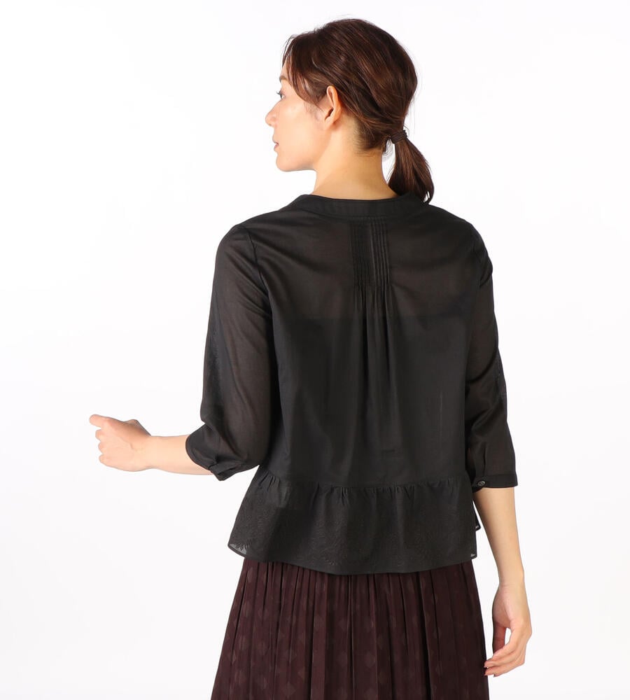 マオカラーを想わせるような二重襟や、フロントと裾の繊細な刺繍デザインにこだわりを感じる7分袖ブラウス。全体的にゆとりをもたせた自然なペプラムシルエットで、幅広い体型にフィットします。軽やかなコットン素材でオールシーズン活躍のアイテムです。フロントを開いて、カーディガンのように取り入れるのもおすすめ。