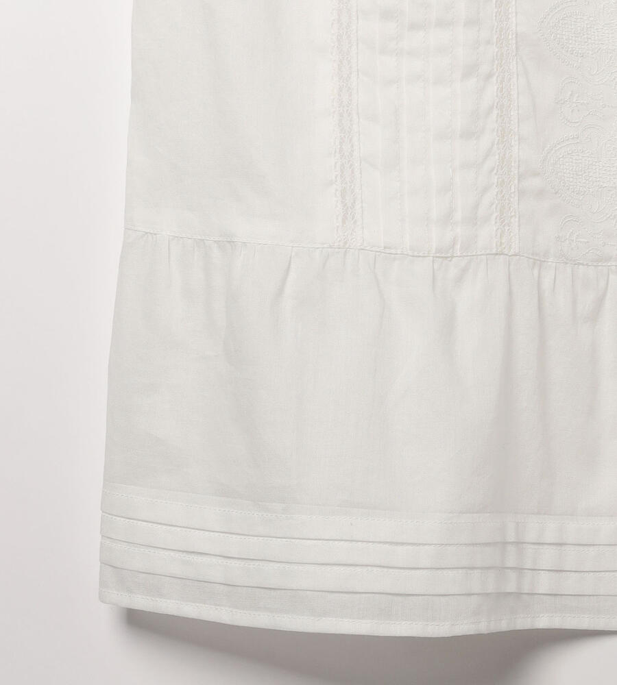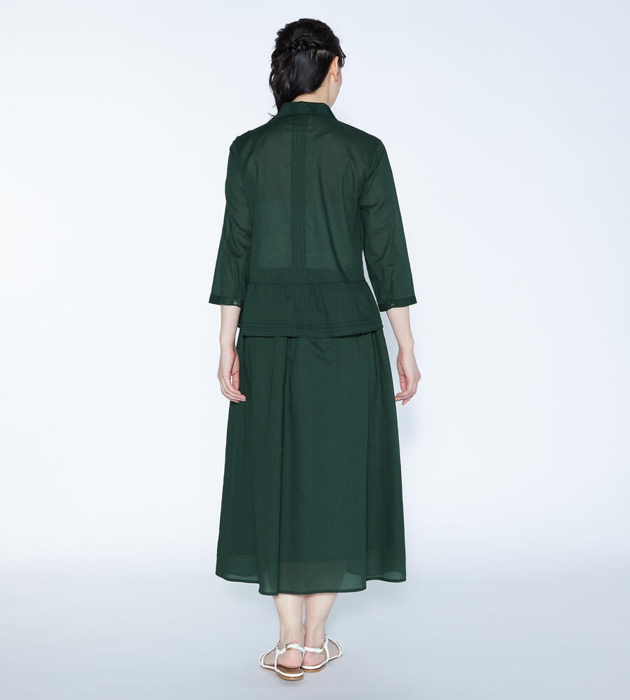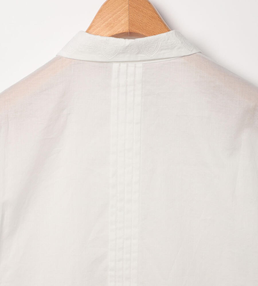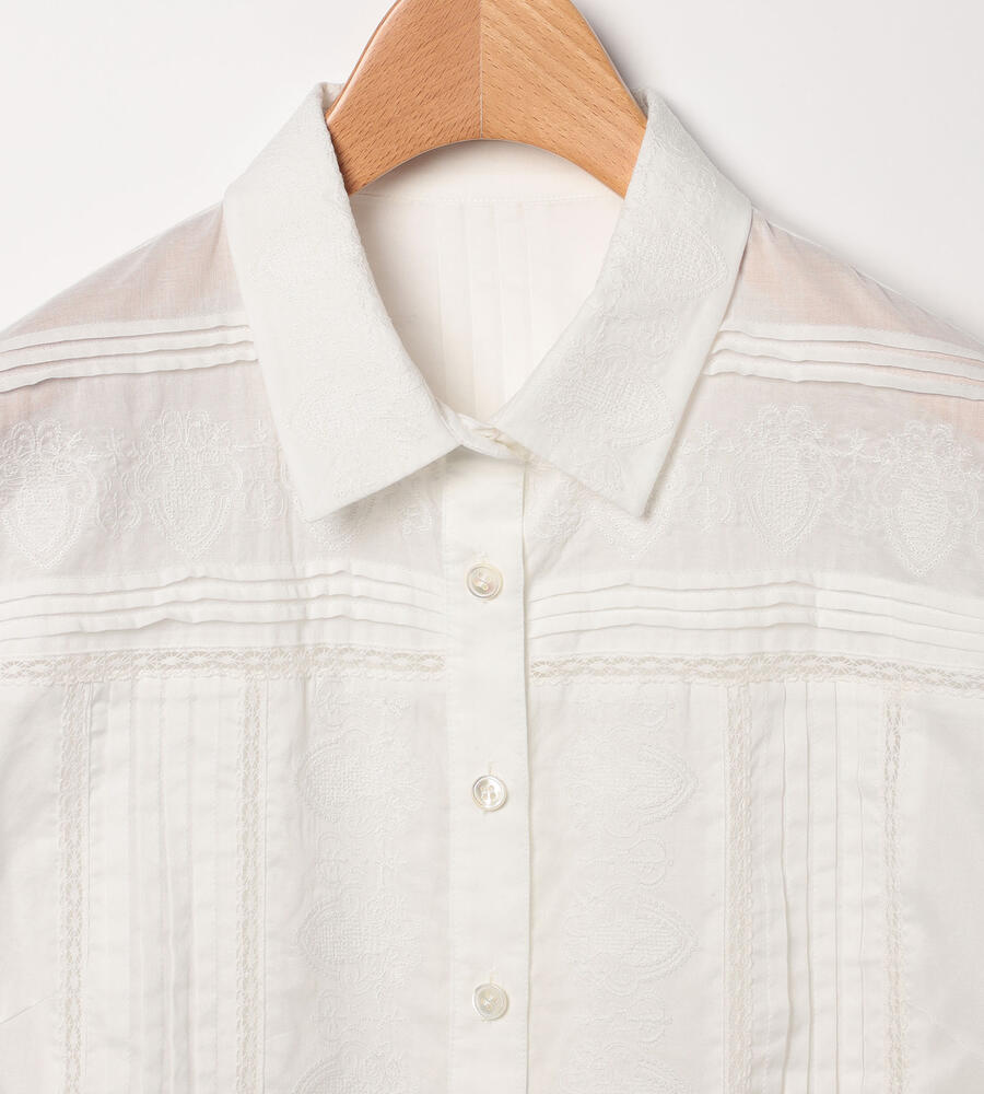薄手の素材で春夏らしい軽やかなムードのコットンローン生地で仕立てた七分袖ブラウス。刺繍、タック、裾フレアのデザインがエレガントなデザインポイント。ほどよいハリ感と光沢感のある生地で、美しいシルエットを実現。透け感のある生地で、おしゃれな重ね着コーディネートが実現するアイテムです。