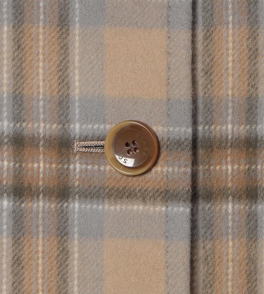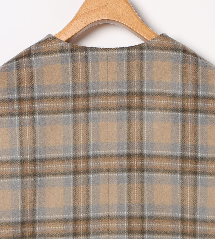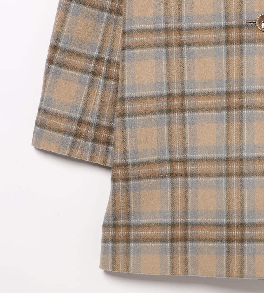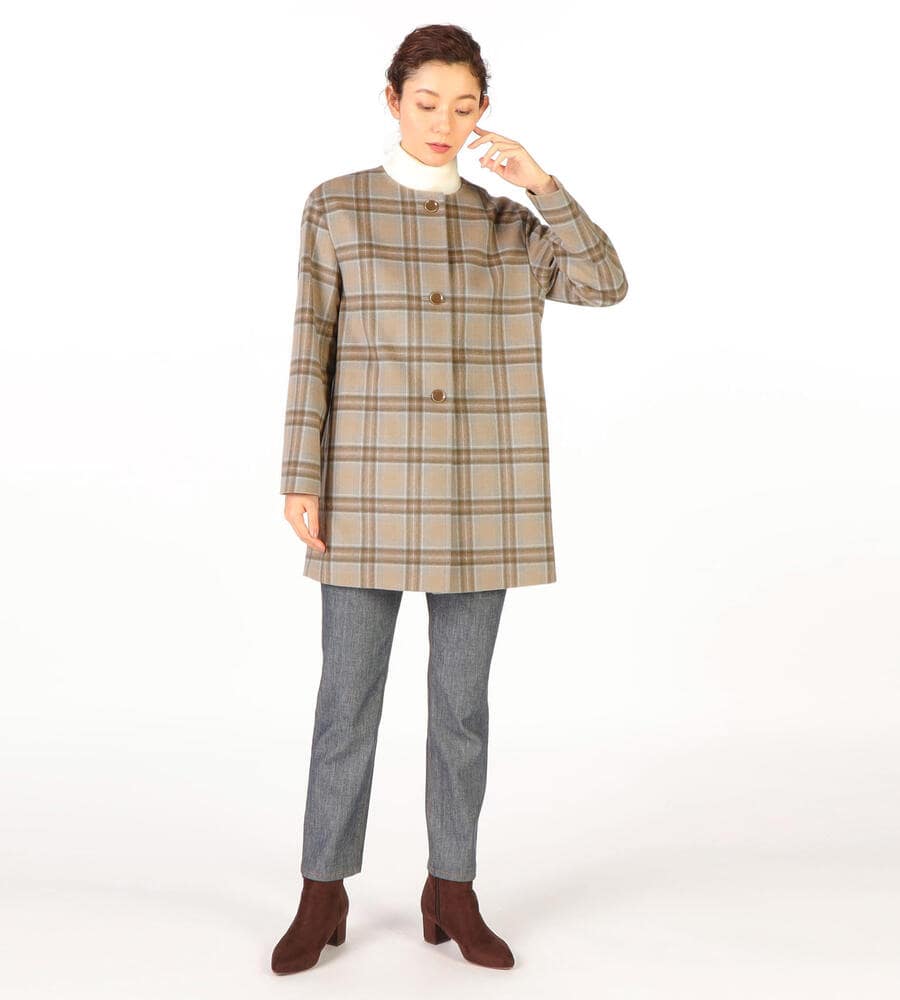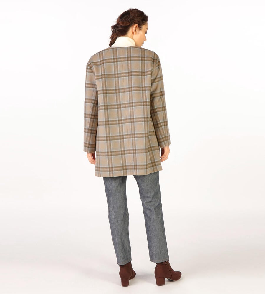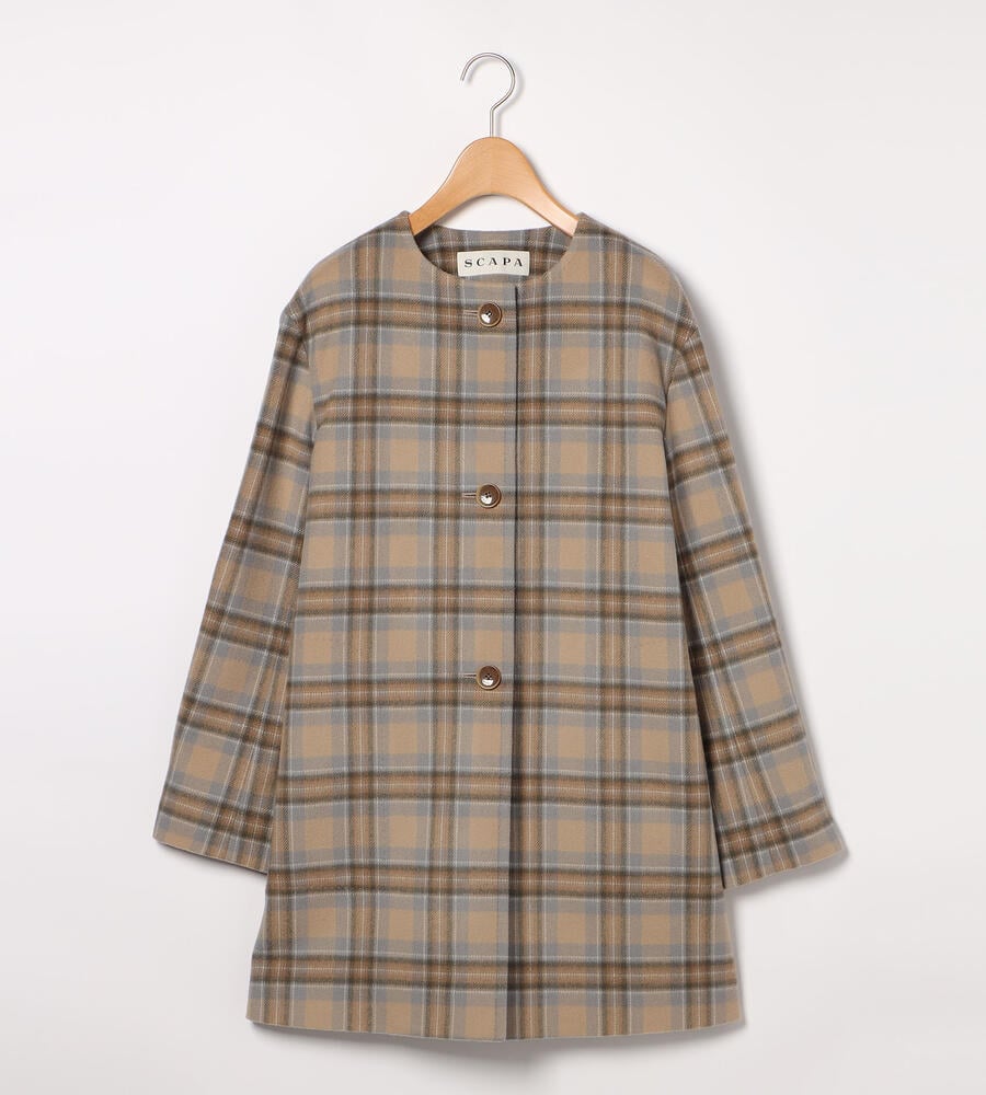 コーディネートのアクセントになるトラディショナルチェック柄のコート。ウール生地の秋冬シーズンらしいあたたかな素材感。ノーカラーのすっきりとした首回りが特徴。ブランドロゴ入りのボタンなど細部までこだわりを感じるデザインディテール。スタイリッシュなお出かけコーディネートが完成するアイテムです。