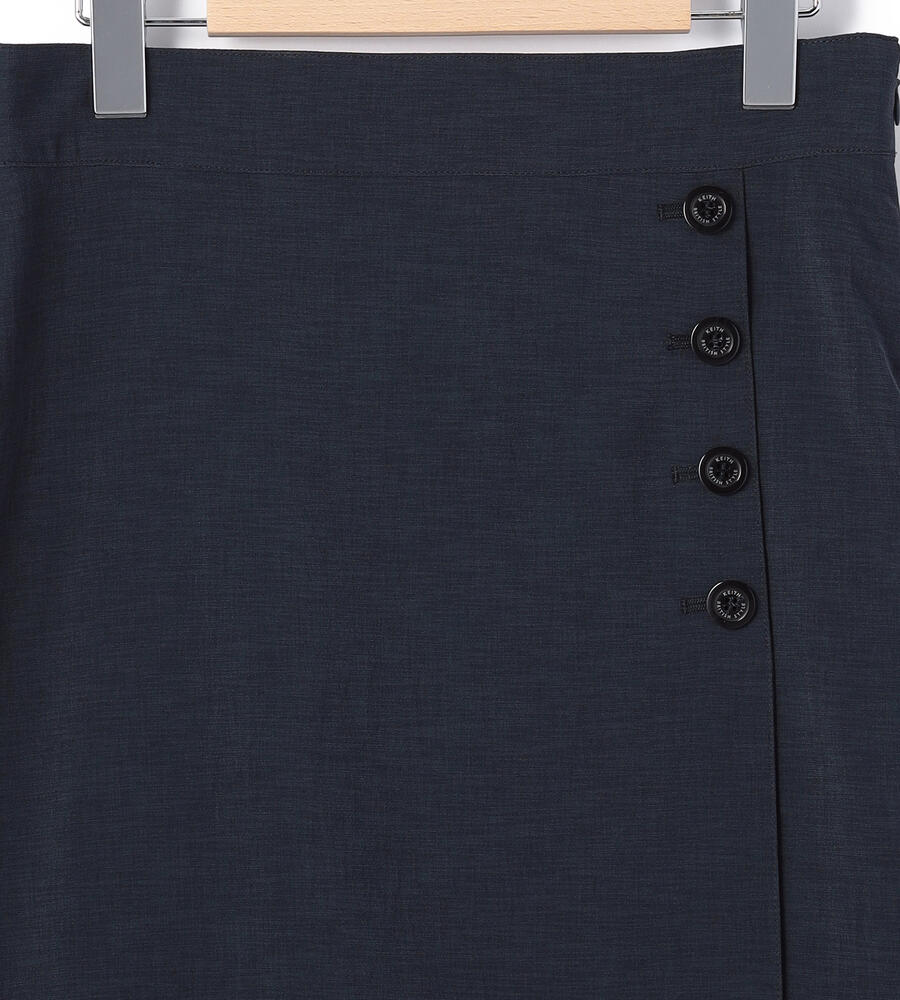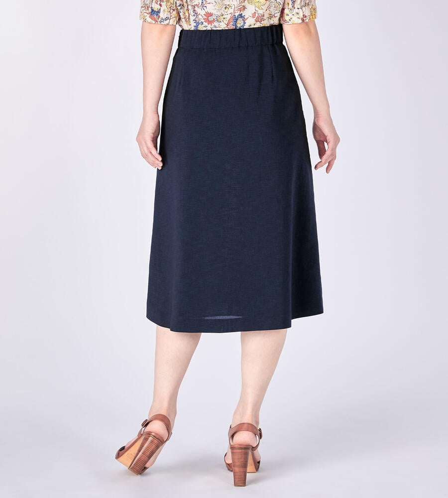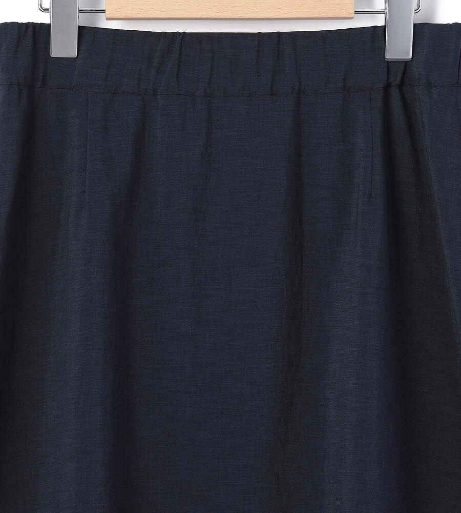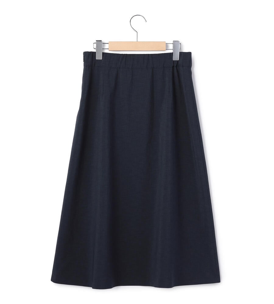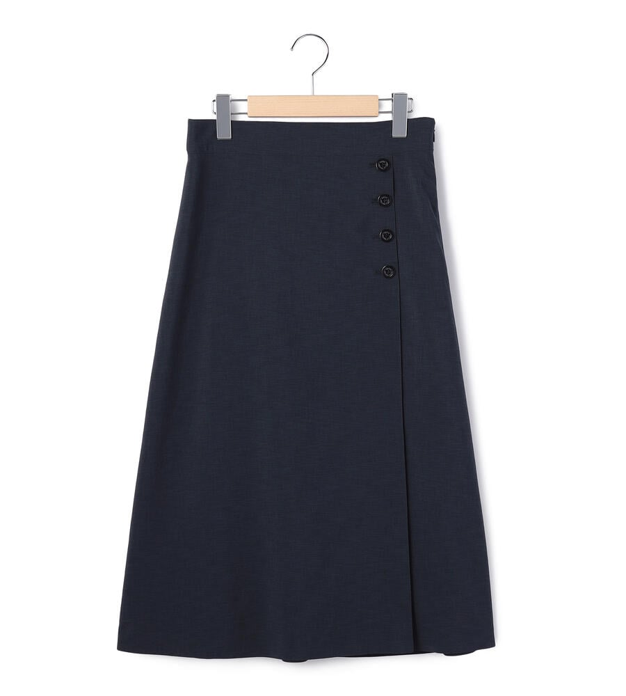ドライタッチな生地感が春夏シーズンに最適なスカート。巻きスカート風のデザインにブランドオリジナルボタンがさりげなくおしゃれなデザイン。ウエスト後ろはゴム仕様で履き心地快適なのもうれしいポイント。ひざ下丈のエレガントなミモレ丈。シンプルなデザインでデイリーからお出かけまで幅広く活躍するアイテムです。