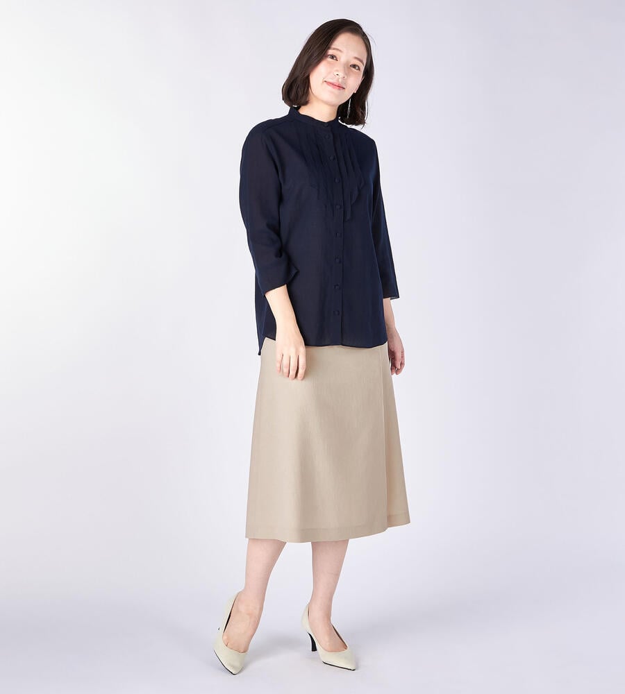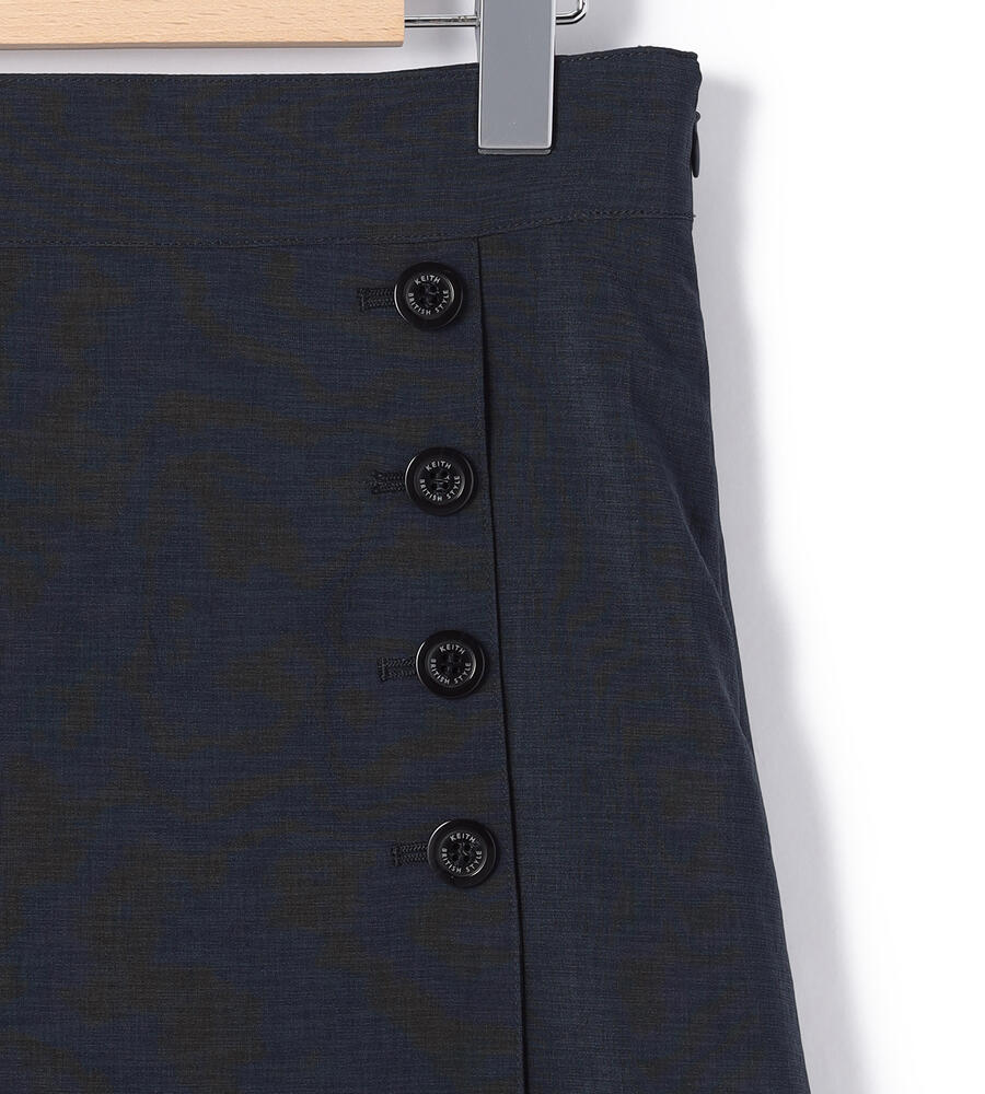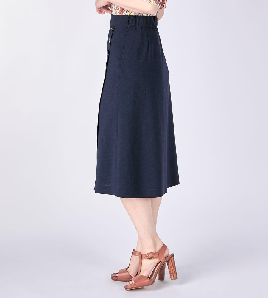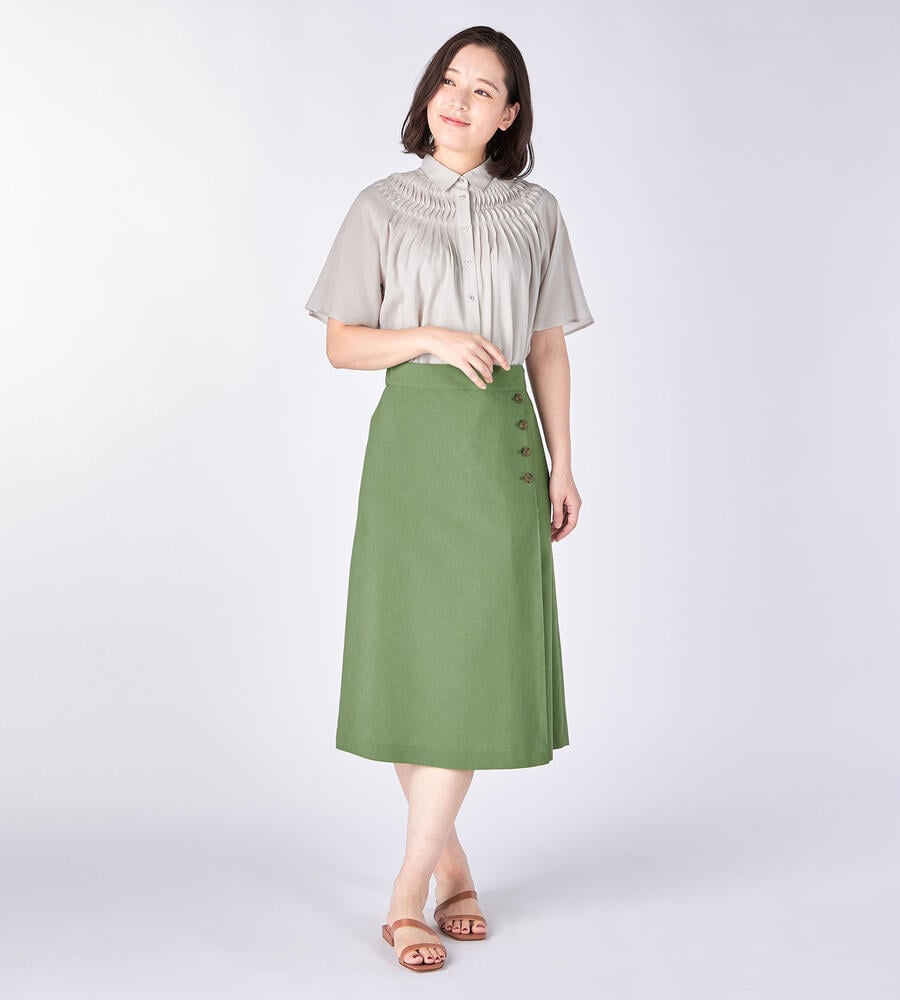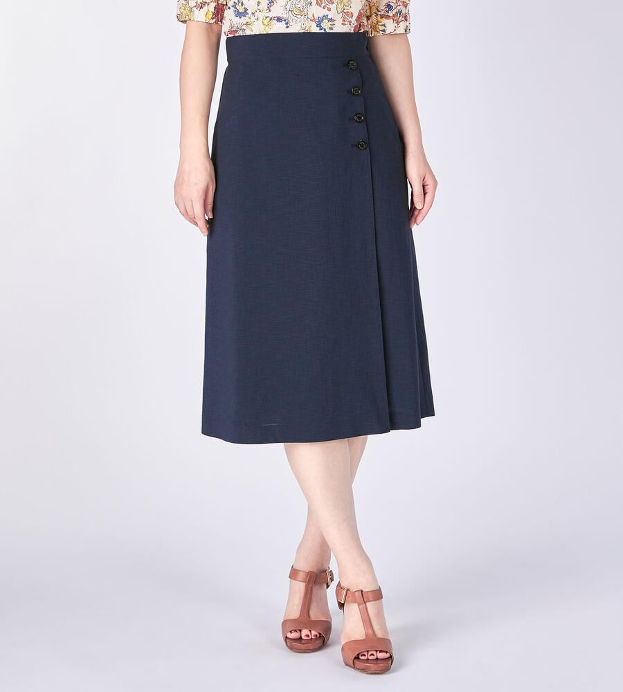 ドライタッチな生地感が春夏シーズンに最適なスカート。巻きスカート風のデザインにブランドオリジナルボタンがさりげなくおしゃれなデザイン。ウエスト後ろはゴム仕様で履き心地快適なのもうれしいポイント。ひざ下丈のエレガントなミモレ丈。シンプルなデザインでデイリーからお出かけまで幅広く活躍するアイテムです。