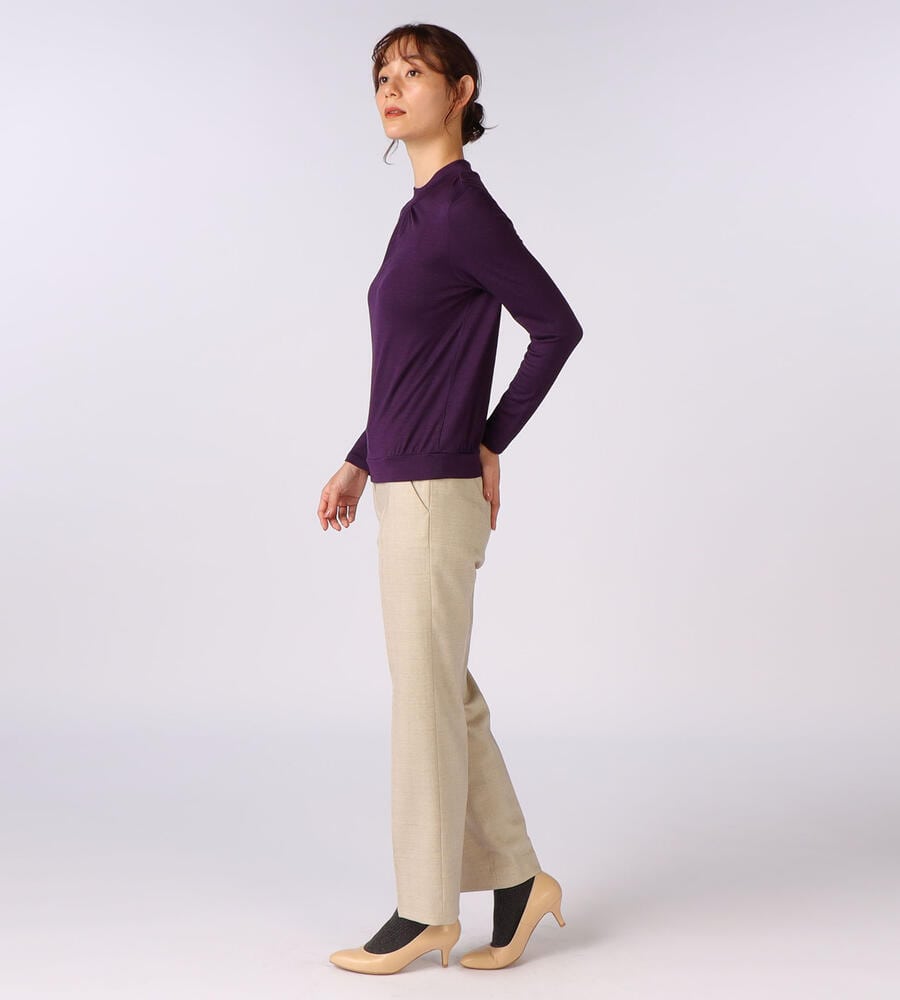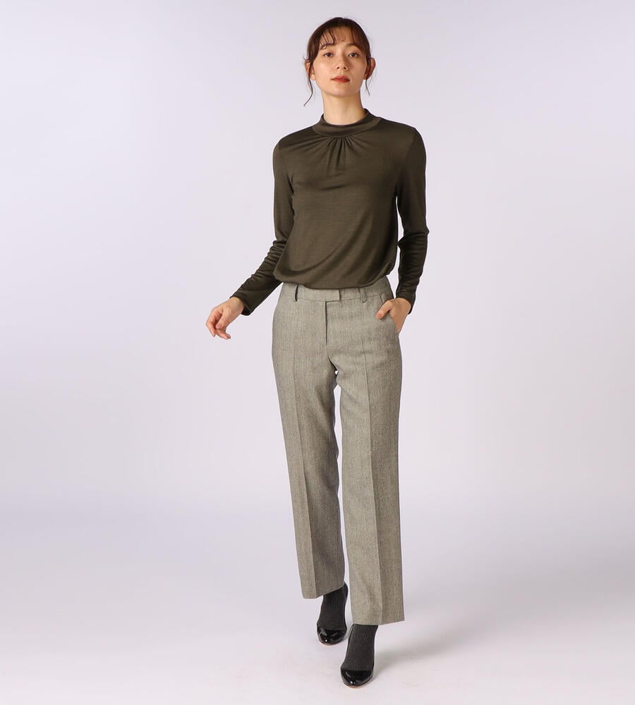 首もとのギャザーがワンポイントになったボトルネックカットソー。シンプルで合わせやすいデザインがスタイリングに活躍。薄手の素材は1枚着としてはもちろん、レイヤードスタイルのインナーとしても使い勝手の良いアイテムです。あたたかな毛100%素材を採用しています。