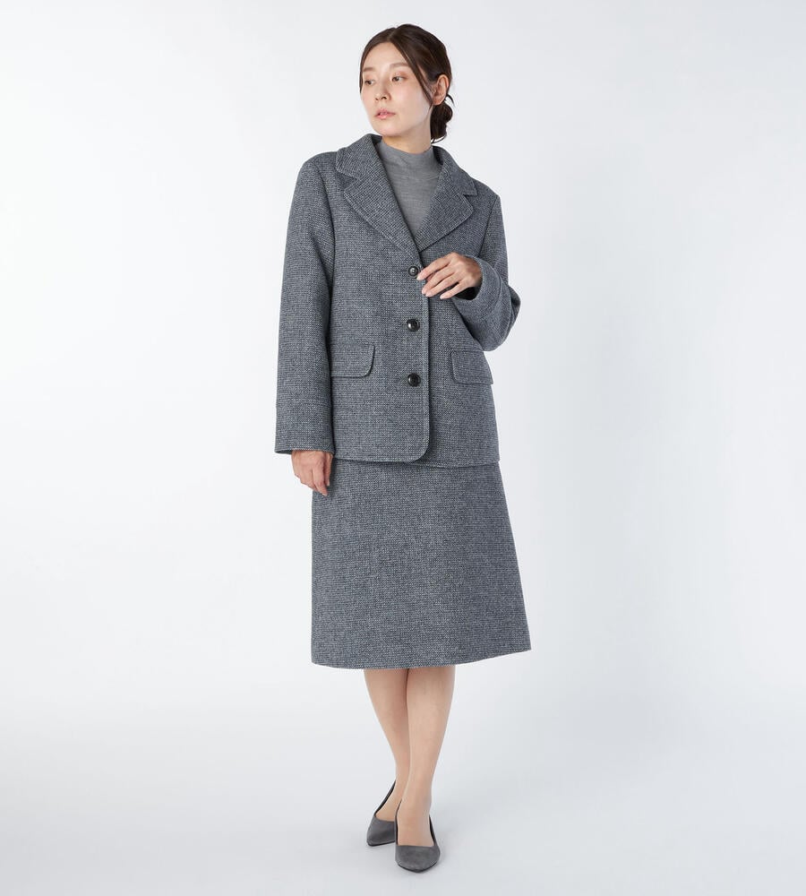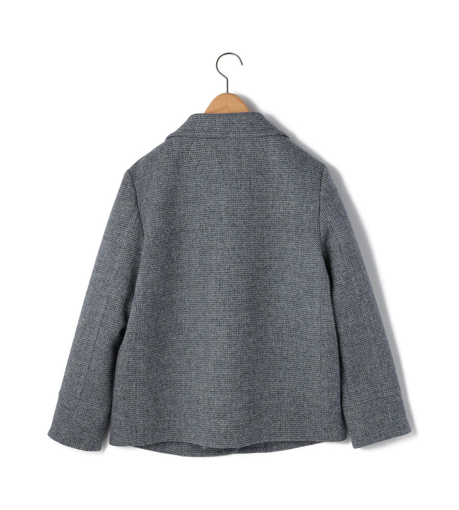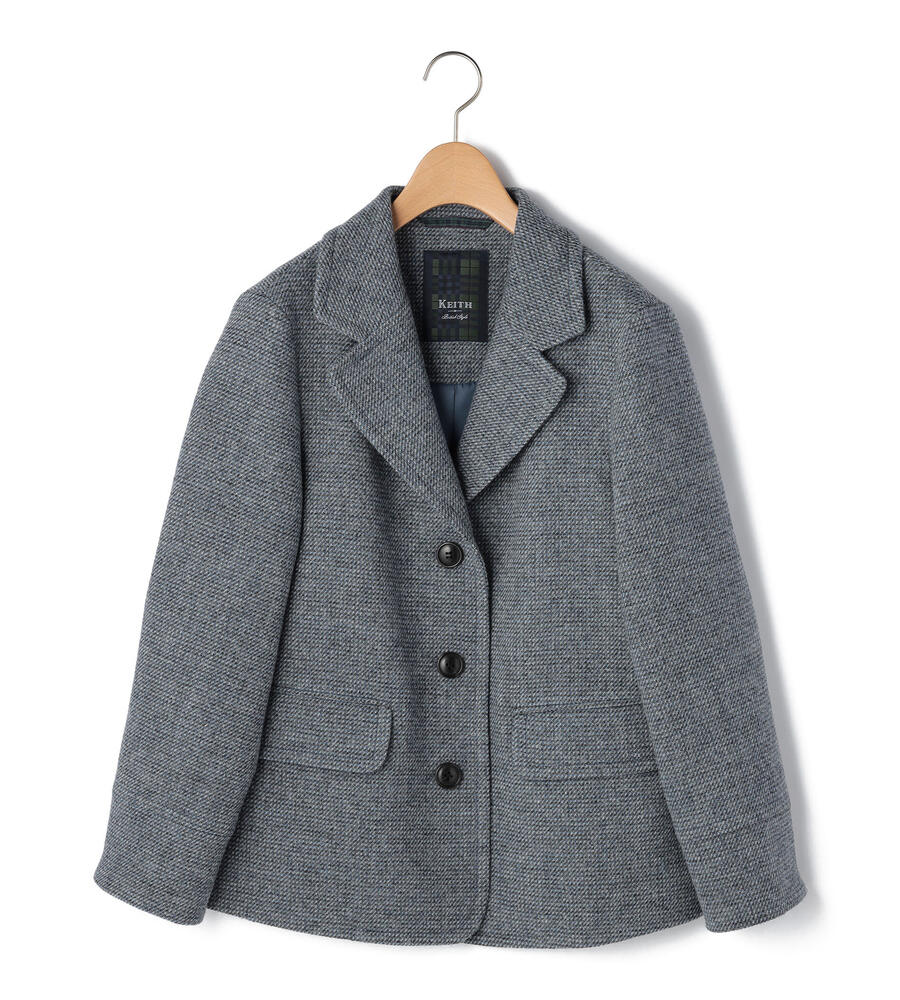 ブリティッシュウールを使用した、正統派の風格溢れるツイード素材のジャケット。ピーコートを思わせる広いラペルで、ジェントルな印象を備えた1点です。しっかりとした地厚の生地は、冬のアウターとして十分な暖かさ。同素材のスカートを合わせたセットアップスタイルもお楽しみいただけます。