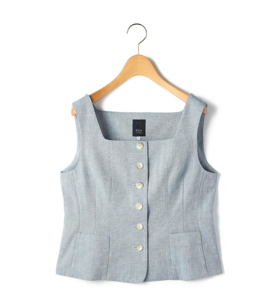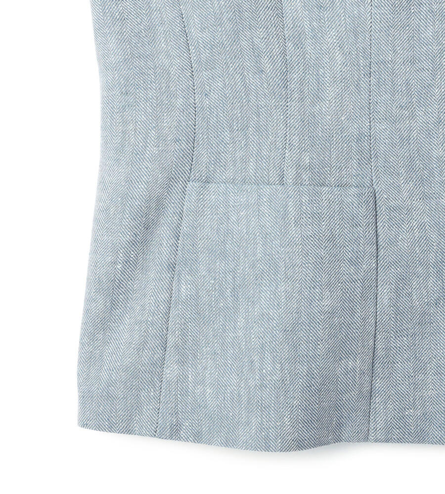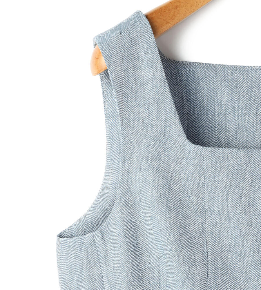 美しいラインを演出してくれるスクエアネックのヘリンボーンベスト。フロントに配置したボタン、切り替えに重ねるようにあしらったポケットがデザインポイントに。軽やかな着心地の麻とポリエステルのブレンド素材を採用しています。