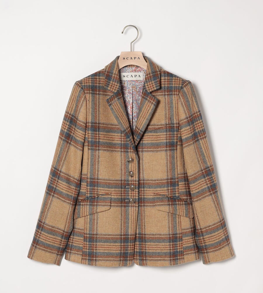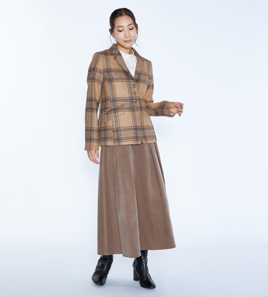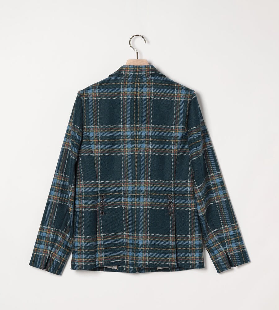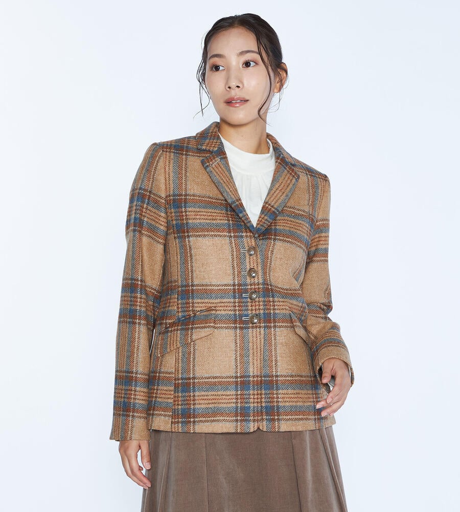 上質さとジェントルな空気感を併せ持つウール素材のチェック柄ジャケット。少し小ぶりなラペルや、上寄りに配置したボタンが、クラシカルな雰囲気を高めます。背面の中央寄りにインパーテッドプリーツを仕込み、後ろ姿を綺麗に見せる仕立て。同素材のスカートとのセットアップもお楽しみいただけます。