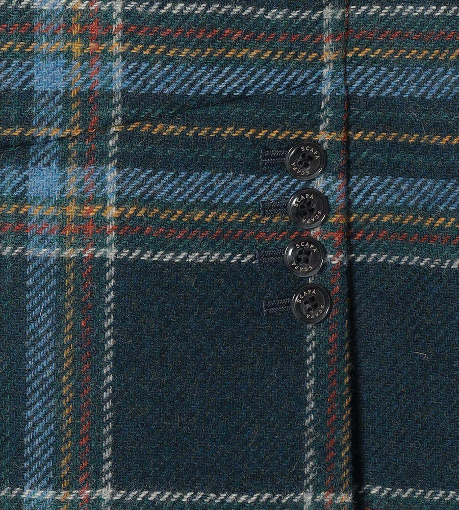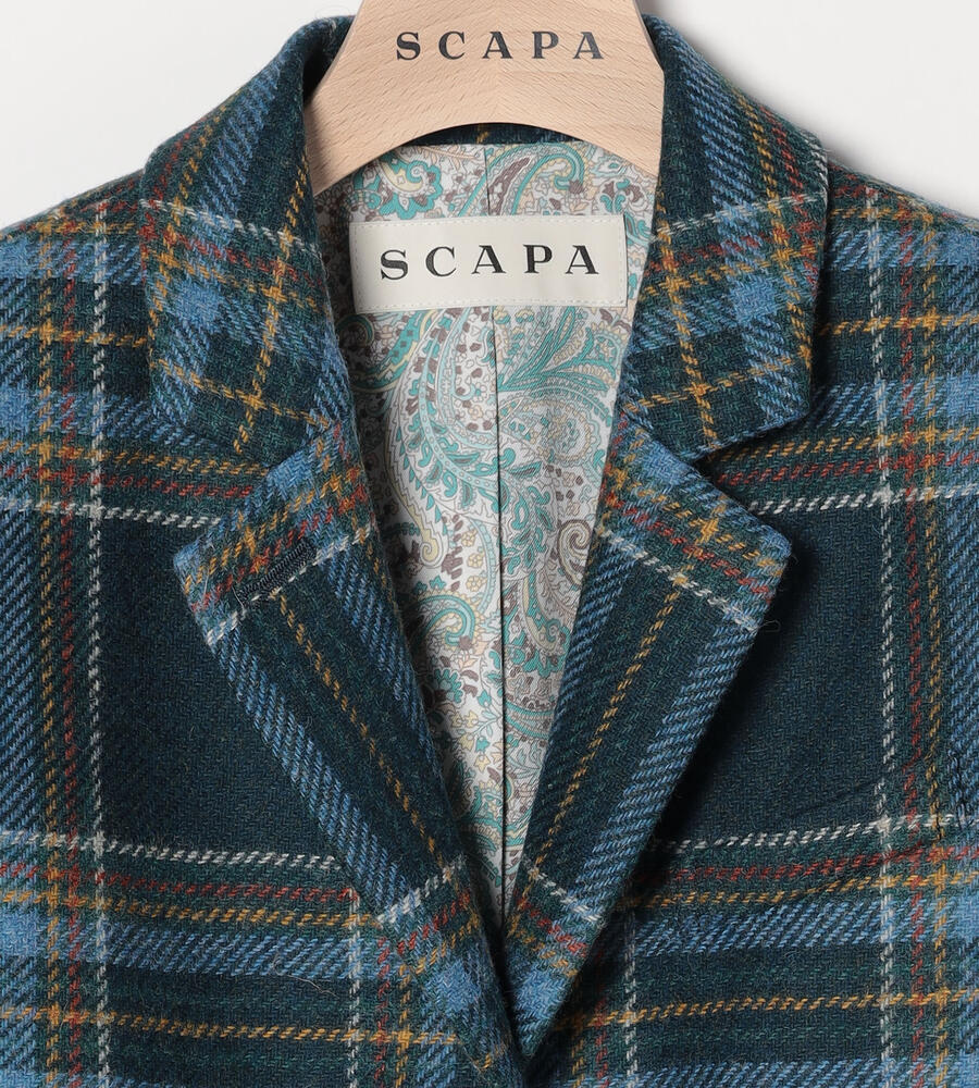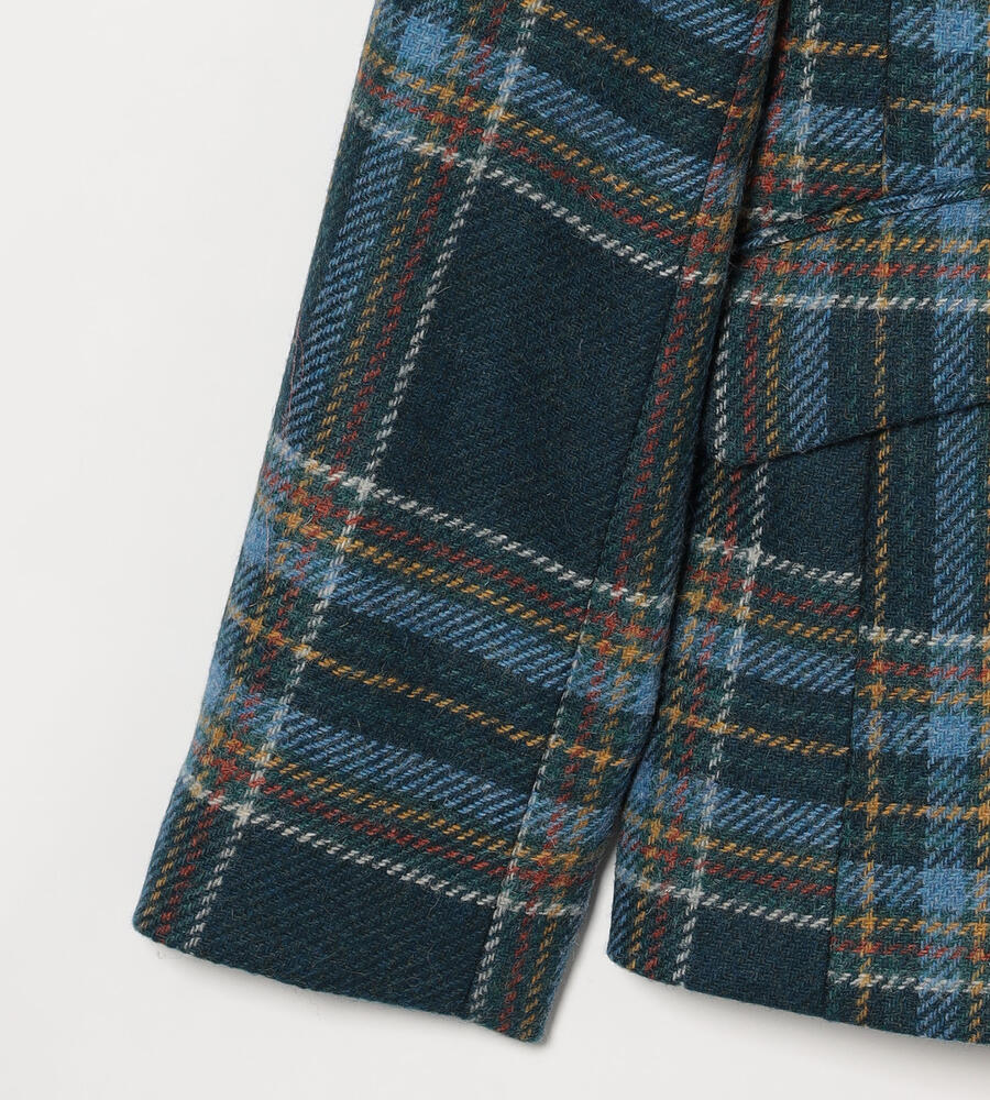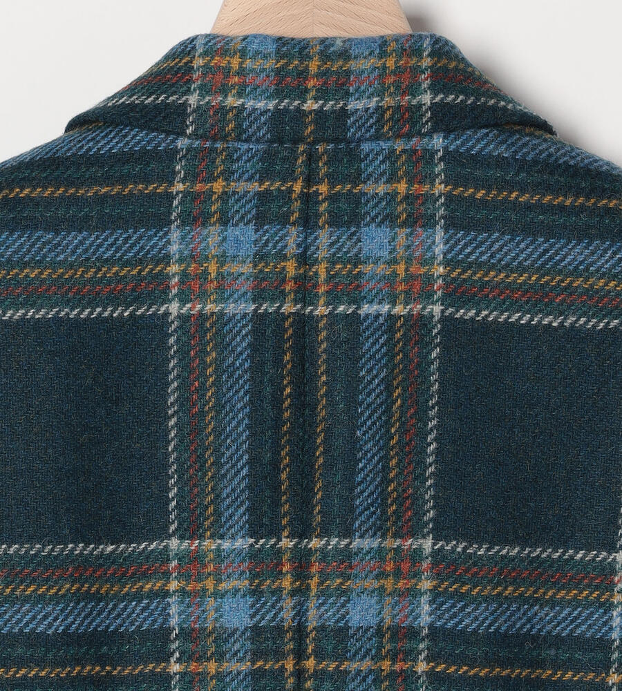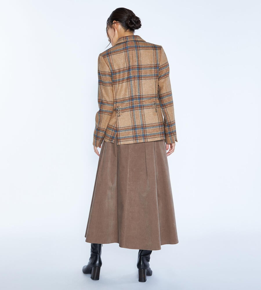 上質さとジェントルな空気感を併せ持つウール素材のチェック柄ジャケット。少し小ぶりなラペルや、上寄りに配置したボタンが、クラシカルな雰囲気を高めます。背面の中央寄りにインパーテッドプリーツを仕込み、後ろ姿を綺麗に見せる仕立て。同素材のスカートとのセットアップもお楽しみいただけます。