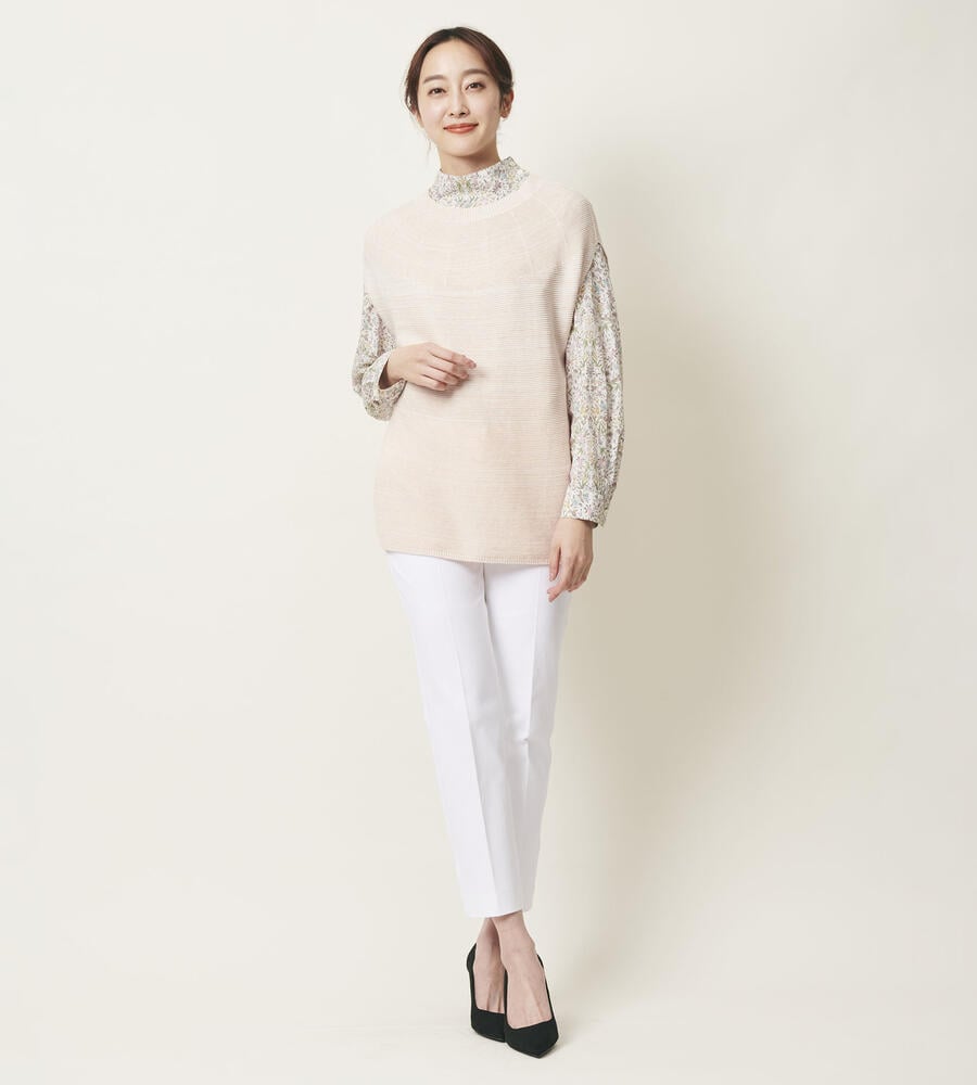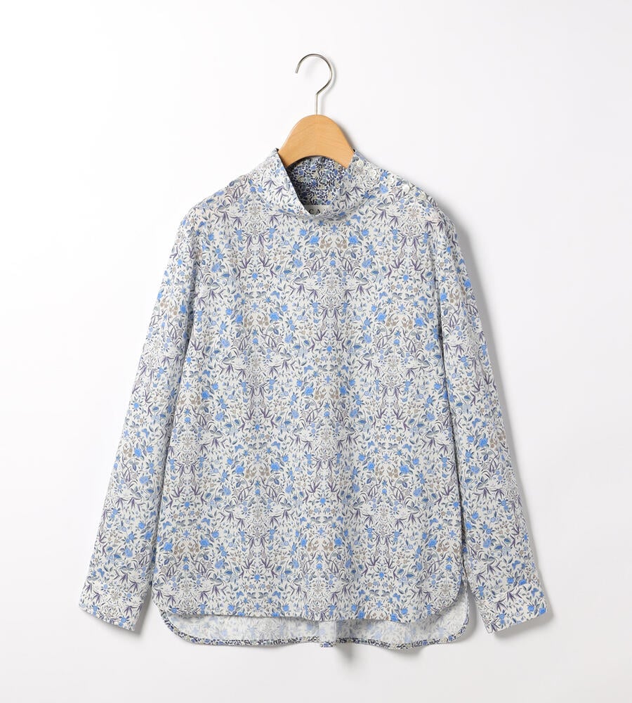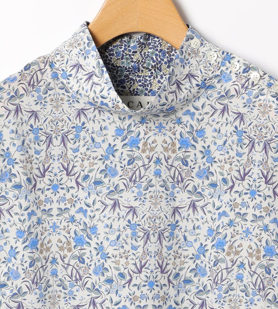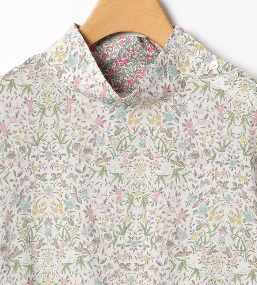 表情を明るく見せてくれる淡いカラーリングが美しい、リバティガーデンプリントのハイネックブラウス。左ショルダーのボタン使いがワンポイントに。サイドスリット、後ろ下りの着丈が今季らしいシルエット。大人フェミニンな雰囲気を纏いながらも上品にまとめられるのは、リバティプリントならでは。
