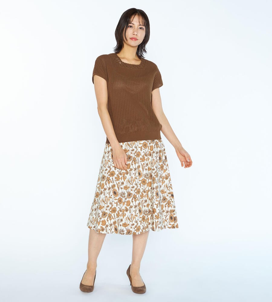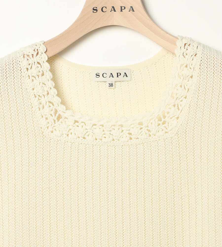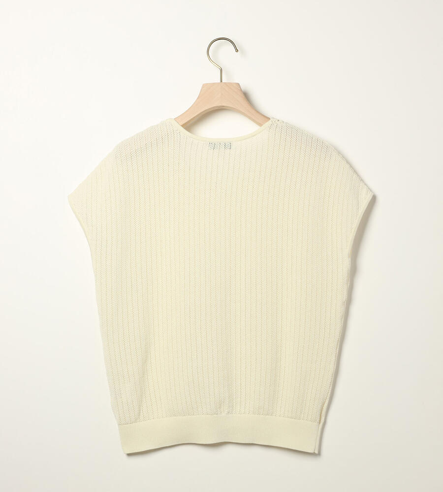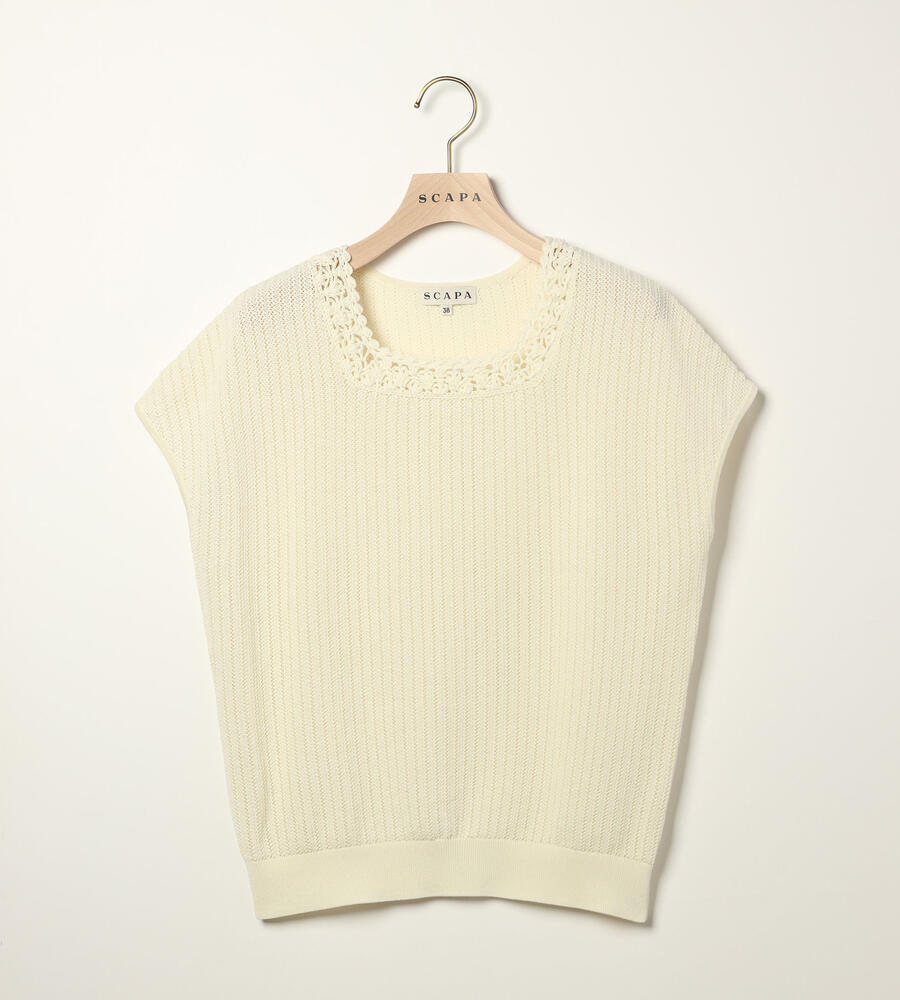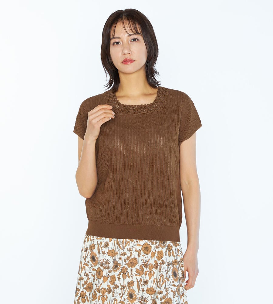 春夏シーズンにぴったりなフレンチスリーブニット。ローゲージに編まれた透け感のある涼やかなムードが特徴。首周りのレース編みがエレガントなデザインポイント。シンプルなデザインで様々なボトムとマッチ。お手持ちのボトムにプラスして、エレガントな雰囲気のコーディネートが実現するアイテムです。