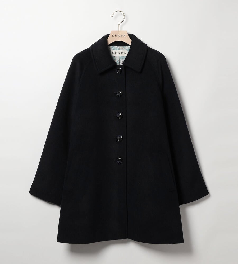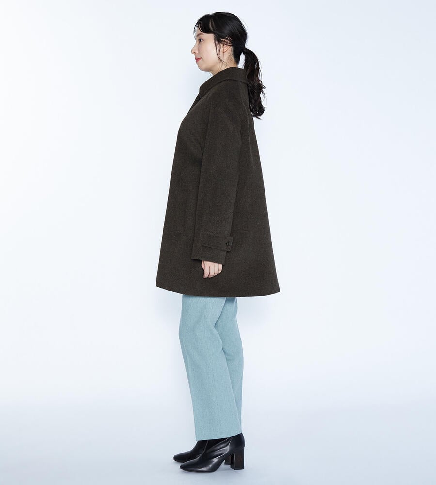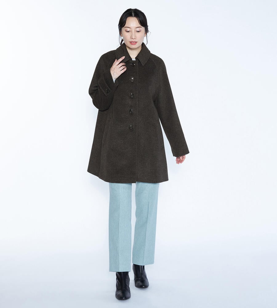 アンゴラとウール混合の生地で仕立てた、あたたかな肌触りのステンカラーコート。生地表面はビーバー仕上げを施し、やわらかな風合いが特徴。大きめの衿と裾に向かって広がるAラインのシルエットがフェミニンなデザインポイント。いつもの着こなしにプラスするだけで、エレガントなコーディネートが実現するアイテムです。