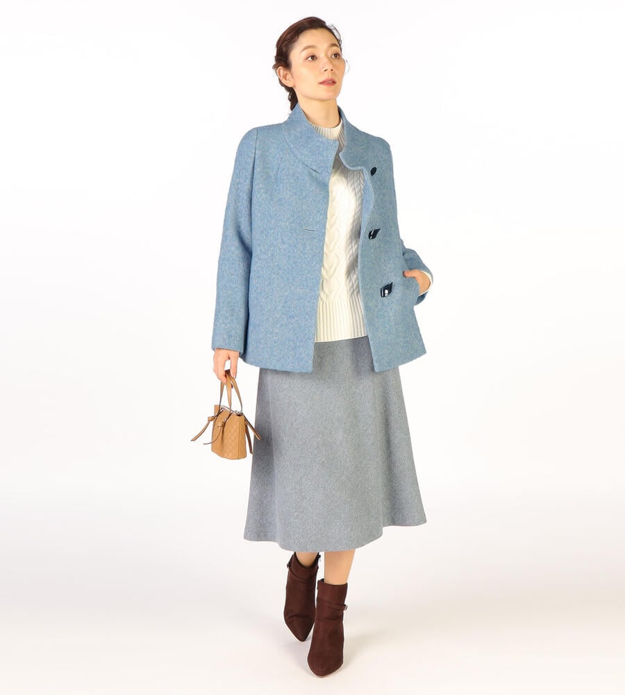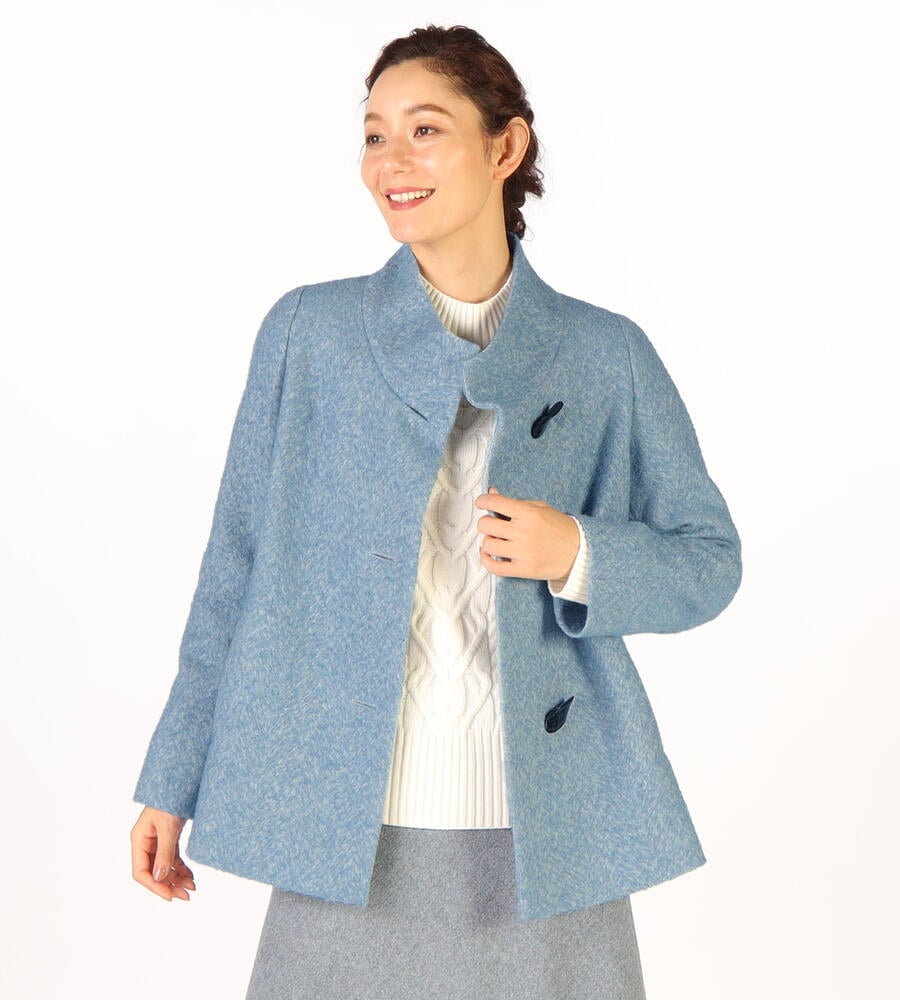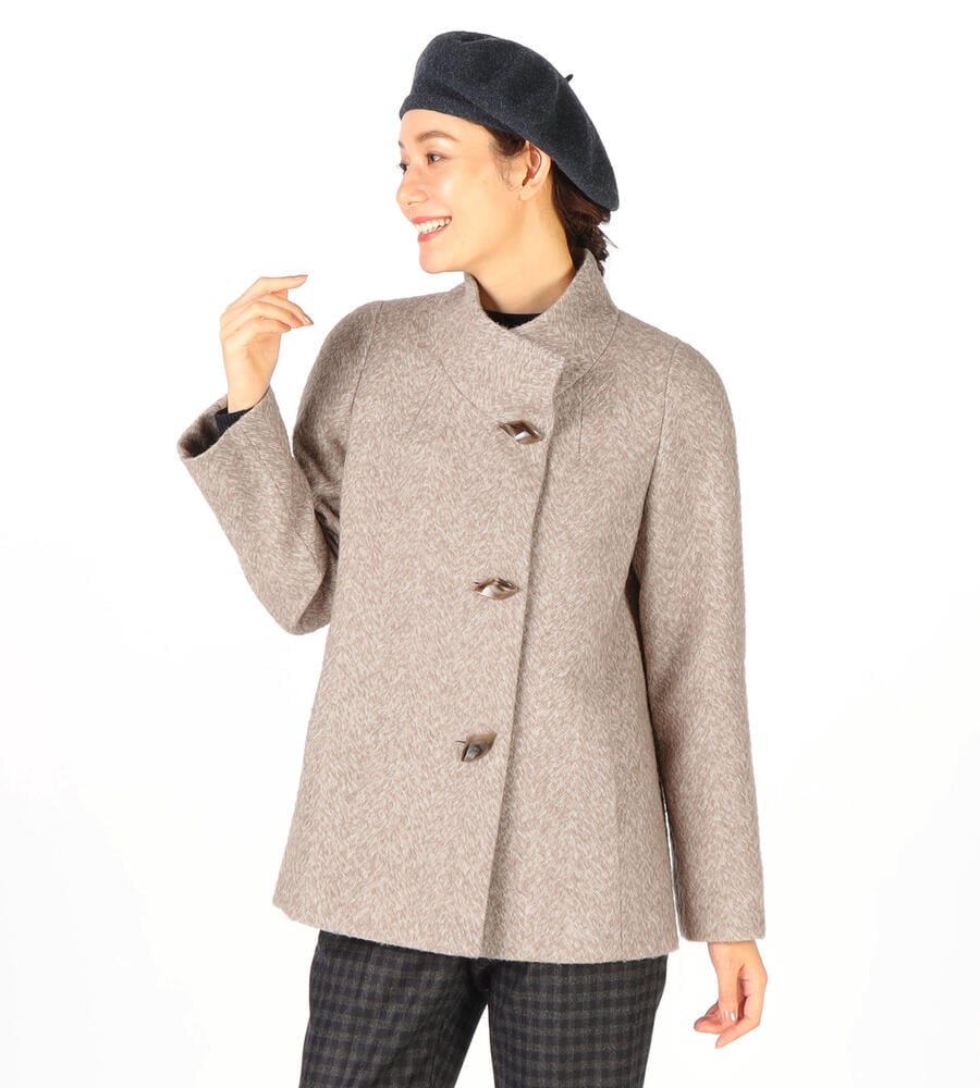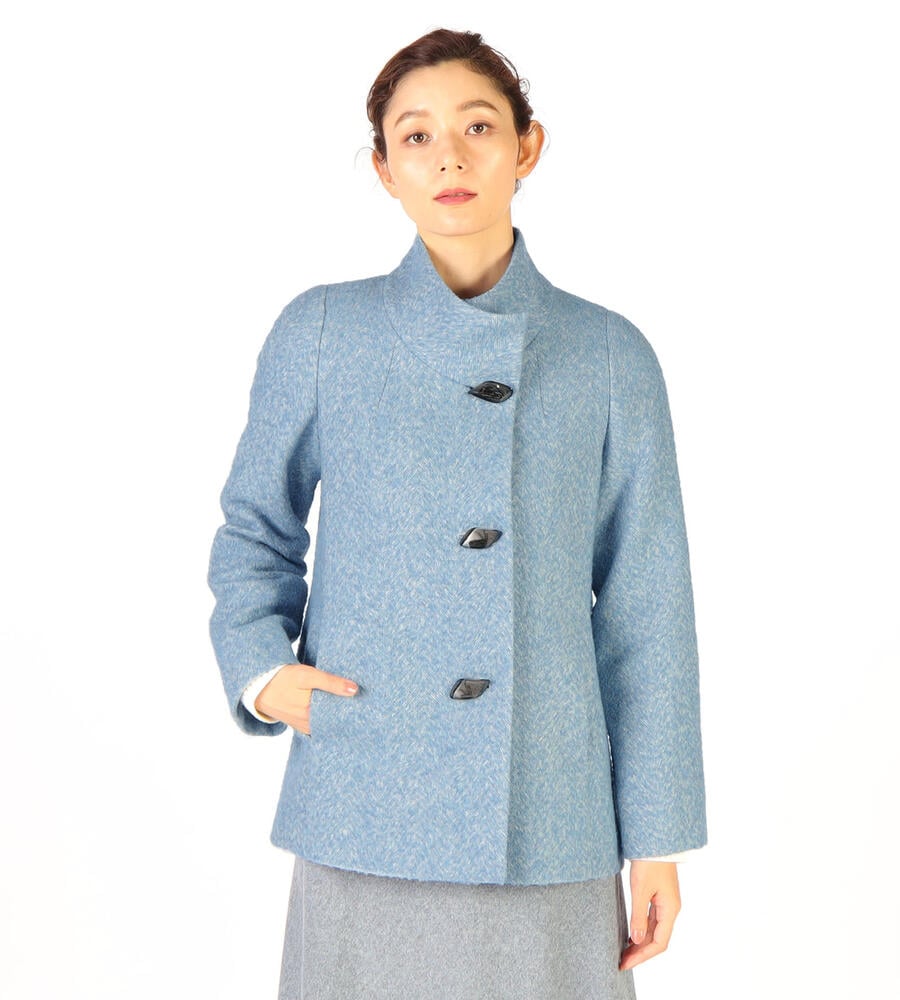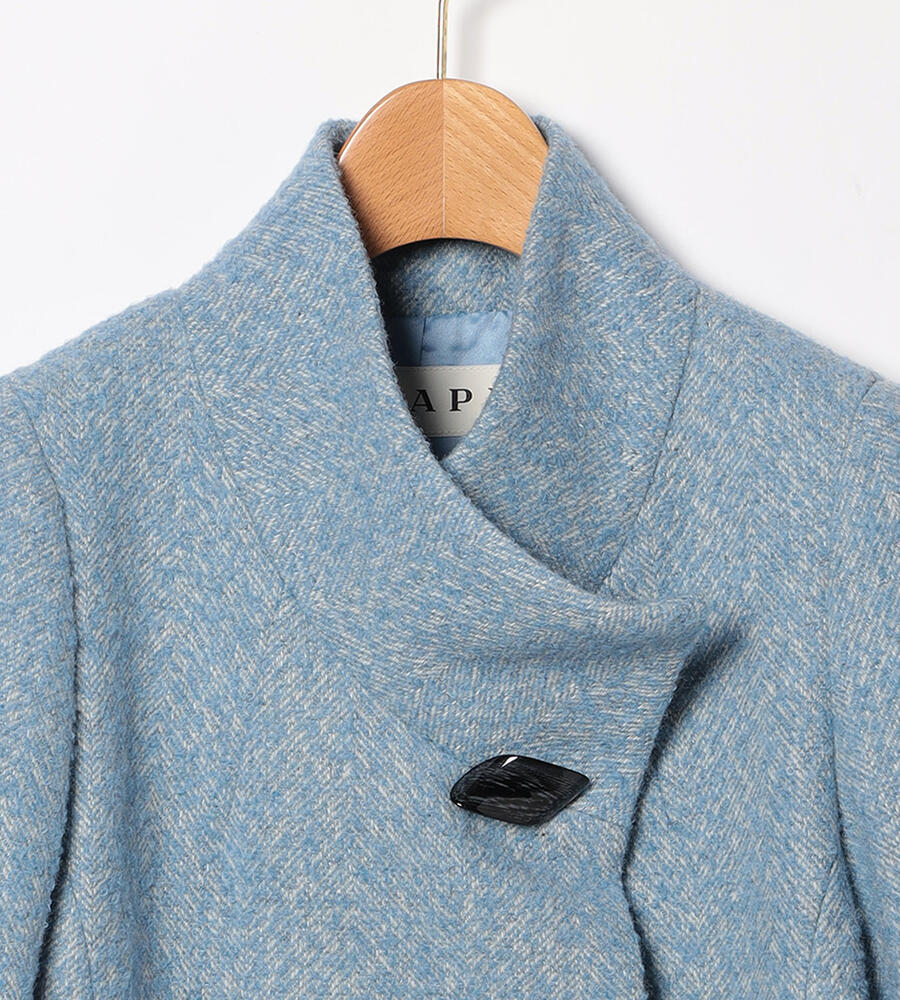 さっと羽織りやすいエアリーヘリンボーン生地のスタンドカラーのコート。立体的なひし形のボタンがおしゃれなデザインアクセント。立体的なパターン、裾に向かって広がるシルエットがフェミニンなムード。モード系からカジュアルまで、様々な着こなしにマッチするシンプルなデザインでデイリーに活躍します。