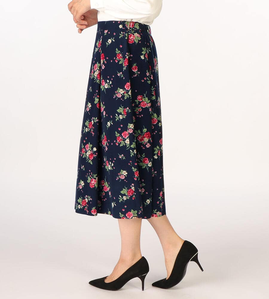 エレガントなタッチのエッセンシャルフラワープリント柄を全面に配した華やかなデザインのスカート。タック入りで立体感のある、フレアに広がるシルエットがフェミニンなポイント。後ろウエスト部分ゴム仕様ではき心地も快適。おしゃれなお出かけコーディネートが実現するアイテムです。