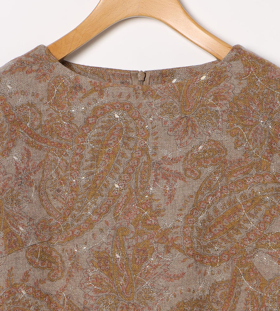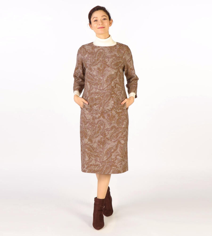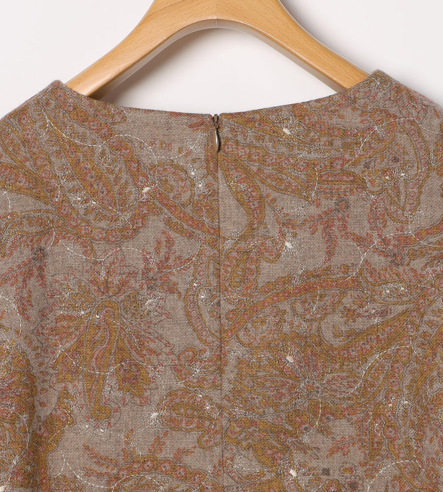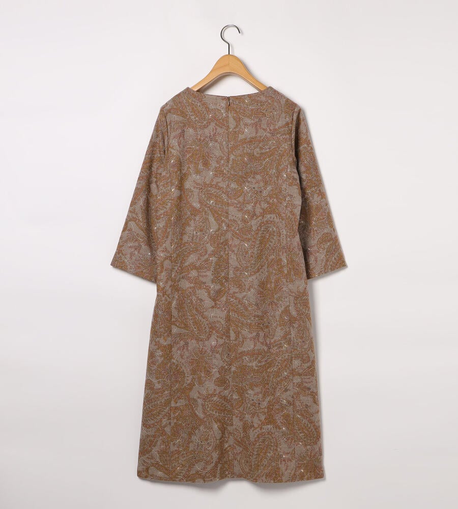 全面にプリントされたペイズリー柄にボタニカルモチーフのエンブロイダリー(刺繍)をあしらった、華やかデザインが印象的なワンピース。落ち着いたカラーリング、ゆとりのあるシルエットに膝下丈のレディなミモレ丈が特徴。一枚でシックなムードのお出かけコーディネートが完成する便利なアイテムです。