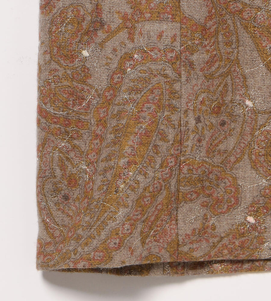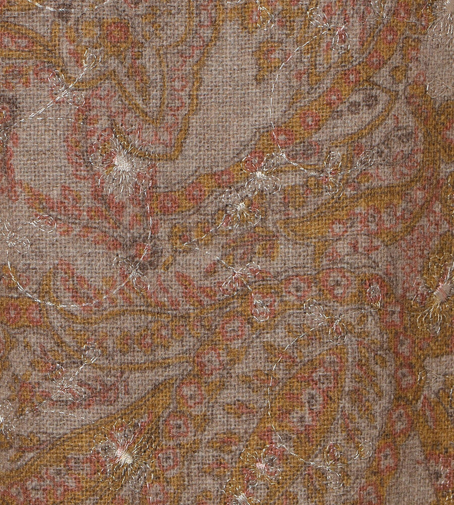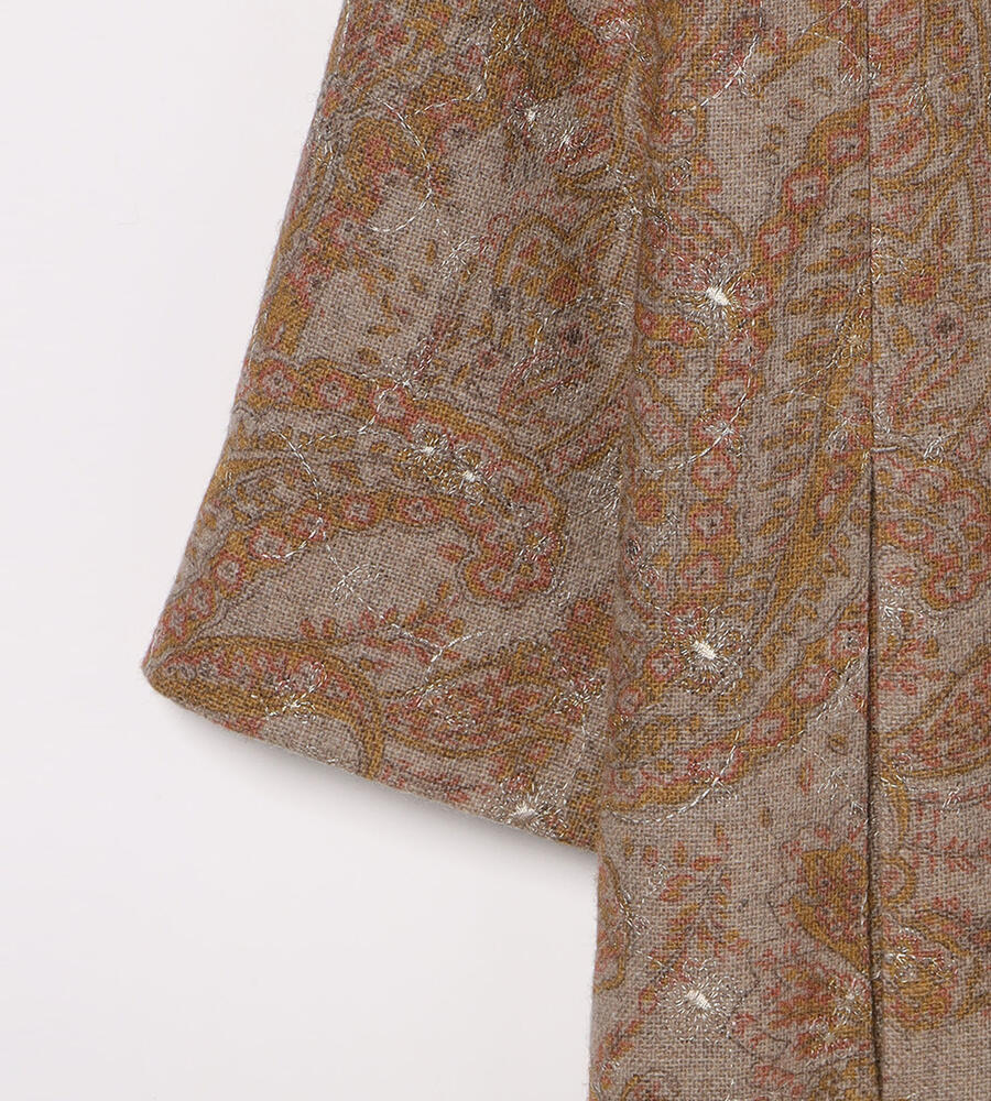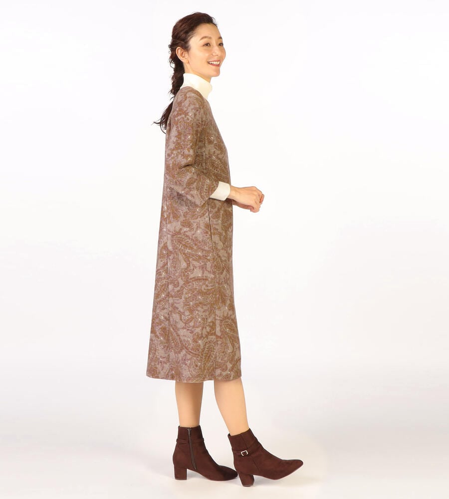 全面にプリントされたペイズリー柄にボタニカルモチーフのエンブロイダリー(刺繍)をあしらった、華やかデザインが印象的なワンピース。落ち着いたカラーリング、ゆとりのあるシルエットに膝下丈のレディなミモレ丈が特徴。一枚でシックなムードのお出かけコーディネートが完成する便利なアイテムです。