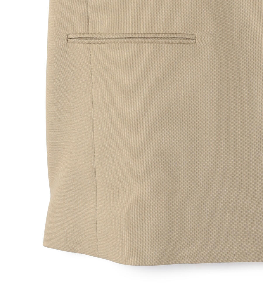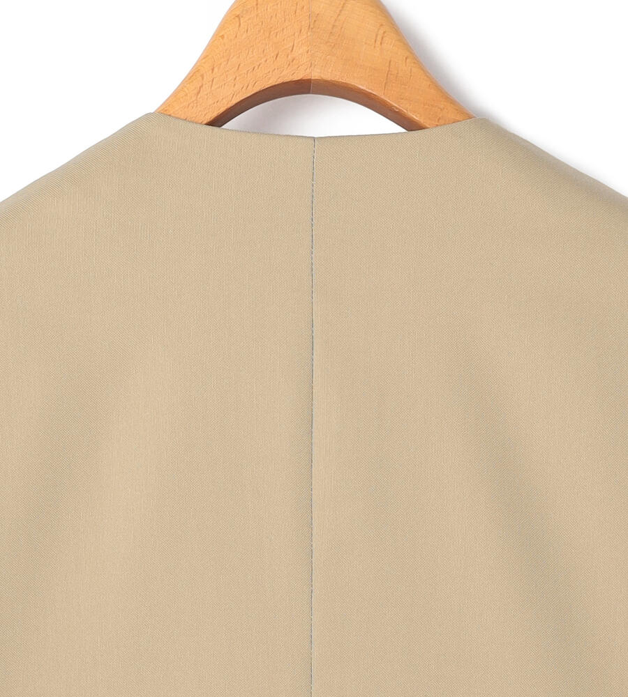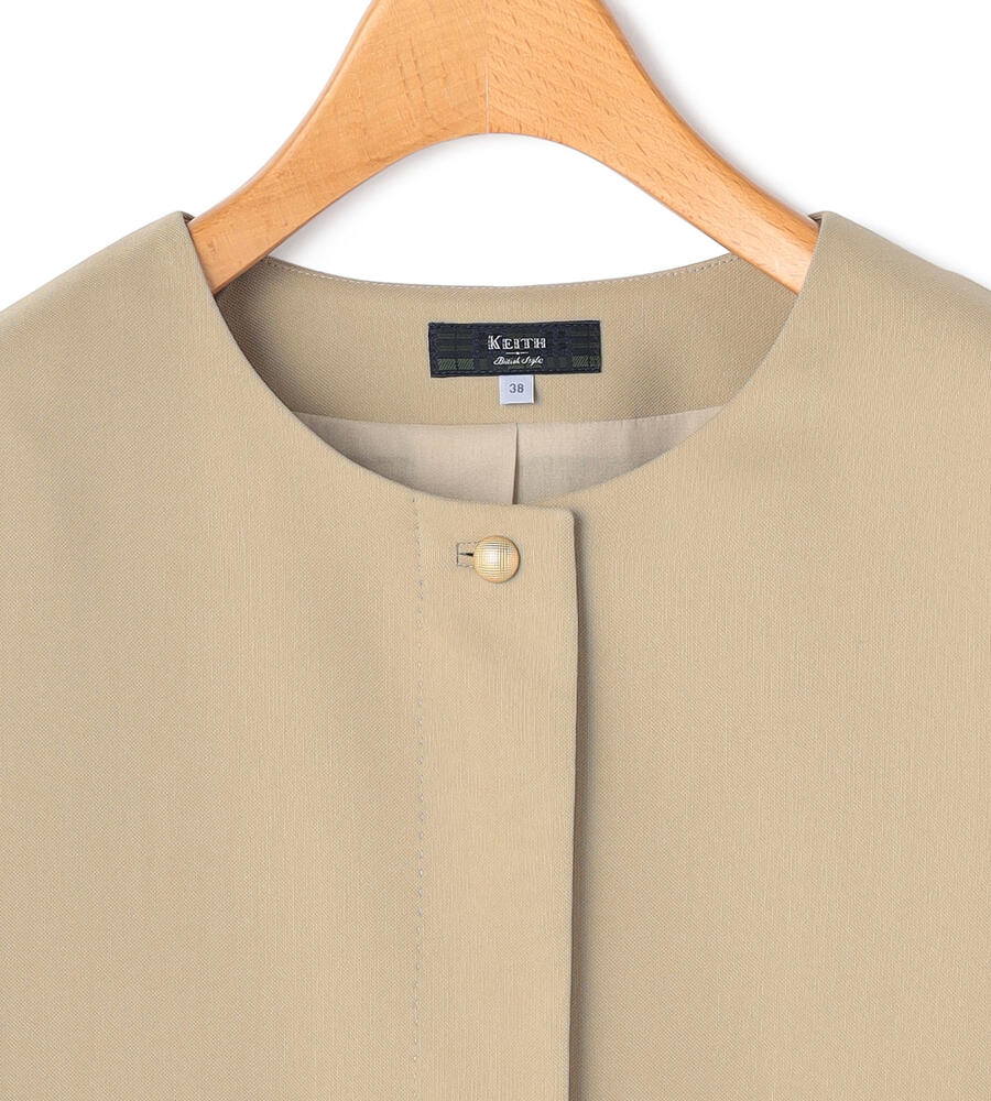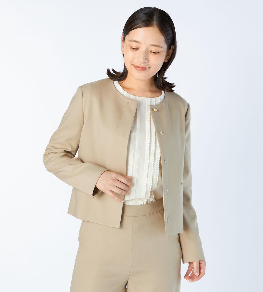 首もとのメタルボタンがワンポイントになったノーカラージャケット。顔まわりをすっきりと見せつつ、やわらかな雰囲気で羽織れるアイテムです。フロントはスナップボタン仕様、袖口にベンツを施し、左右にポケットを配置しています。同素材のスカート、パンツとセットアップでコーディネートが可能です。