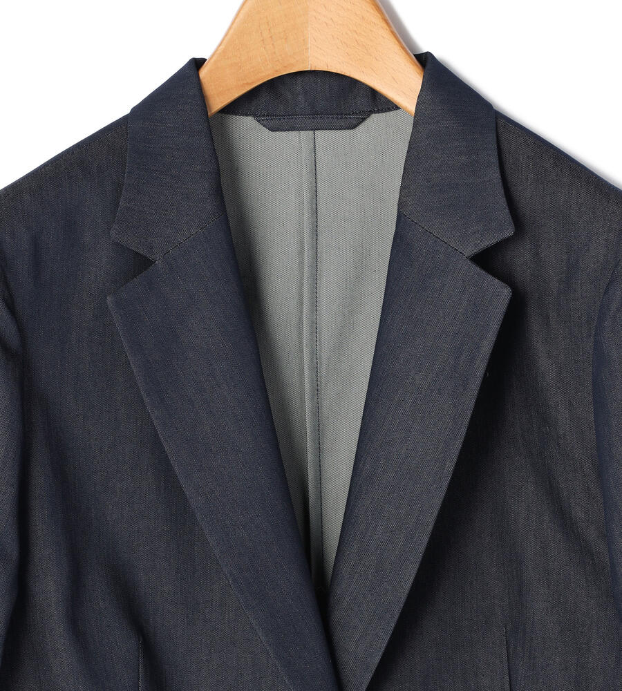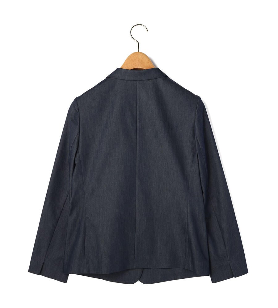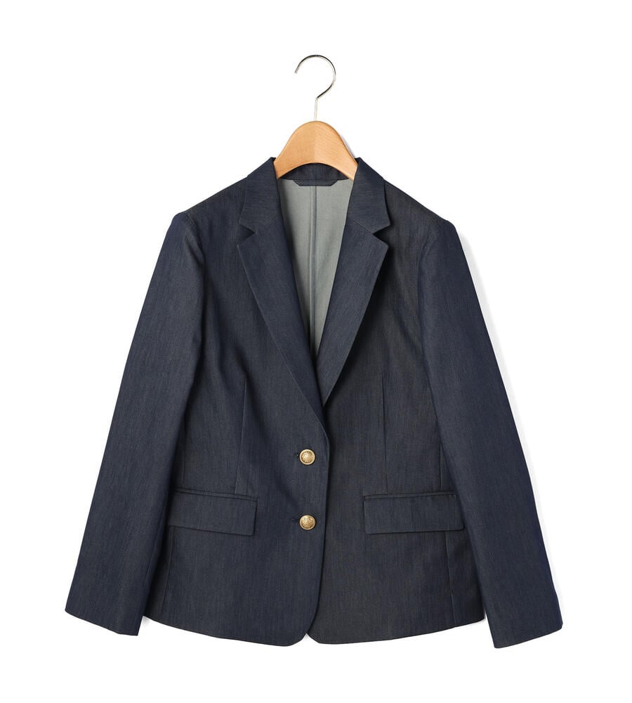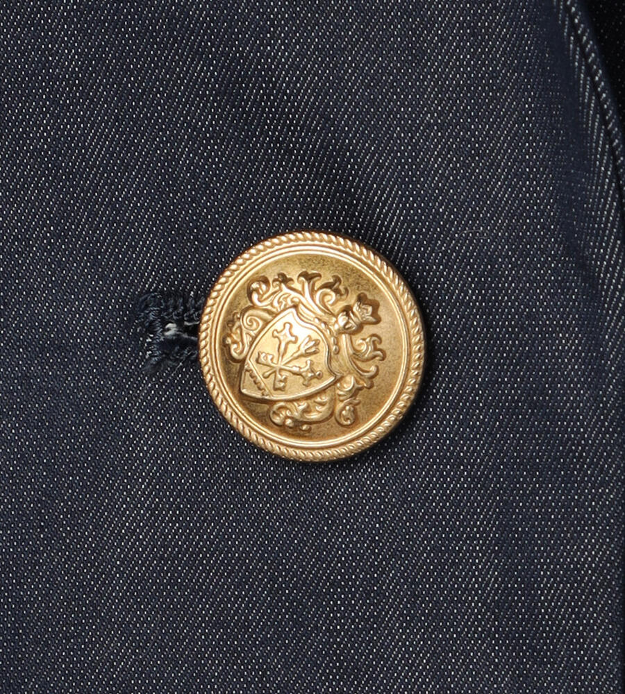 すっきりとしたレングスで、女性らしく着こなせるよう仕上げたテーラードジャケット。コットンポリエステルの軽やかなデニム地を使った一重仕立てで、動きやすく快適な着心地です。フロントはエンブレム入りの金ボタンを用いることで、トラッドなエッセンスをプラスしています。オンオフ兼用でき、ワードローブに一着あると便利な羽織です。