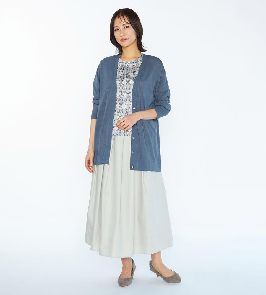 透け感のある薄手のハイゲージニットで仕立てたロング丈カーディガン。深めのVネックとリラックス感のあるシルエットを特徴としたシンプルなデザインです。カジュアル、きれいめ問わず、どんなコーディネートとも相性の良い万能アイテム。電車や職場、カフェなど、夏場の冷房対策にもおすすめです。