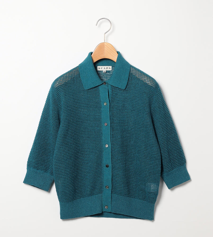 リネンのメッシュニットを用いたカーディガンです。襟を添えていることで、ラフになりすぎずエレガントな印象に仕上げた1点。発色の綺麗なニットは春夏のスタイリングのアクセントに最適です。ウエストをリブで絞っているためメリハリのあるシルエットを演出。スカートなどを合わせると気品のある着こなしが完成します。