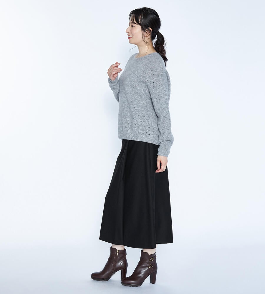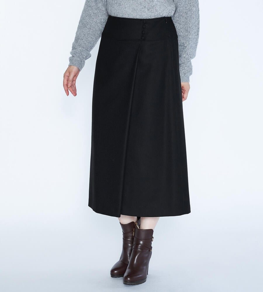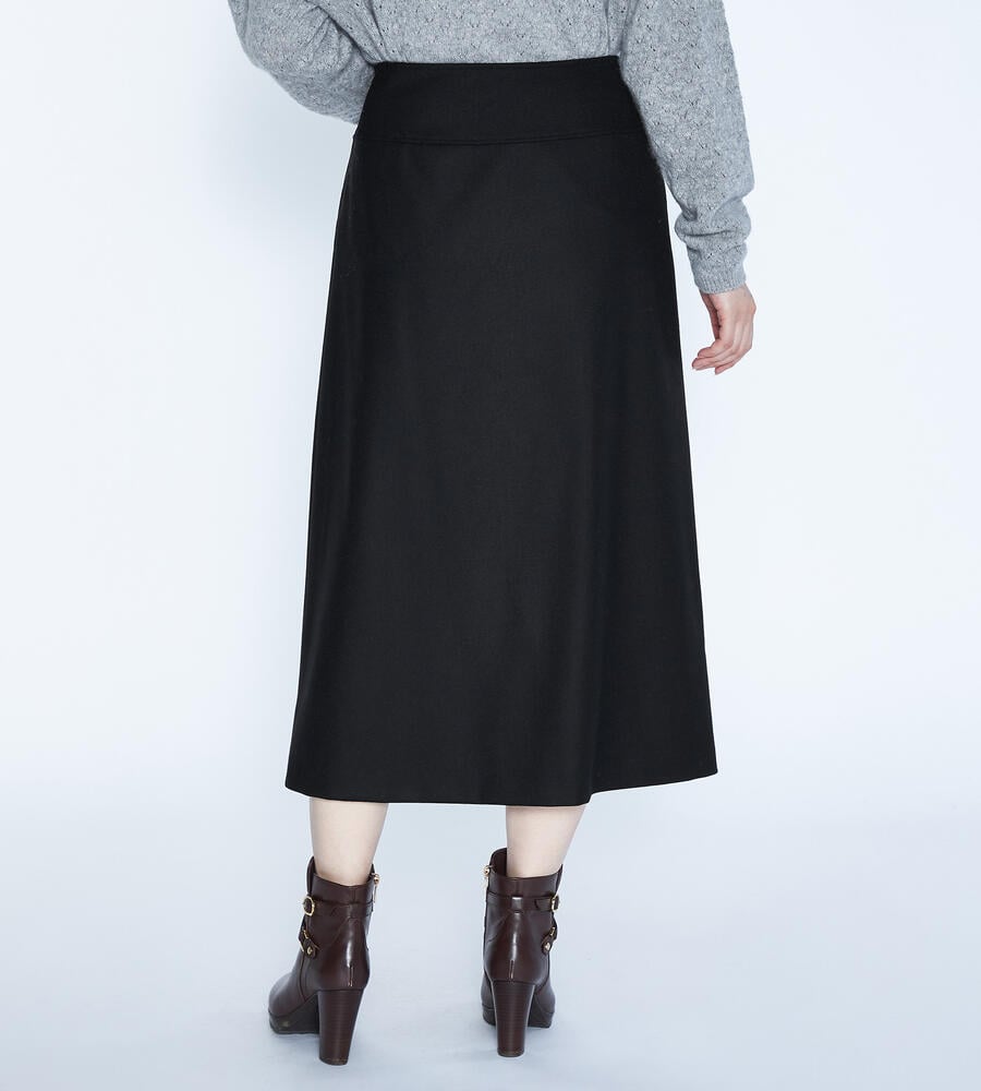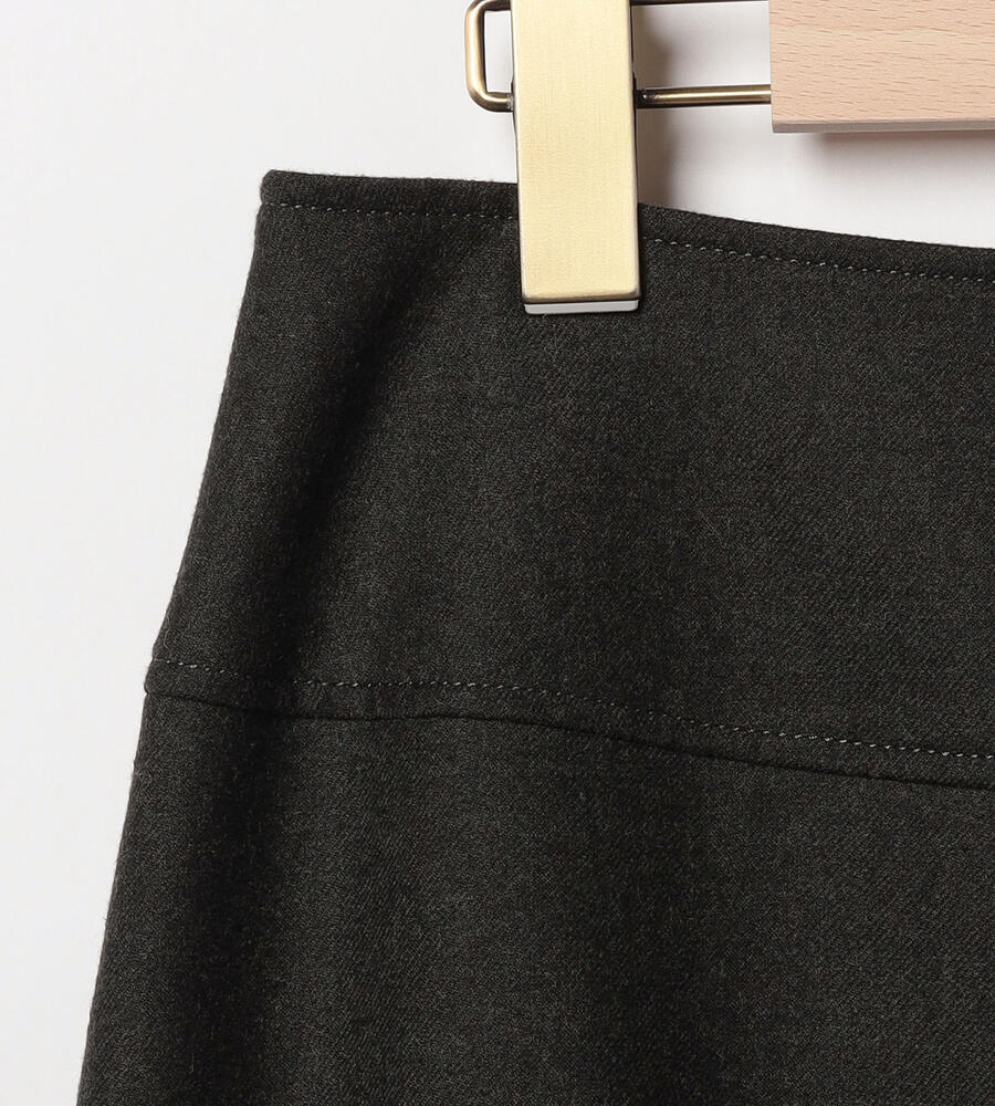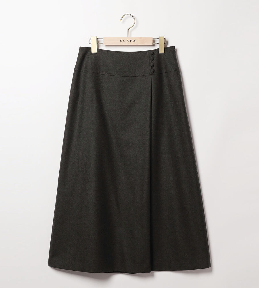 軽く、あたたかでソフトな肌触りが魅力のフラノウール生地で仕立てたスカート。身体の動きにフィットし、ストレスフリーな履き心地のストレッチ素材なのも特徴。フロントの巻きスカート風のデザインアクセントとウエストのくるみボタンがおしゃれなポイント。エレガントなコーディネートが決まるアイテムです。
