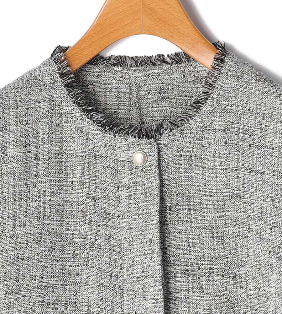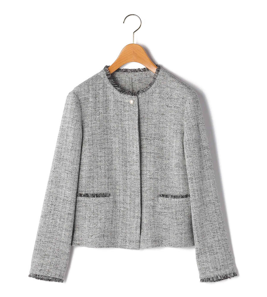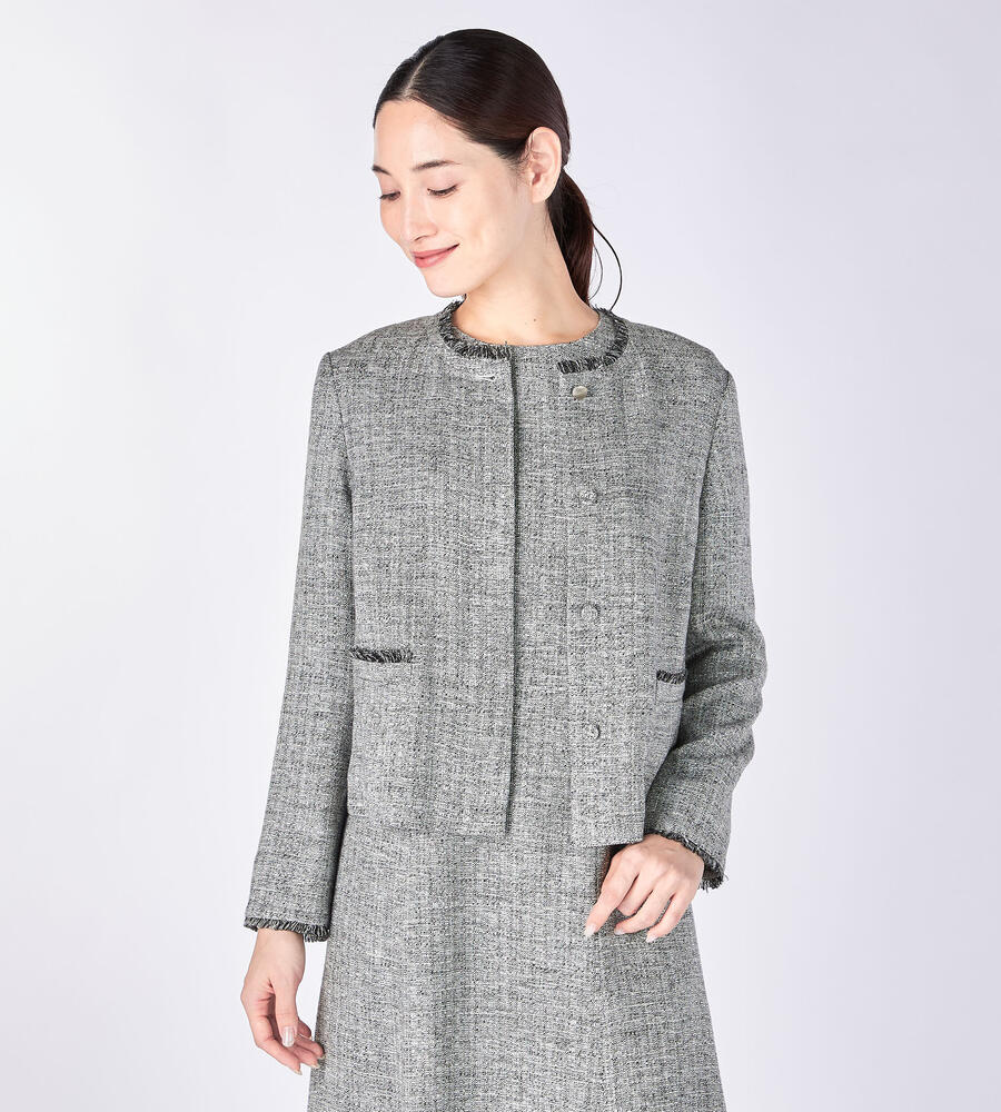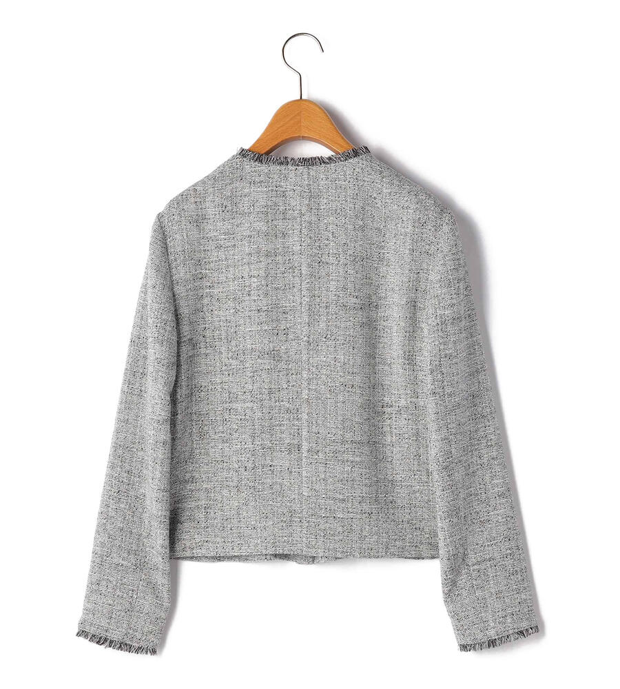 首まわり、ポケットと袖口にあしらわれたフリンジがデザインポイントになったスプリングツィードジャケット。フロントを閉じて着る際、一番上のボタン以外は比翼仕立てで隠しすっきりとした印象に仕上げました。同素材のワンピースやスカートをご用意。セットアップとしても着こなしていただけます。