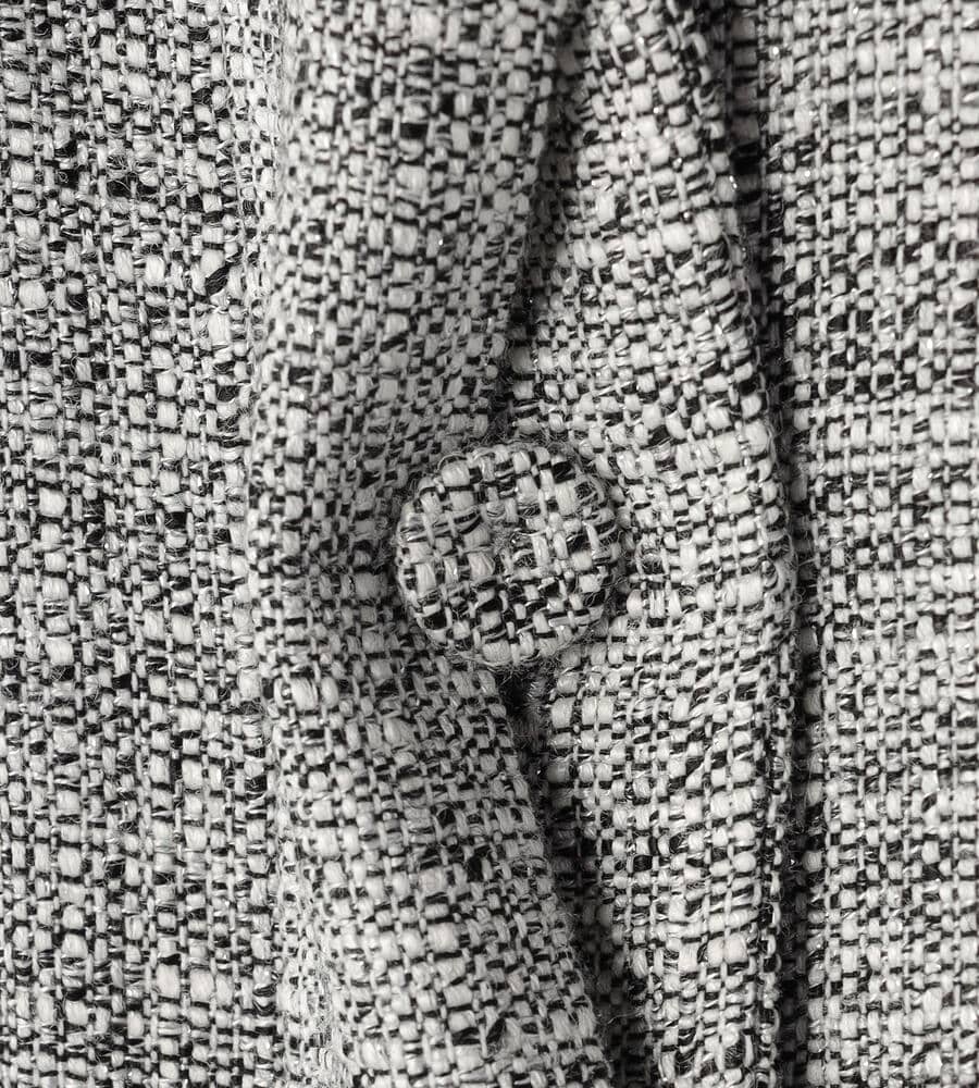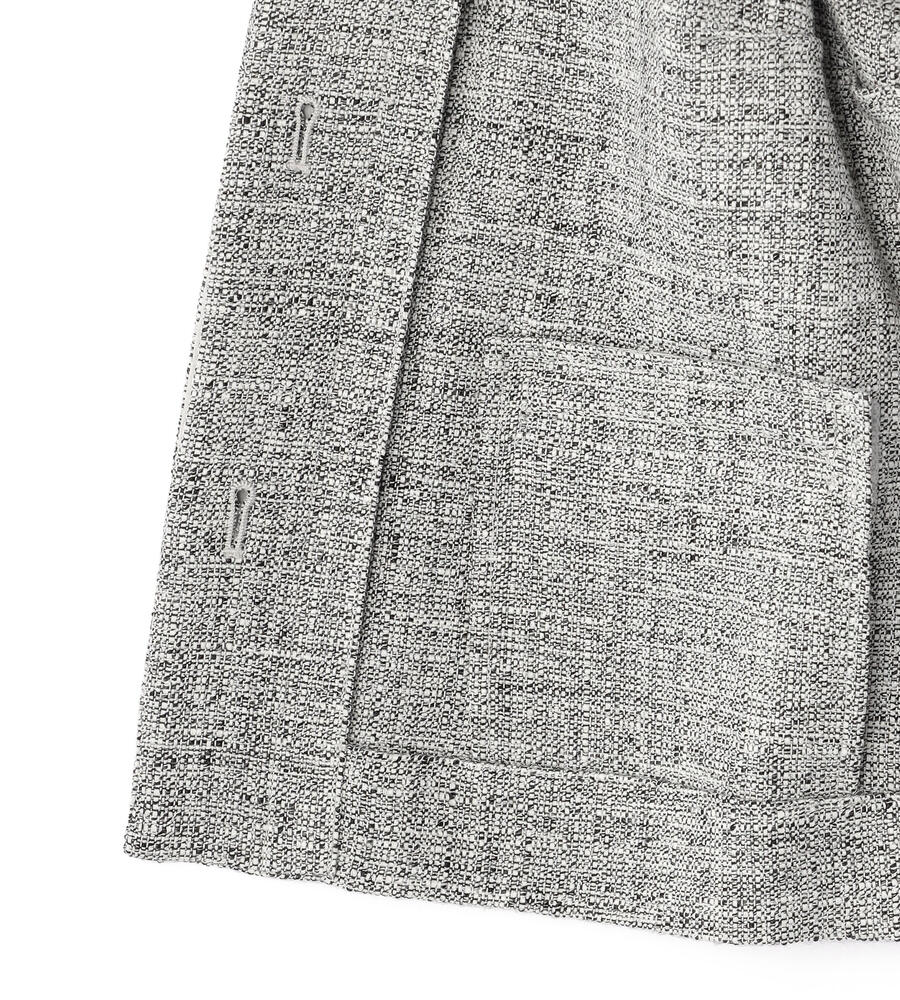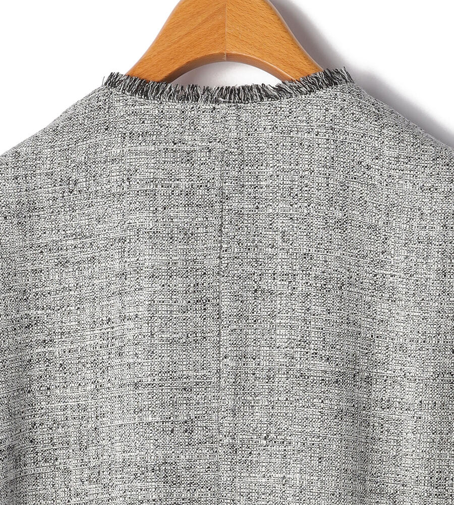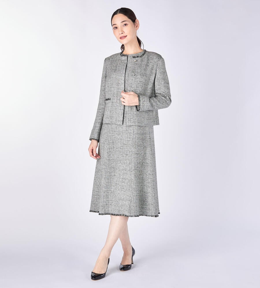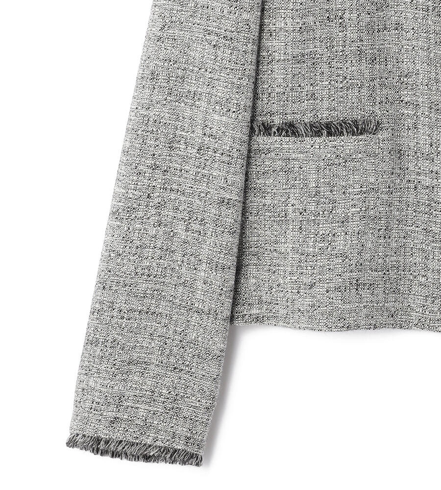首まわり、ポケットと袖口にあしらわれたフリンジがデザインポイントになったスプリングツィードジャケット。フロントを閉じて着る際、一番上のボタン以外は比翼仕立てで隠しすっきりとした印象に仕上げました。同素材のワンピースやスカートをご用意。セットアップとしても着こなしていただけます。