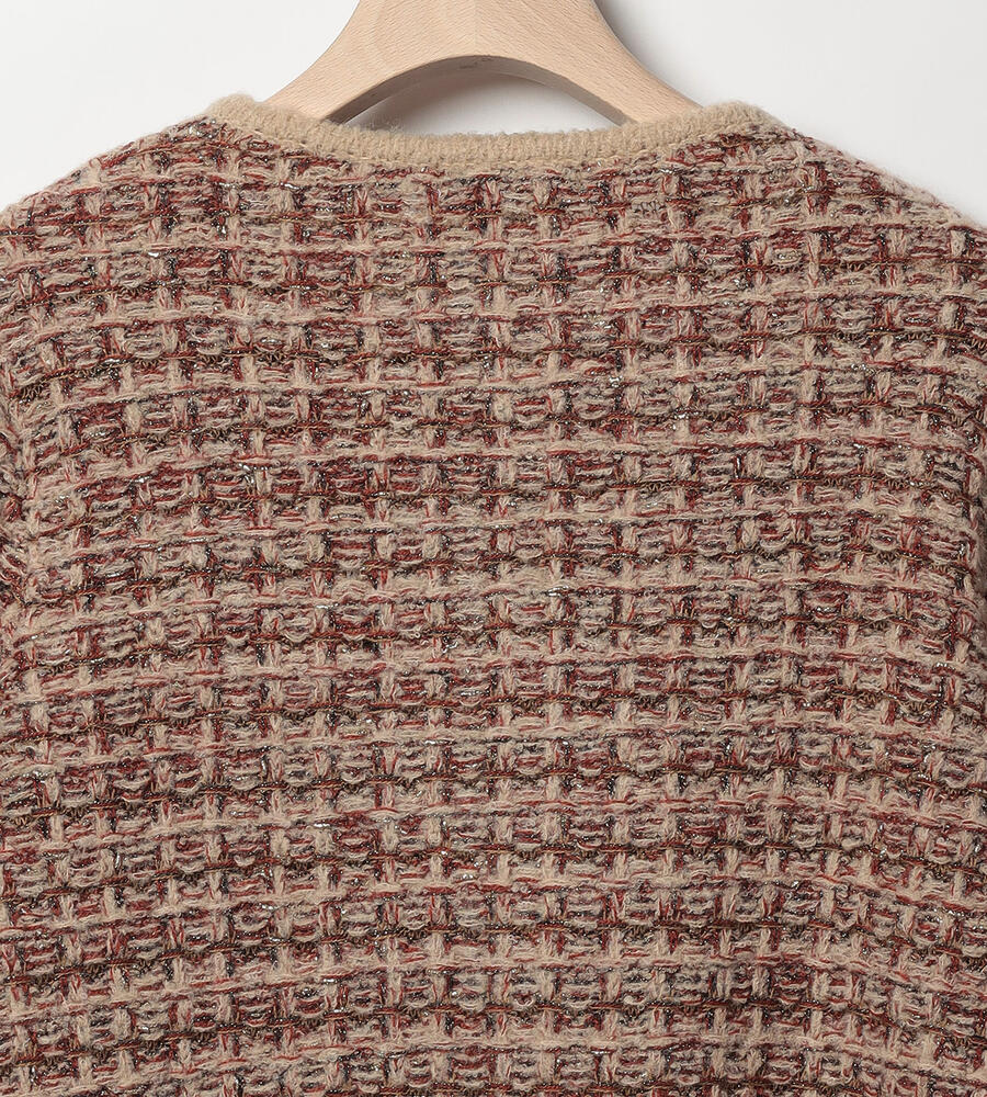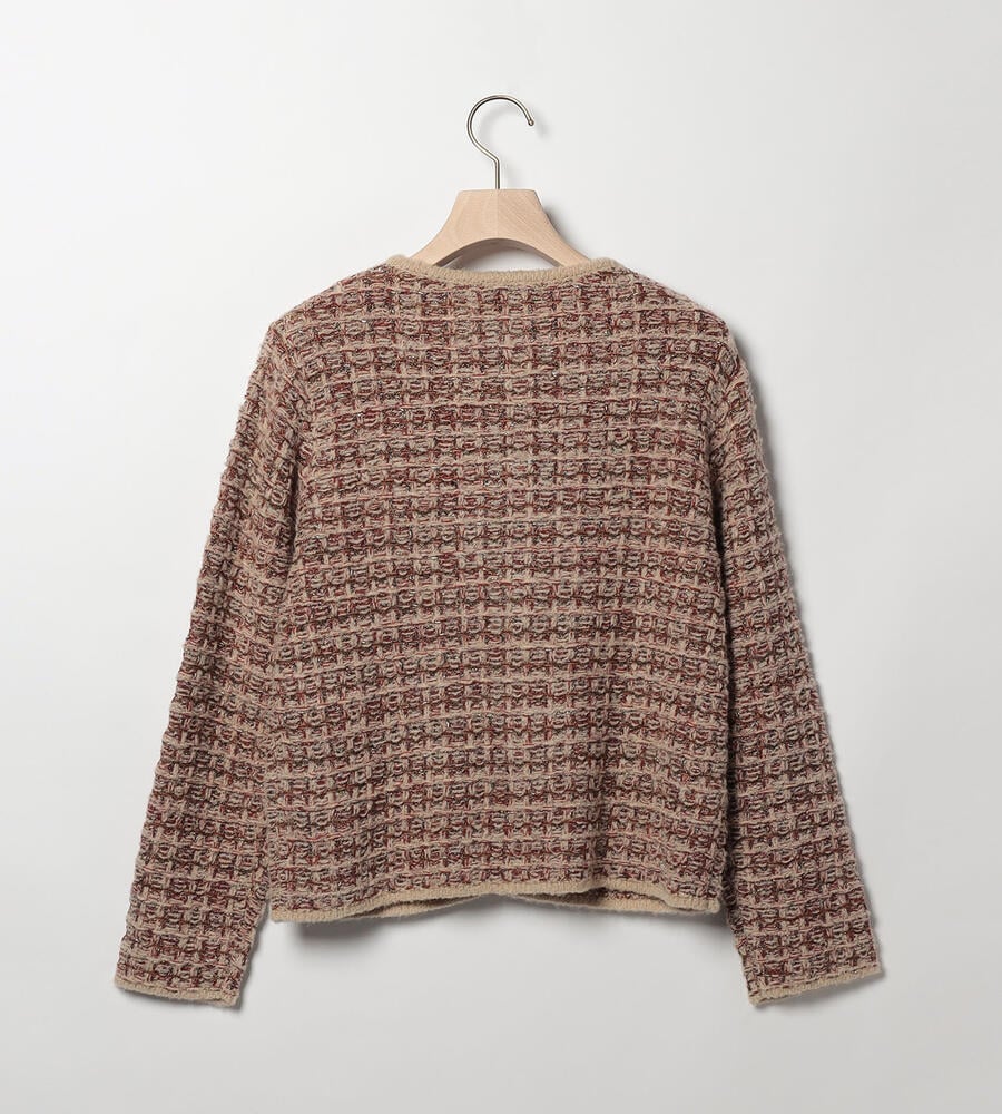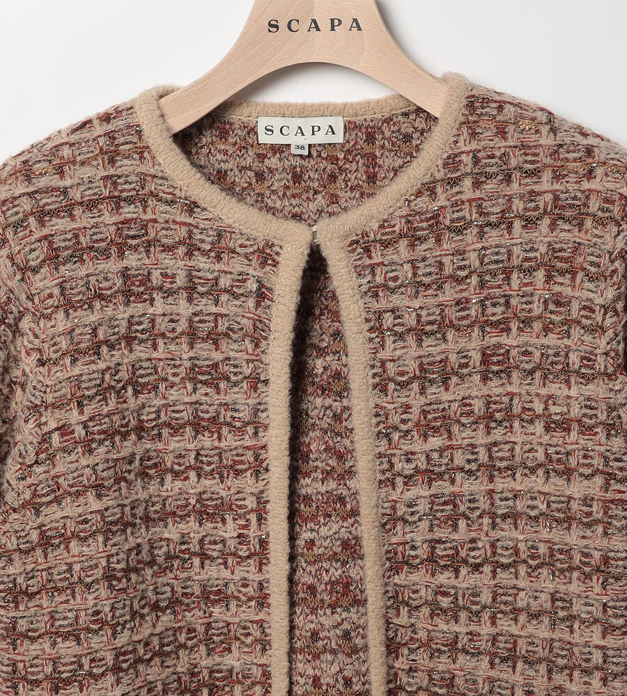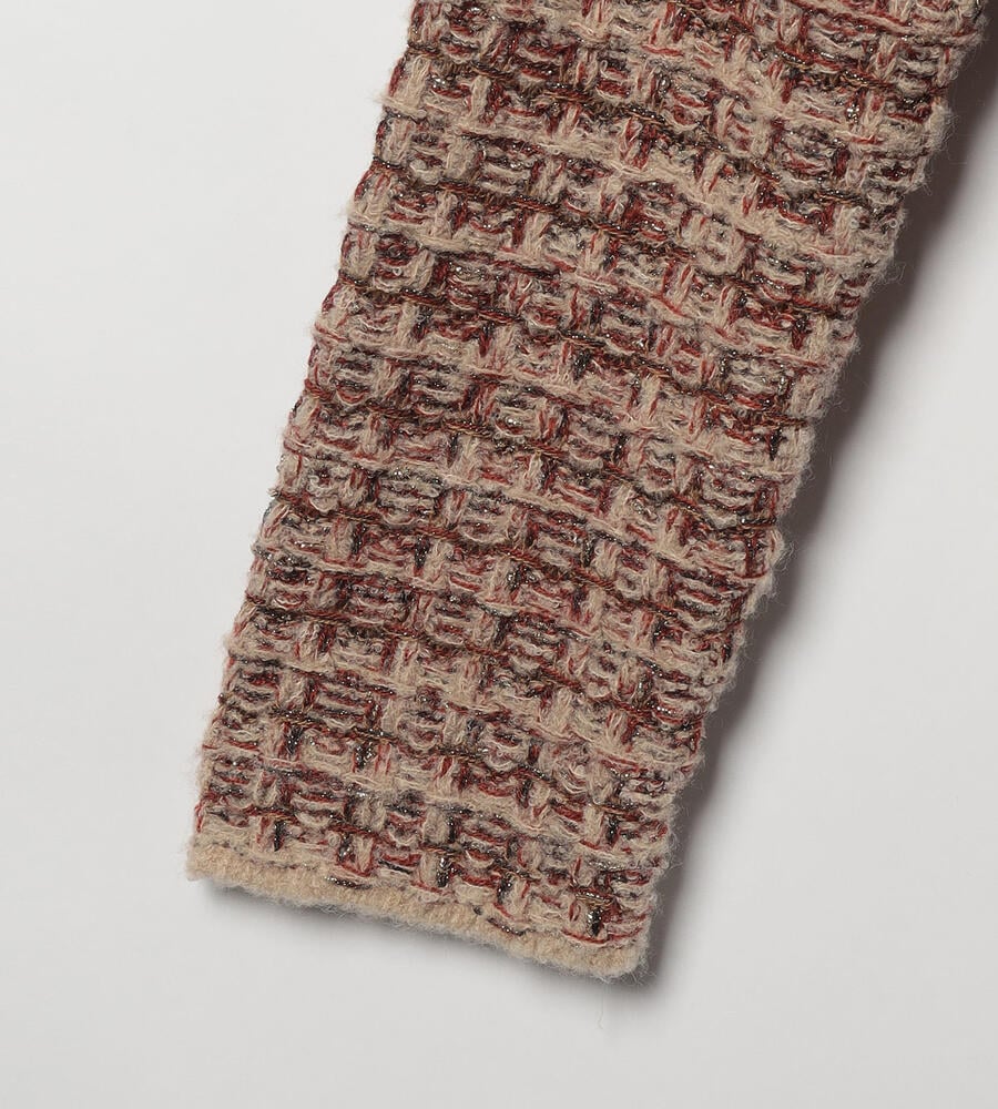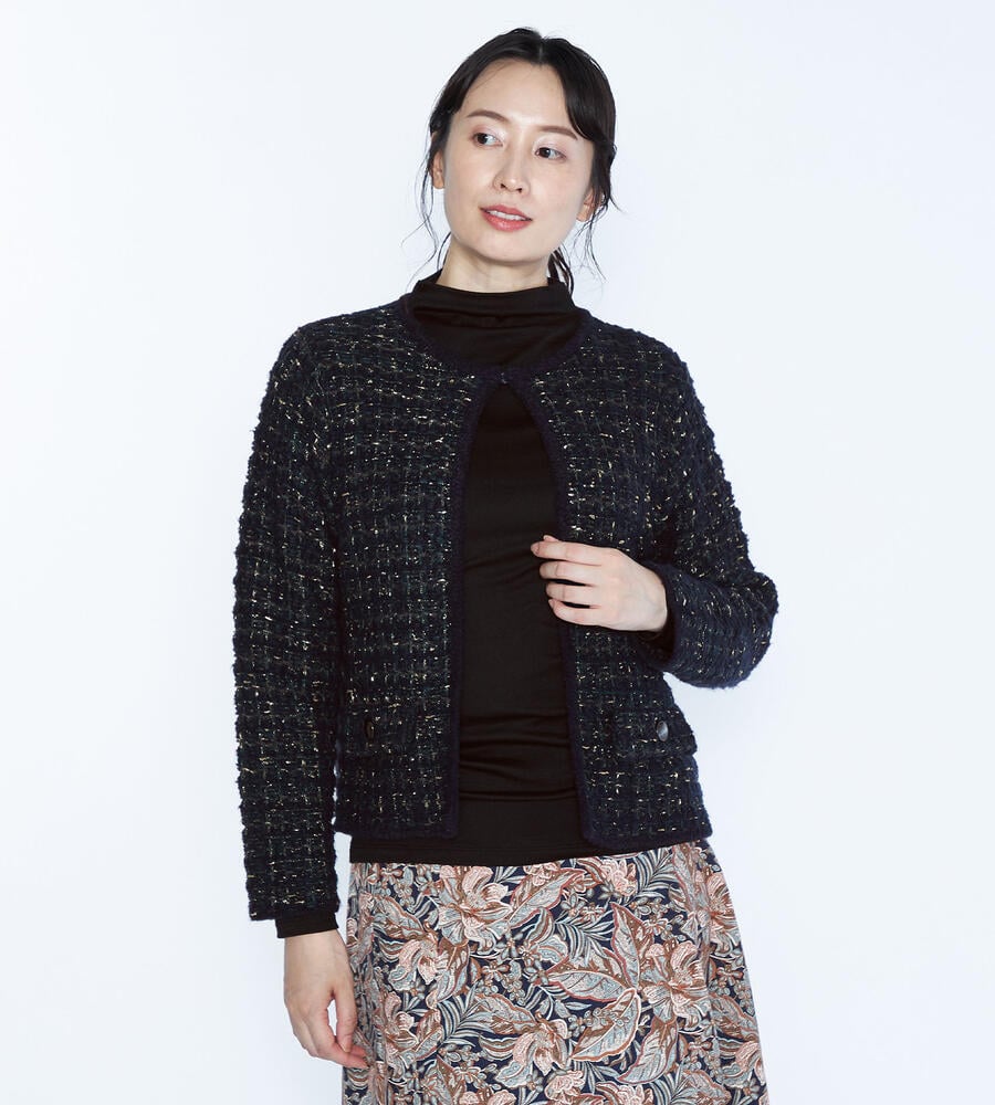 まるでツイードのような気品を持つニット素材で仕立てたジャケット。ノーカラー仕立てにすることで、大人らしいエレガントな印象を高めています。仄かなラメが煌めくニット素材は、華やかさもひとしお。タートルネックトップスやボウブラウスなどを合わせると、より品格のあるスタイリングを楽しめます。