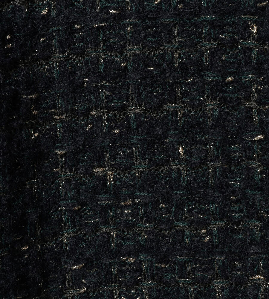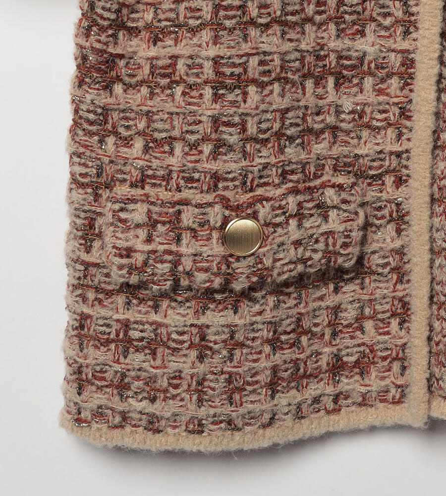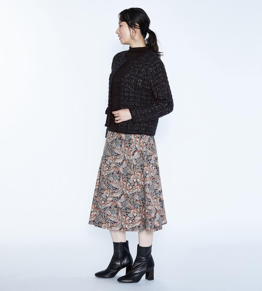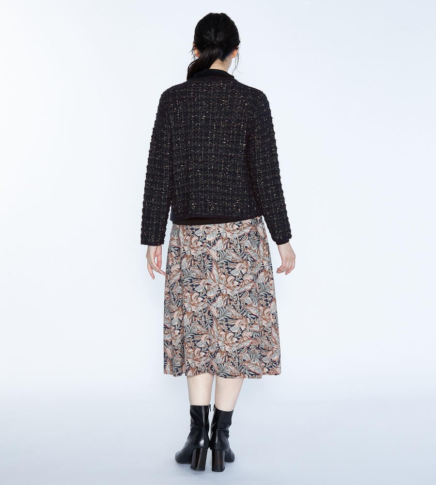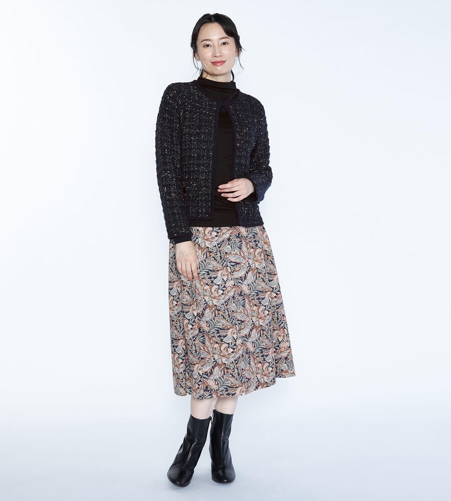 まるでツイードのような気品を持つニット素材で仕立てたジャケット。ノーカラー仕立てにすることで、大人らしいエレガントな印象を高めています。仄かなラメが煌めくニット素材は、華やかさもひとしお。タートルネックトップスやボウブラウスなどを合わせると、より品格のあるスタイリングを楽しめます。