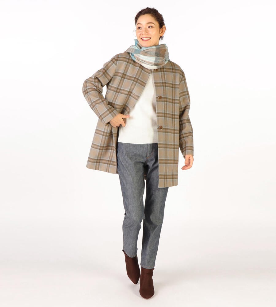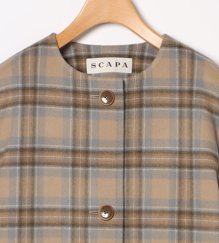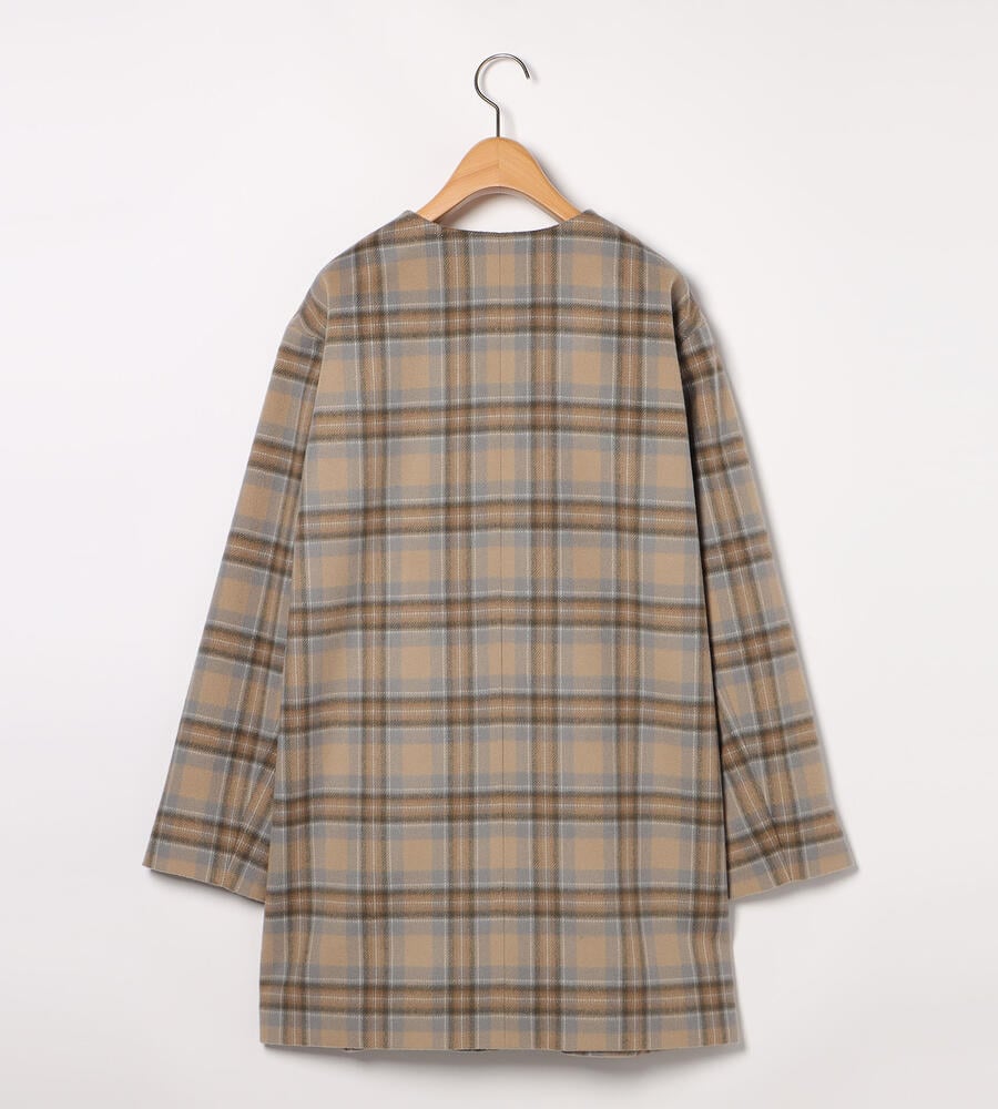 コーディネートのアクセントになるトラディショナルチェック柄のコート。ウール生地の秋冬シーズンらしいあたたかな素材感。ノーカラーのすっきりとした首回りが特徴。ブランドロゴ入りのボタンなど細部までこだわりを感じるデザインディテール。スタイリッシュなお出かけコーディネートが完成するアイテムです。