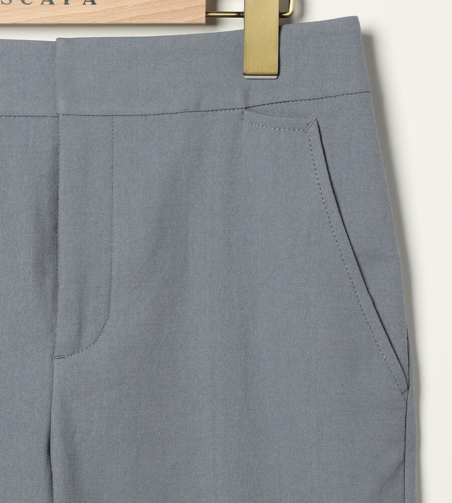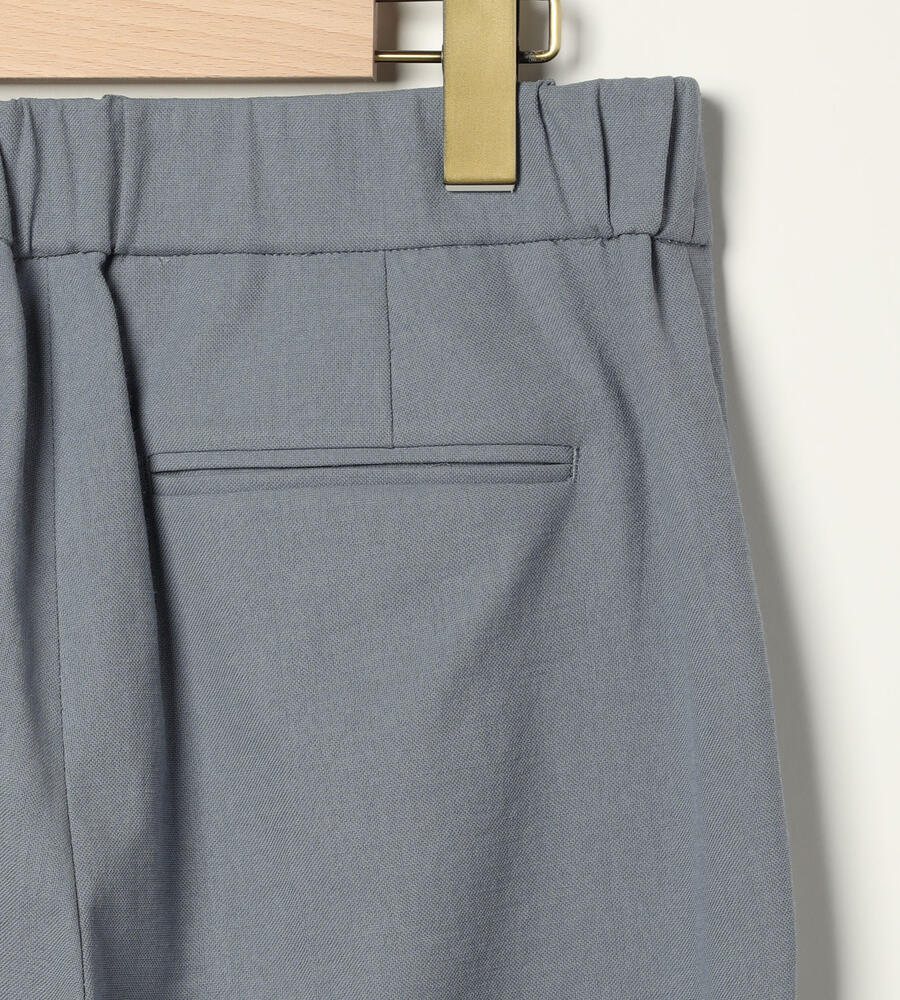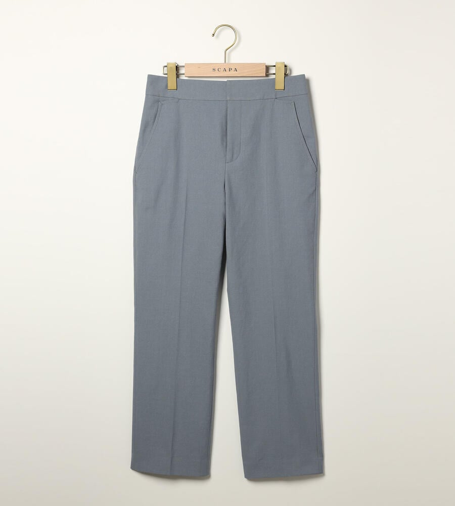 ドライタッチなオックス生地を用いたクロップド丈パンツ。テーパードシルエットとセンタープレスが脚をシャープに演出し、短めの丈が足元に女性らしい抜け感をプラスします。ウエストはフロントをすっきりとさせ、バックをゴム仕様にして快適な着用感に。シンプルで着回しやすく、オンオフ兼用で幅広く活躍します。