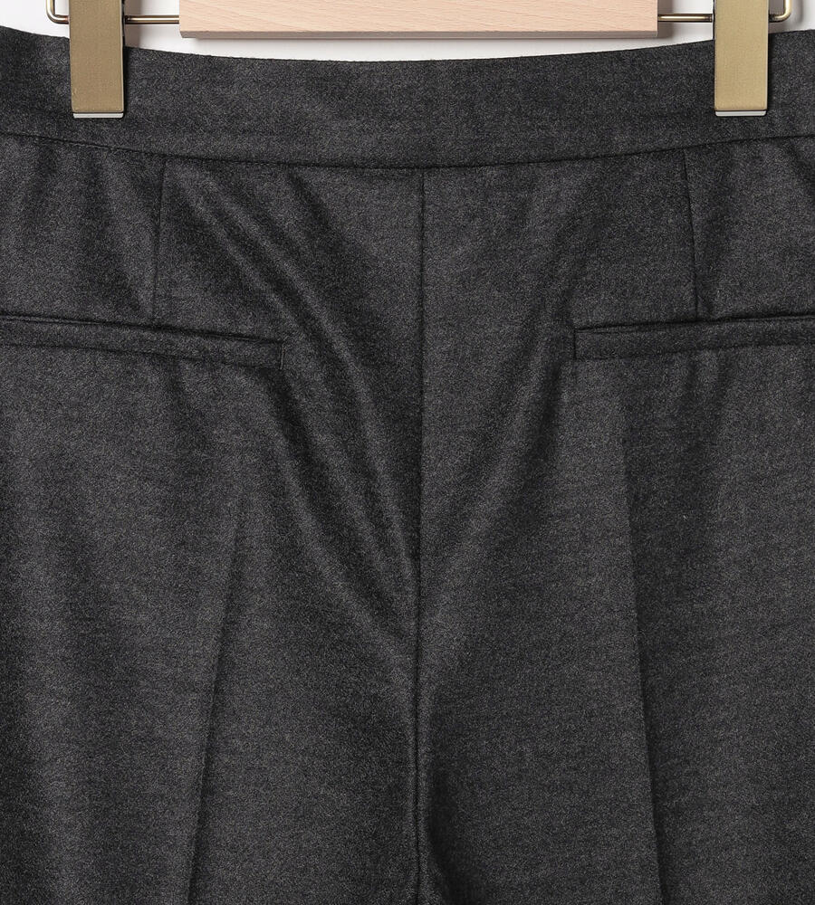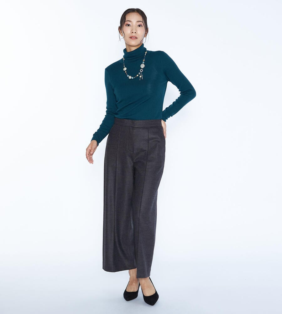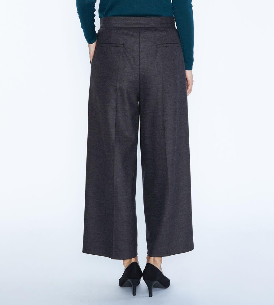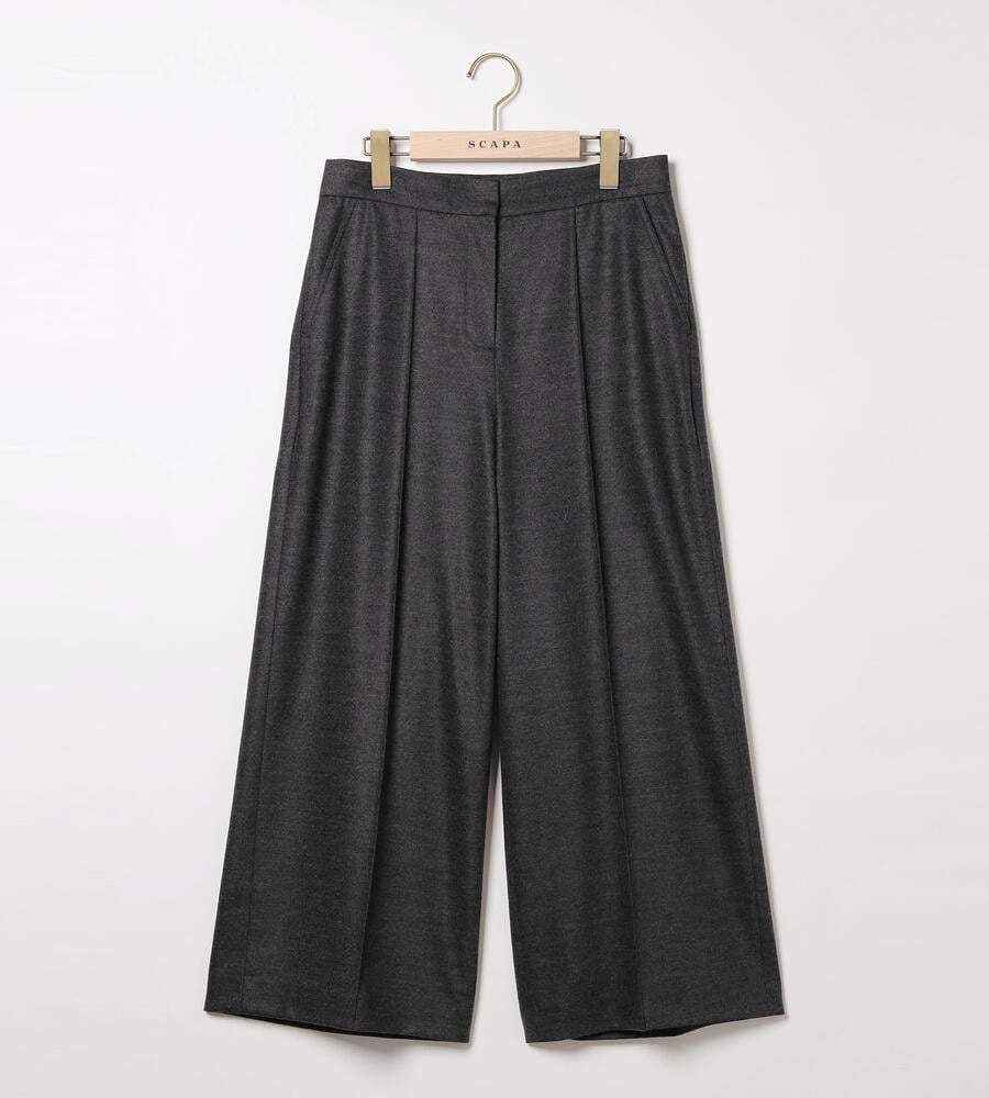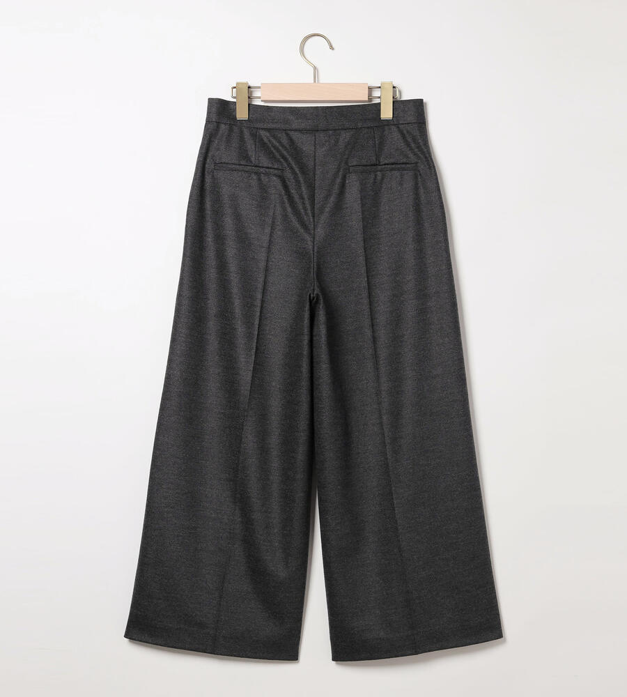 程よい光沢感のある毛とナイロンのブレンド素材で仕立てたパンツ。コンフォートなムードが漂うワイドシルエット。左右にポケットを配置し、センタープリーツですっきりとした印象に。クロップド丈はブーツとの相性も良く、軽やかなバランスで着こなせます。