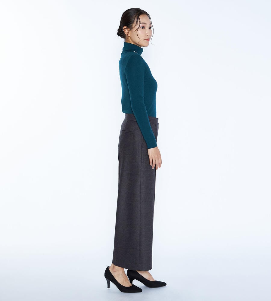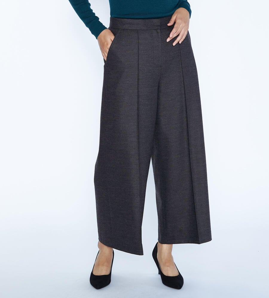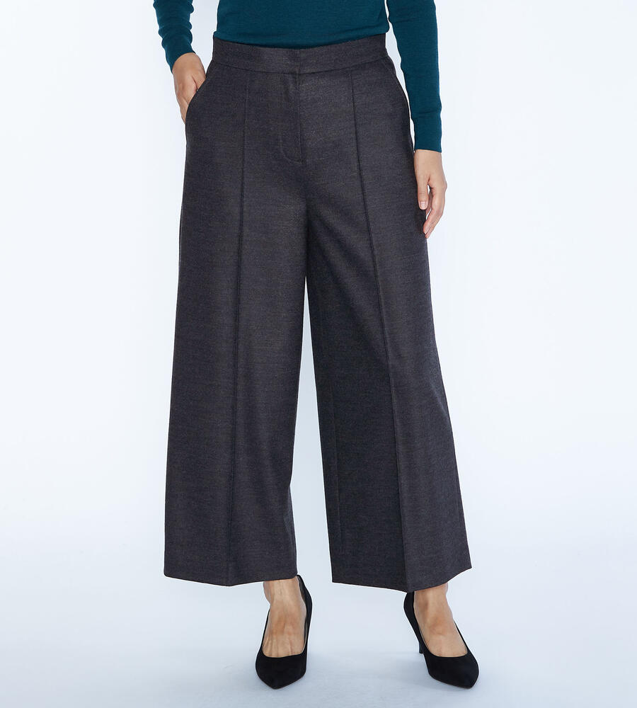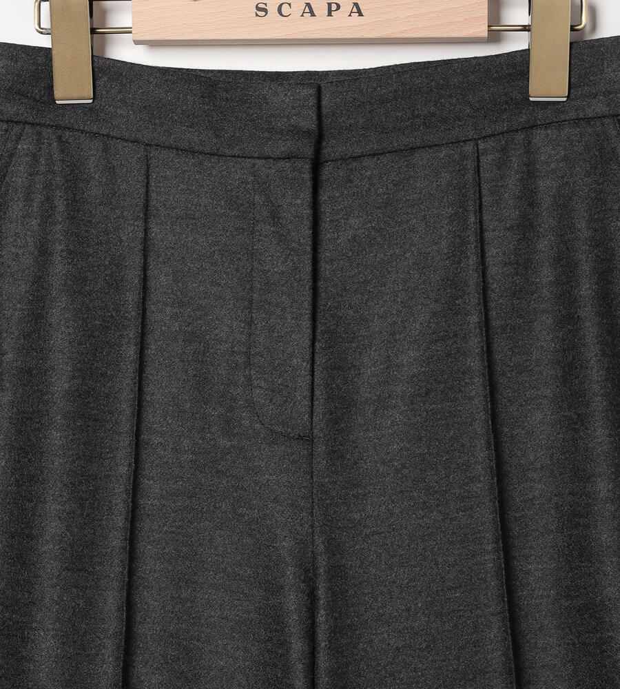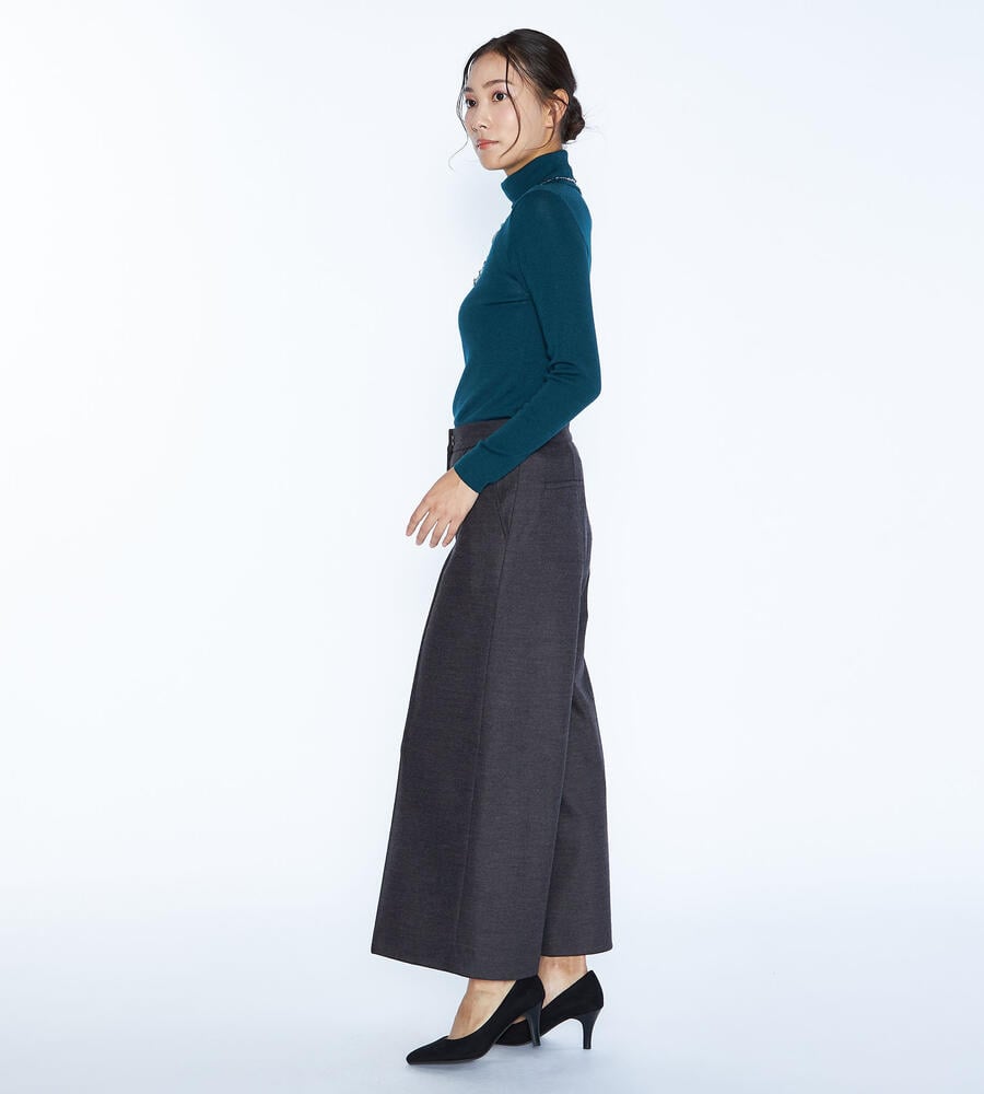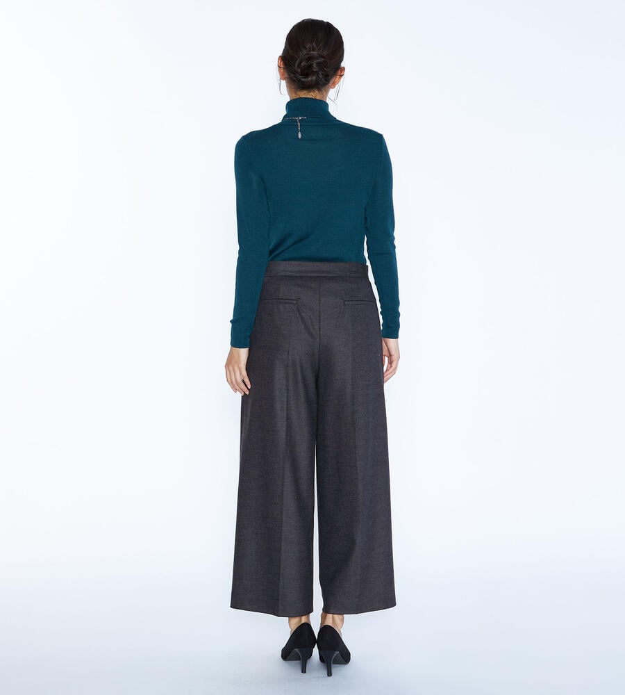 程よい光沢感のある毛とナイロンのブレンド素材で仕立てたパンツ。コンフォートなムードが漂うワイドシルエット。左右にポケットを配置し、センタープリーツですっきりとした印象に。クロップド丈はブーツとの相性も良く、軽やかなバランスで着こなせます。