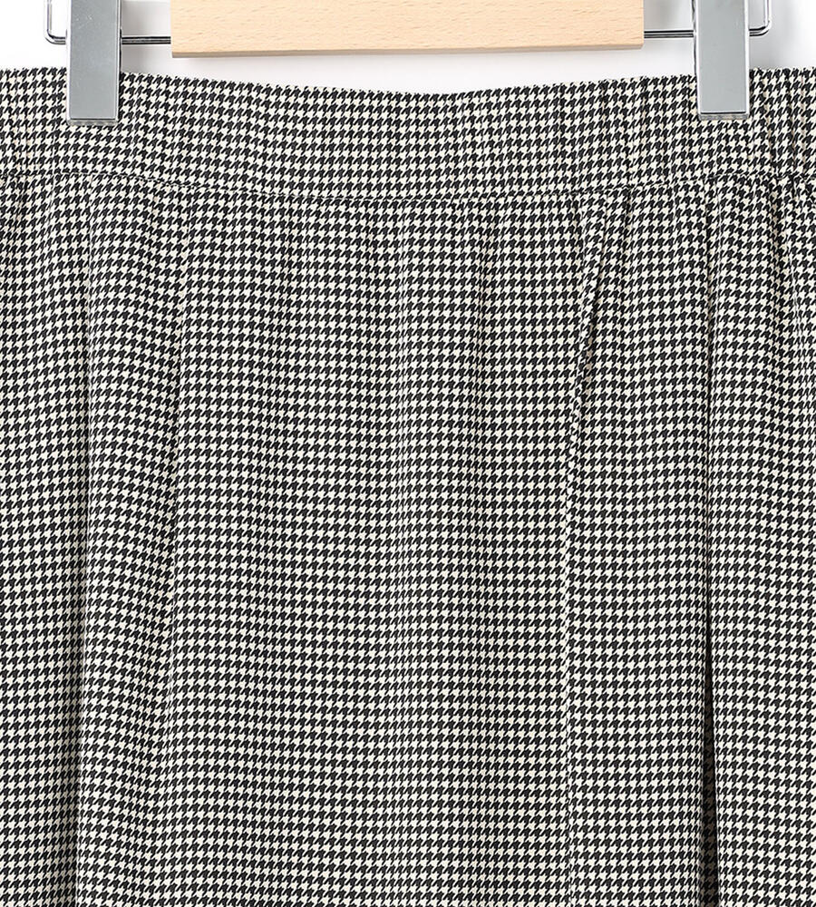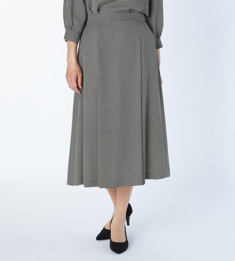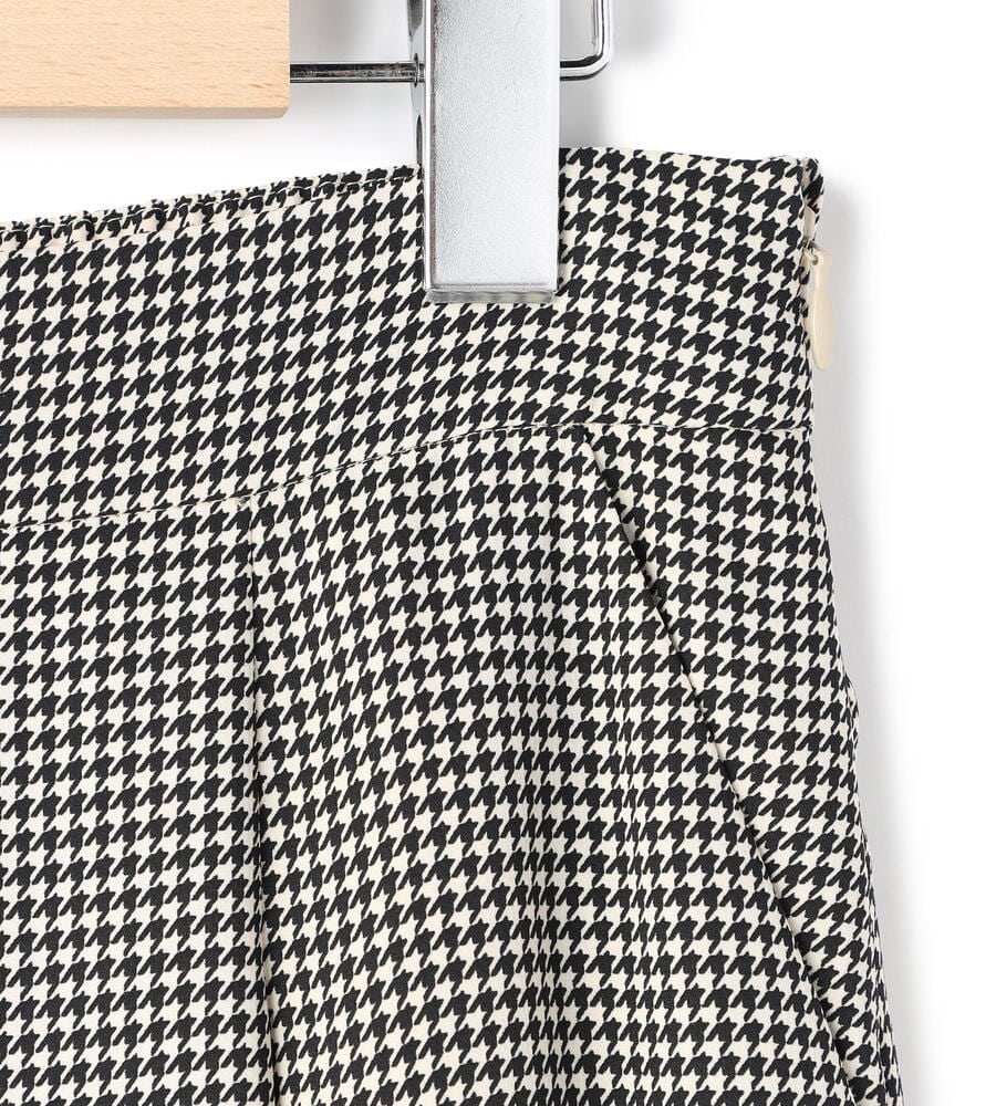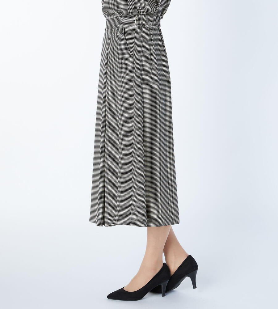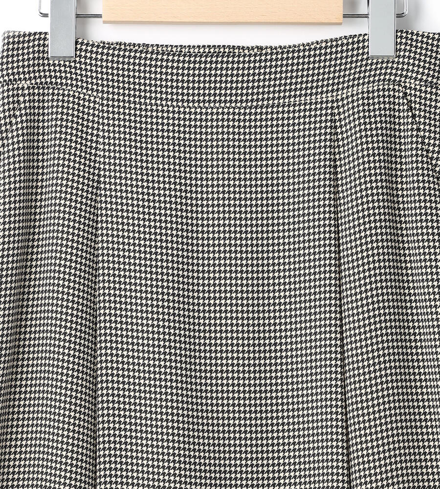 ハウンドトゥース柄プリントがさりげなく華やかなスカート。タック入りで立体感ある美しいドレープとフレアな裾がフェミニンなシルエット。落ち感のある上品な生地感も魅力。ウエスト後ろはゴム仕様で履き心地快適なのもうれしいポイント。エレガントなお出かけコーディネートが完成するアイテムです。