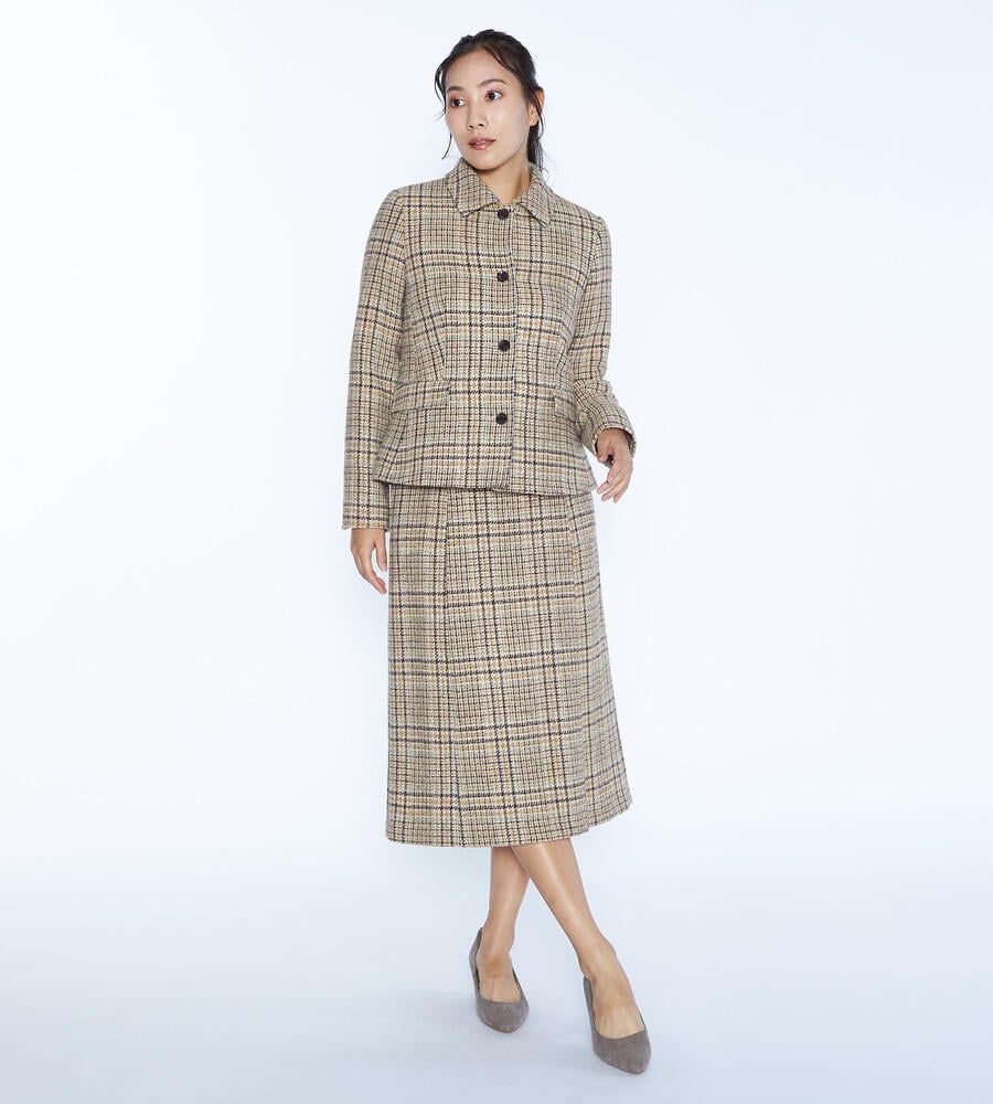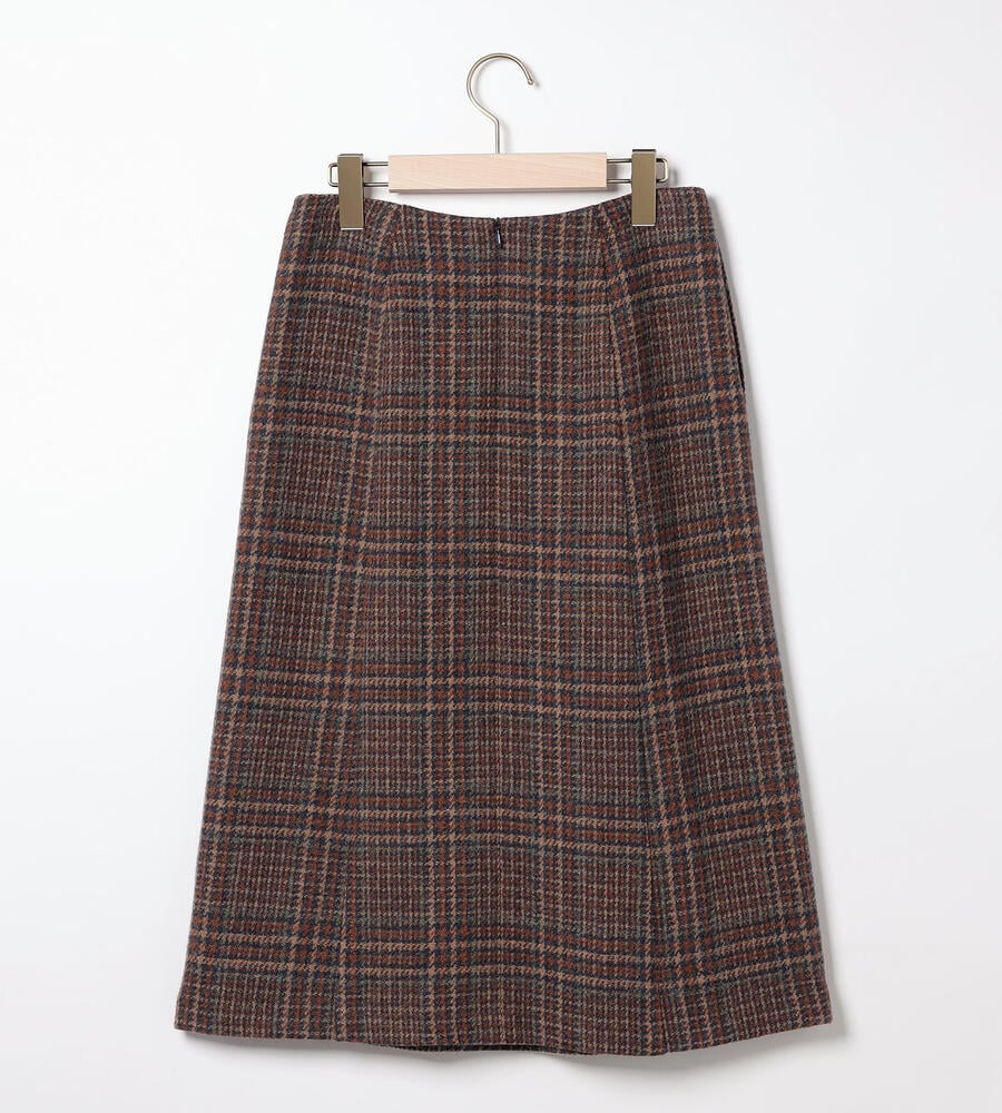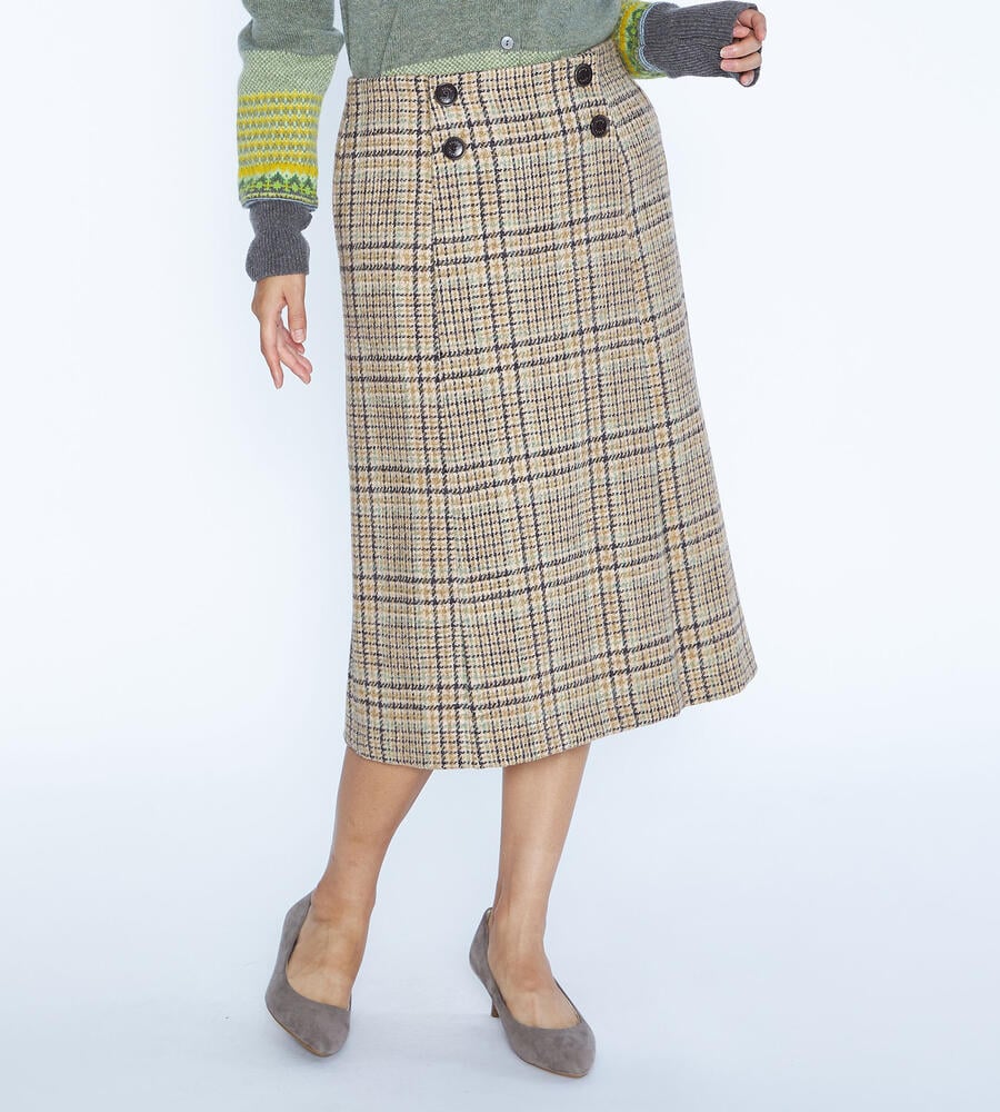 イギリス製生地を使用したハリスツイードスカート。トラッドなチェック柄をシックなカラーで仕上げた、秋冬らしさが漂うアイテムです。トップスインスタイルに映えるハイウエストデザイン、ブランドロゴ入りのフロントボタンがアクセントに。同生地のジャケットとセットアップで着こなしていただけます。
