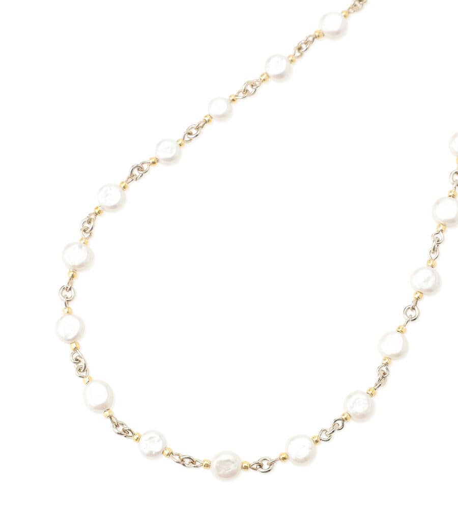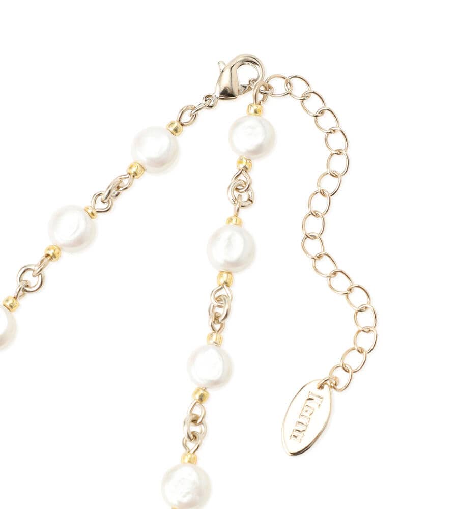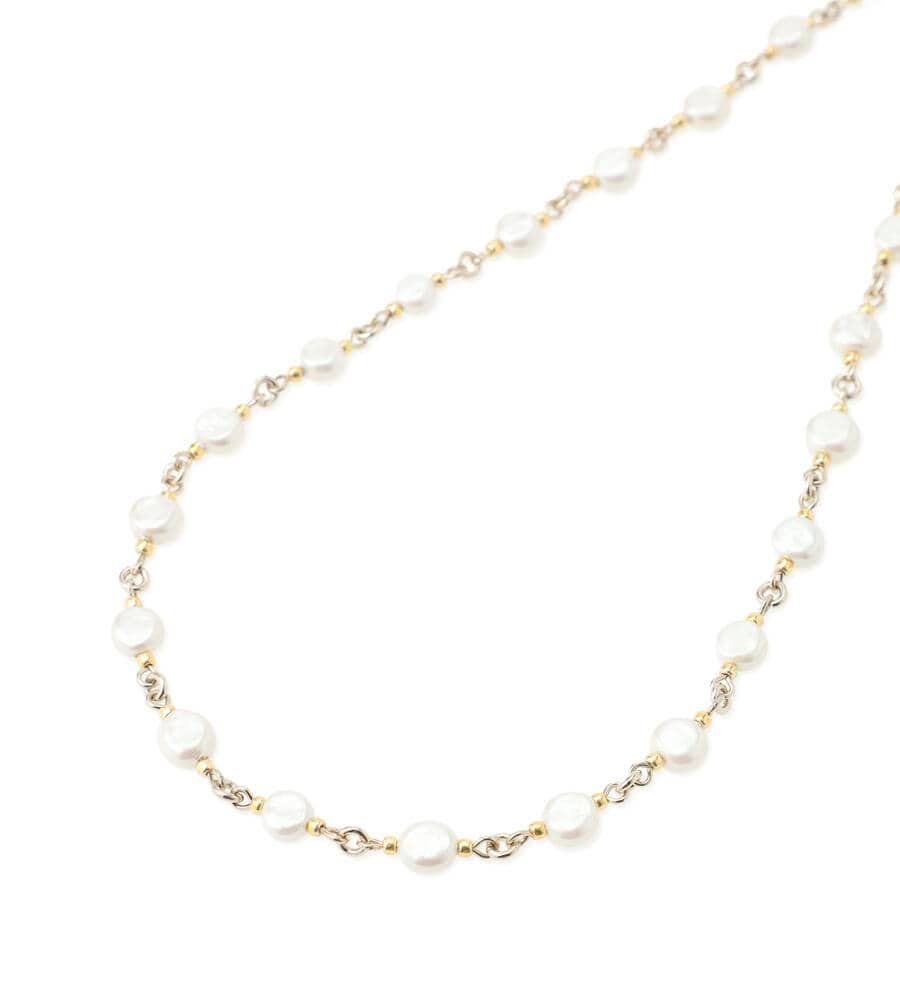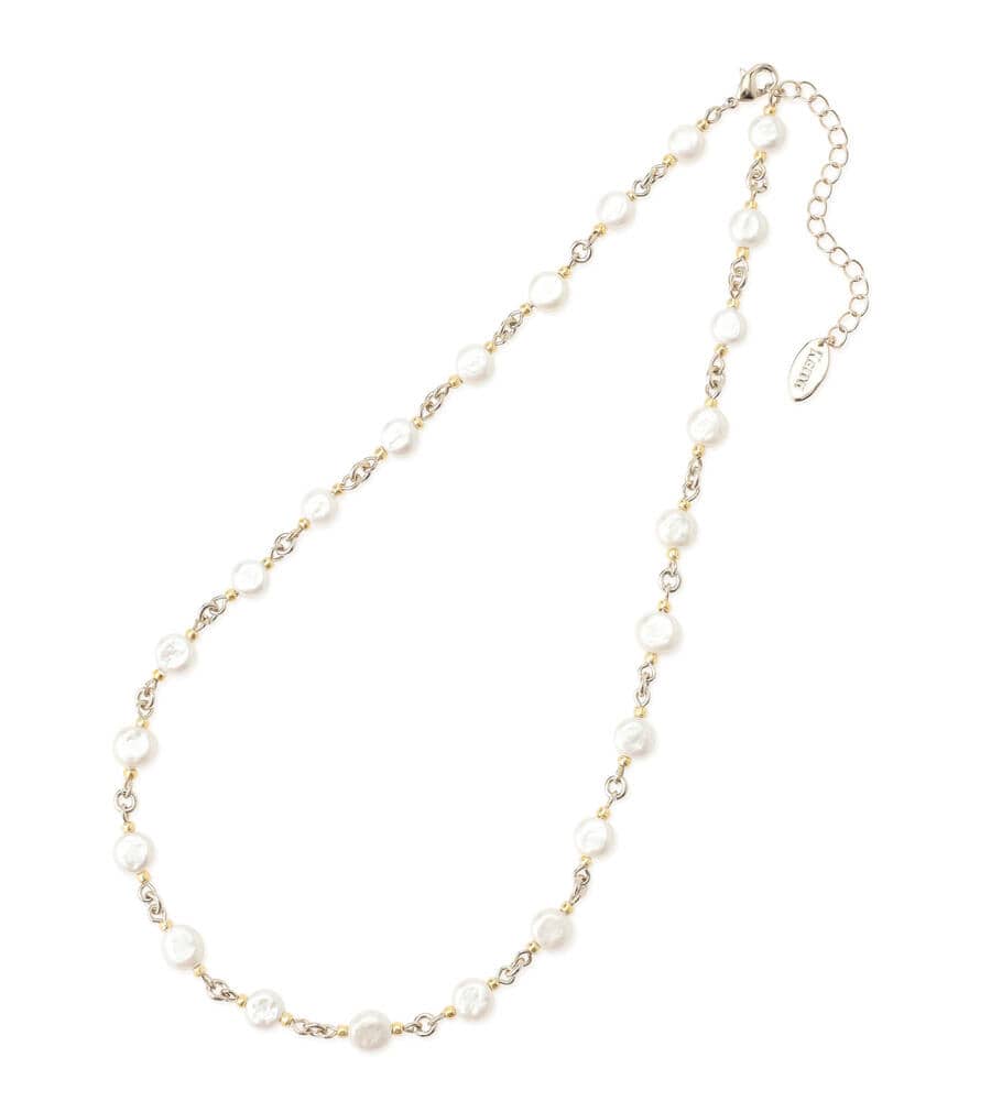 ゴールド×シルバーカラーのチェーンに、不揃いのガラスパールをあしらったネックレス。それぞれの美しい輝きが視線を誘い、コーディネートに華やぎを添えてくれます。トレンド感のあるモダンなデザインで、オケージョンはもちろん、カジュアルスタイルにも最適な一品。チェーンの長さは微調整が可能です。