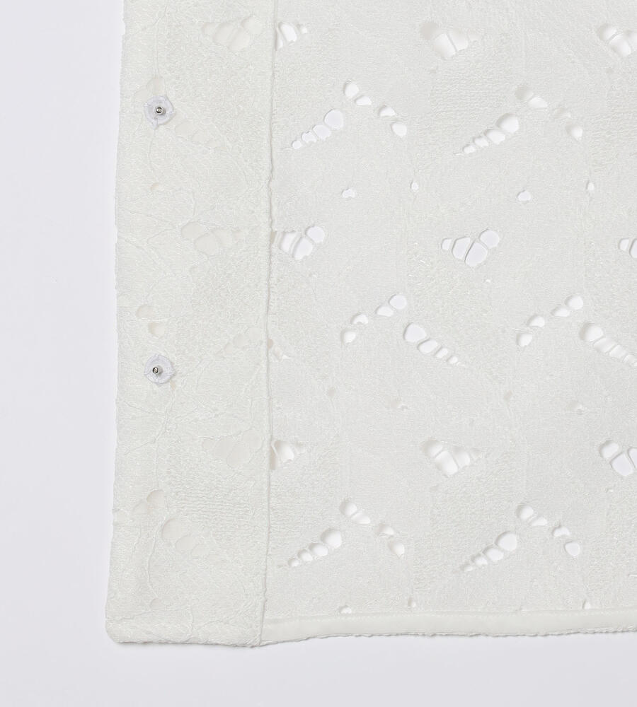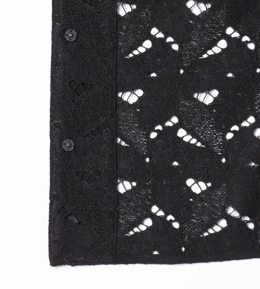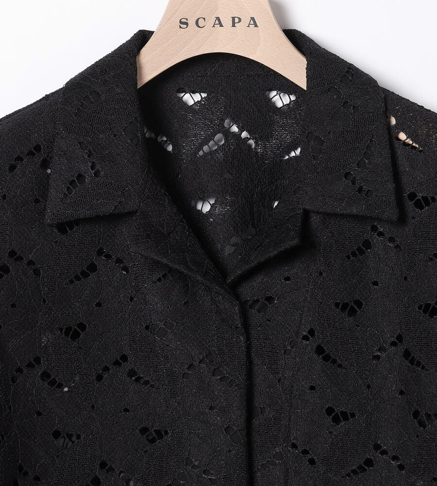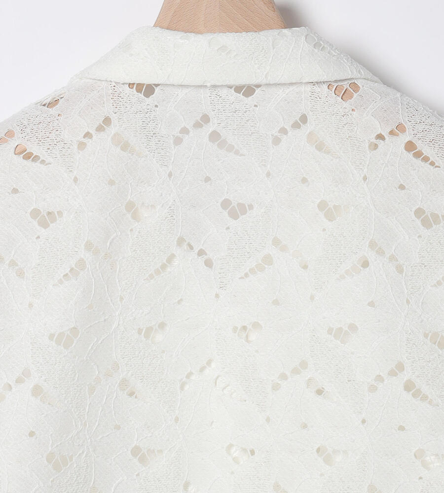 ボタニカル柄のレース素材を用いたブラウス。コンパクトなシルエットとオープンカラーを採用し、春夏らしい軽やかな印象に仕上げています。フロントの留め具が表に出ない設計で、ジャケットのようなきちんとした表情を備えているのも特徴。ワンピースなどの上からさらりと羽織るスタイルも、バランスよくまとまります。