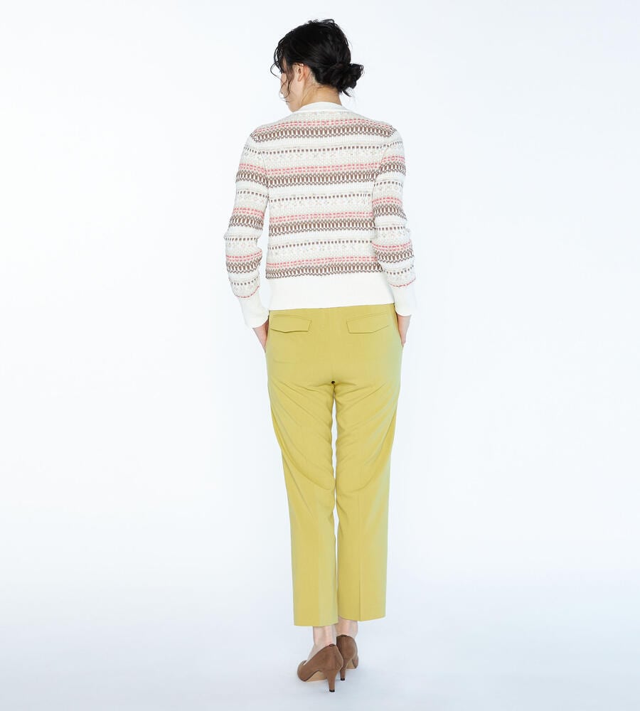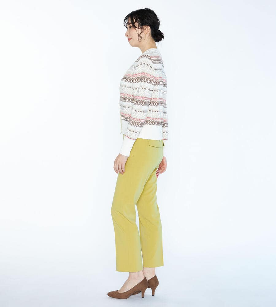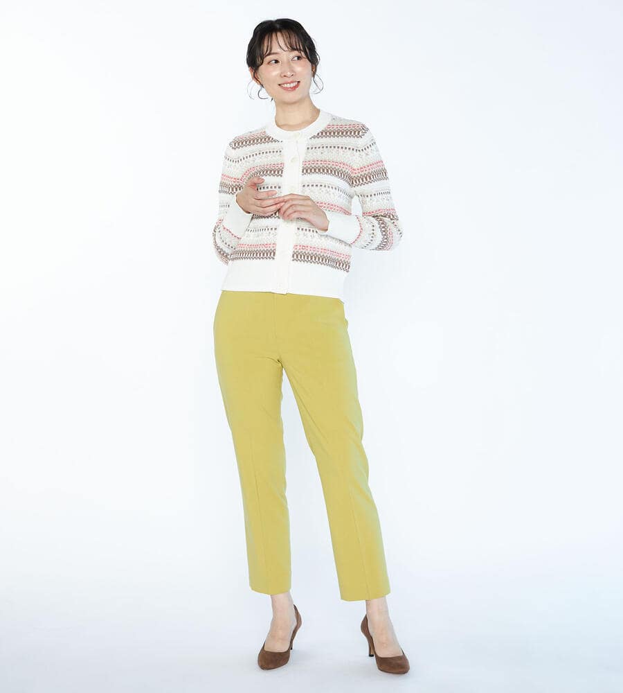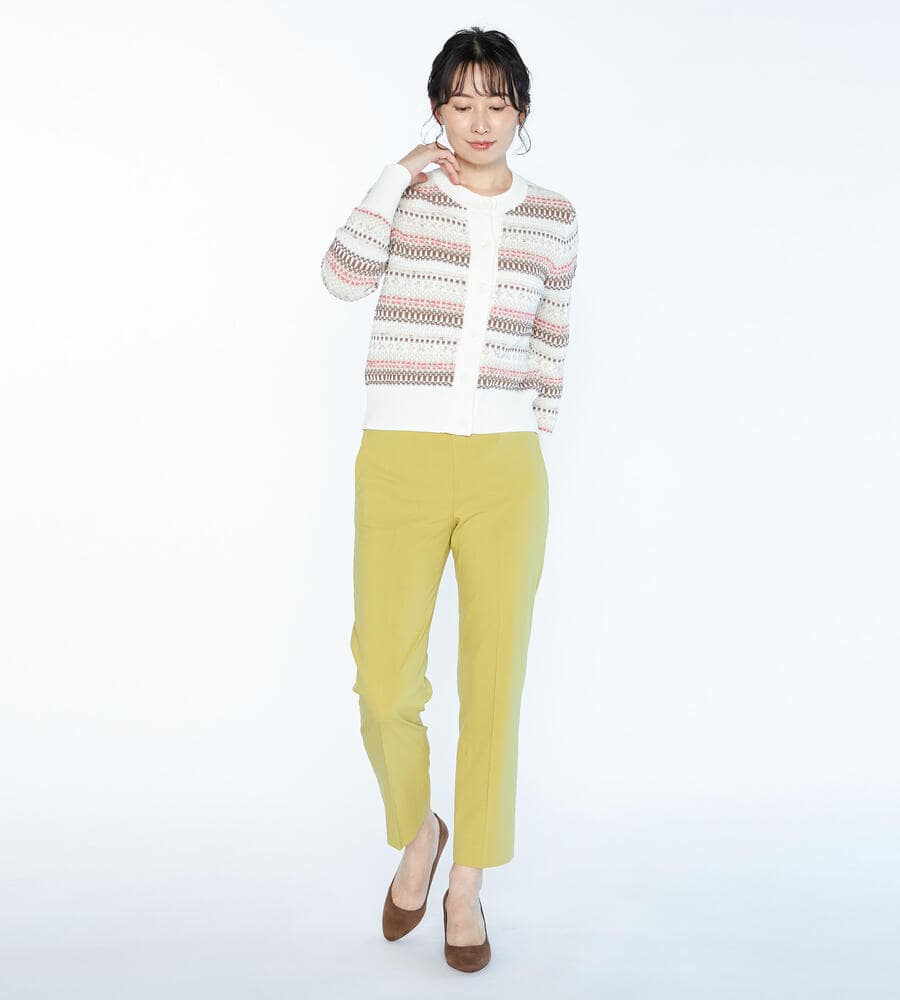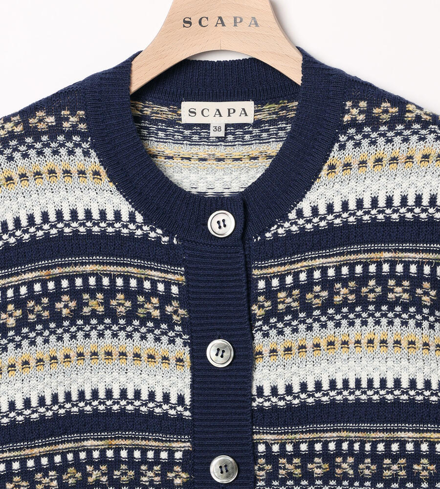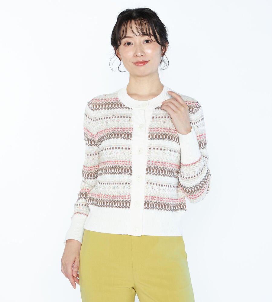 シーズンムード溢れるフェアアイル柄をモダンな雰囲気に昇華したニットカーディガン。フロントに大きめのボタンを配置し、アクセントカラーで華やかさをプラス。柄部分をコンパクトに、裾の無地切り替えの幅を広めに取ることでウエストまわりが引き締まって見える効果も。