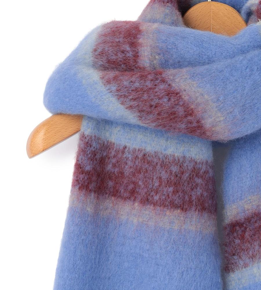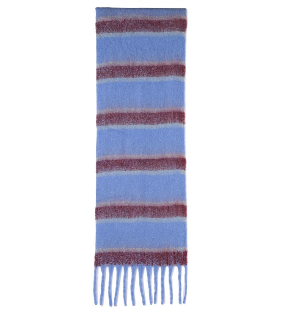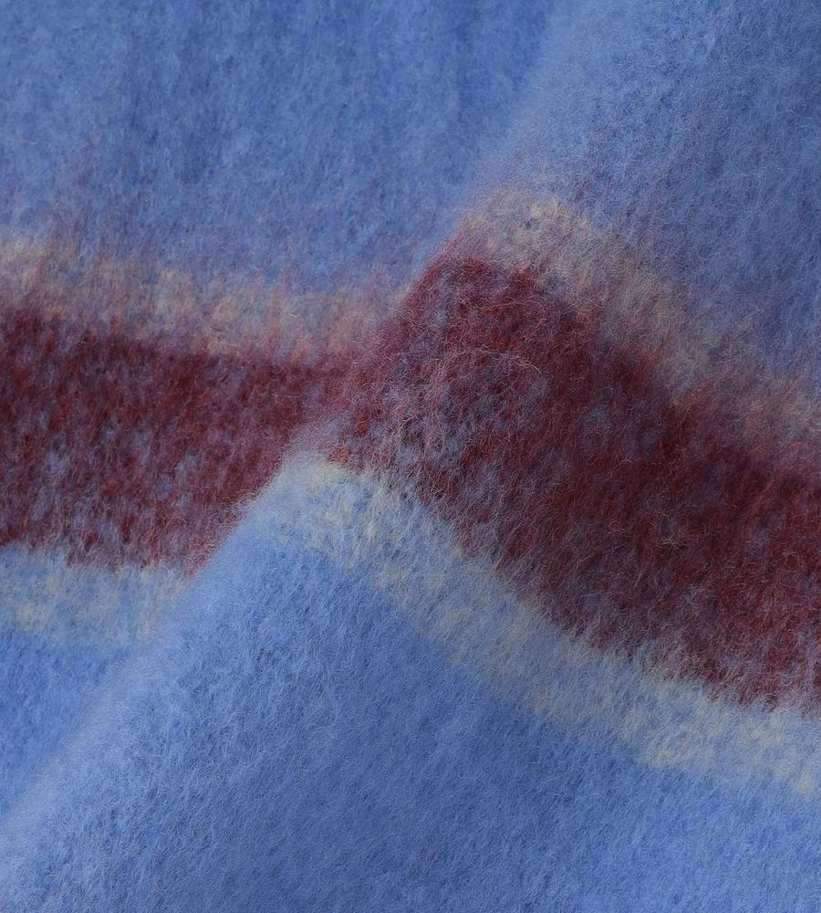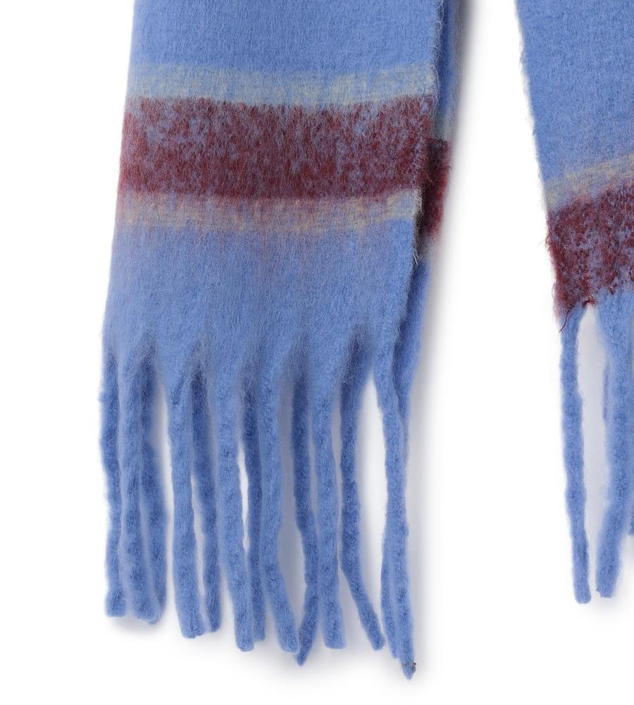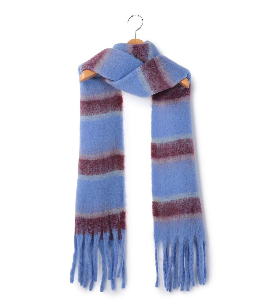 ボリュームあるふわふわの素材感でトレンド感抜群のマフラー。ニュアンスのあるボーダー柄のデザインが着こなしにアクセントを与えてくれるおしゃれなデザイン。裾のビッグフリンジもおしゃれなデザインポイント。あたたかなムードで秋冬シーズンらしいお出かけスタイリングにぴったりなアイテムです。