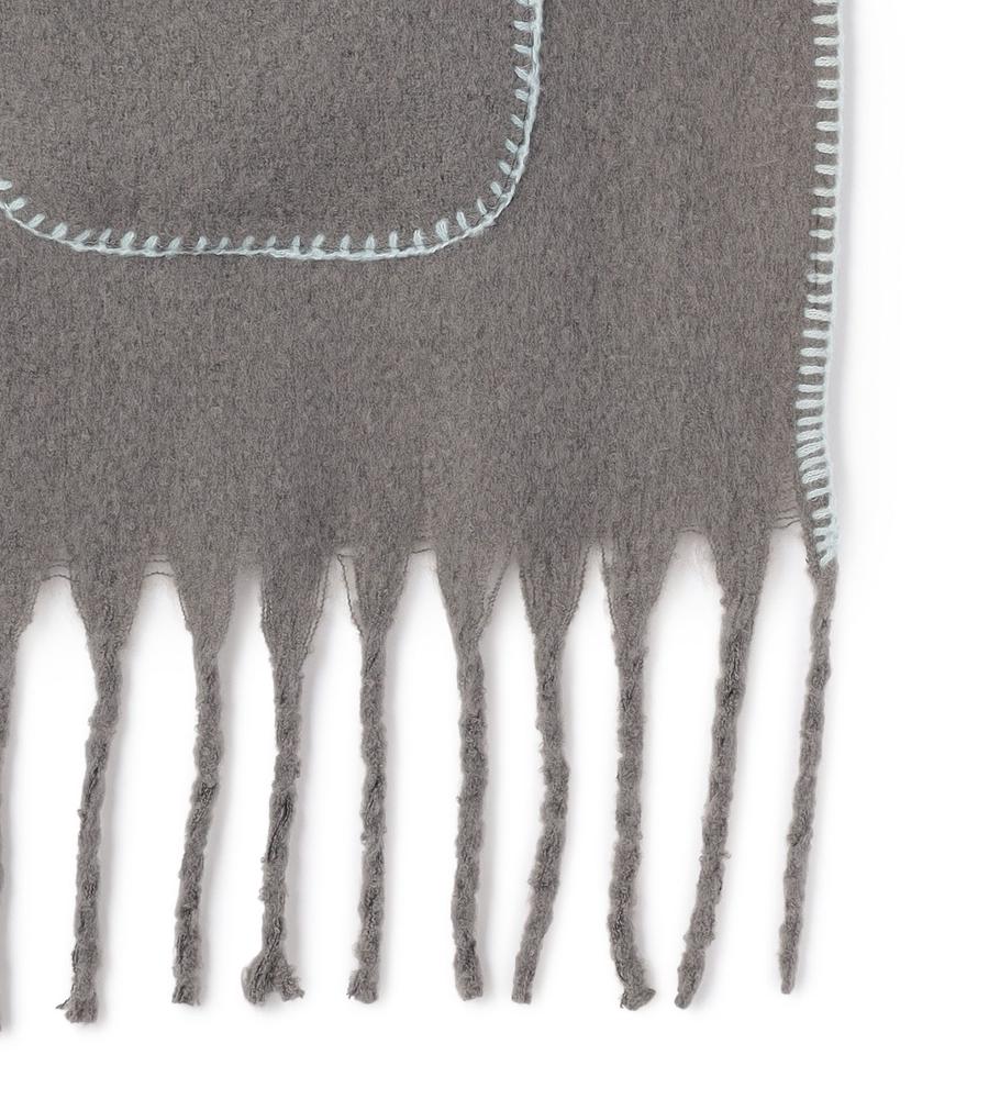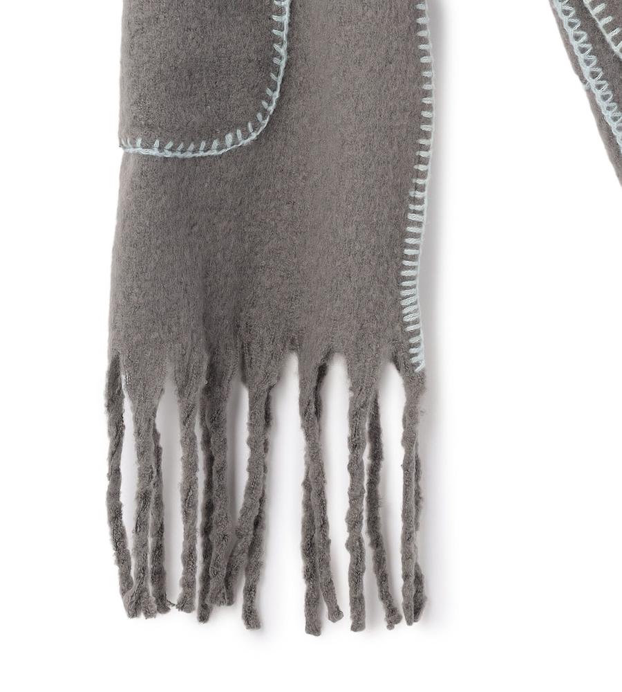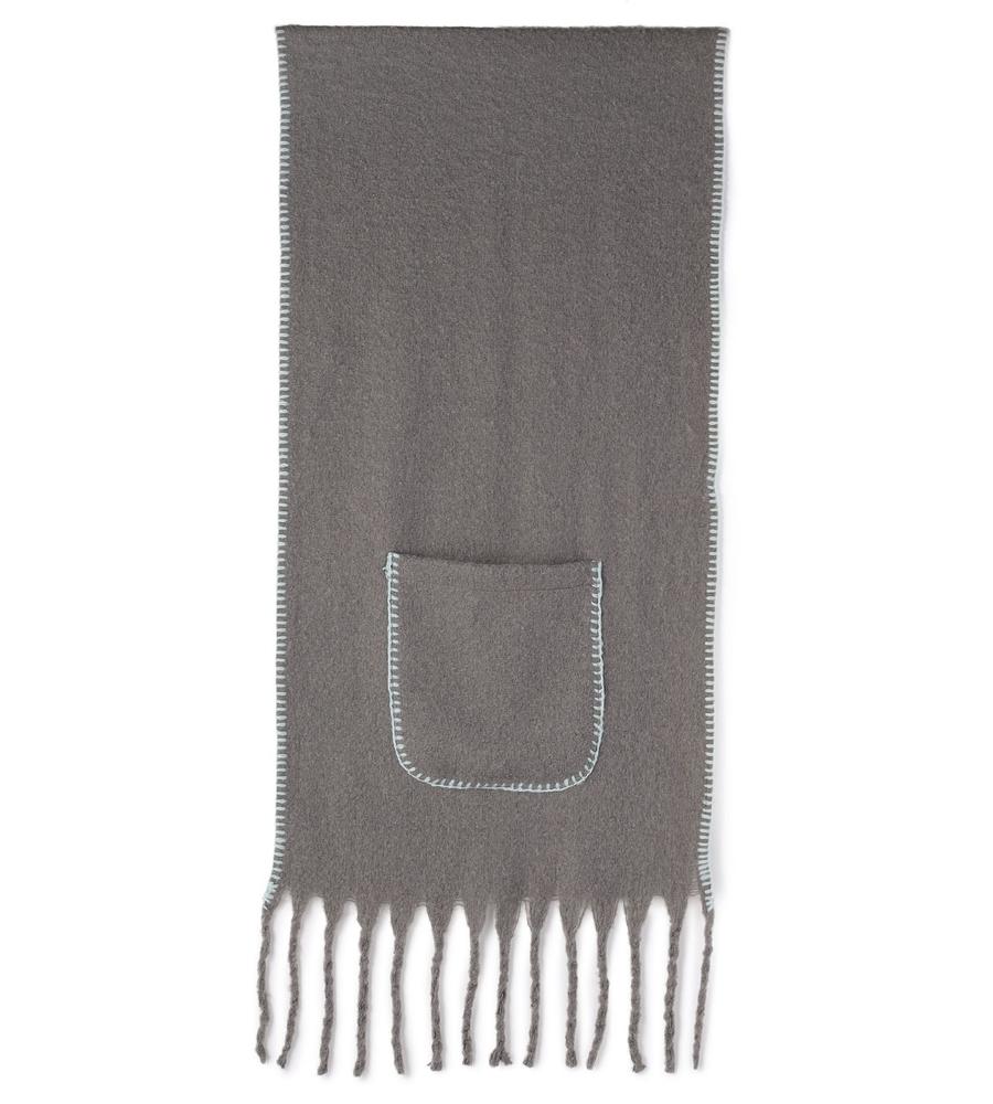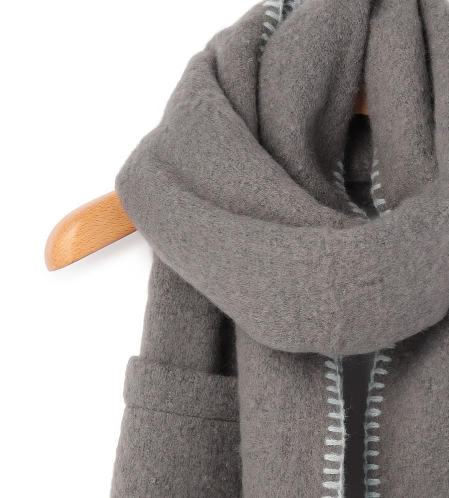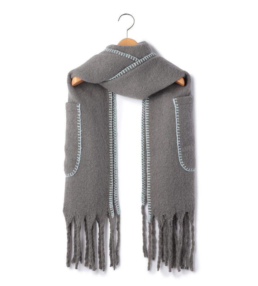 ボリューム感のあるふわふわの素材感でトレンド感あるマフラー。端のかがり縫いのカラーアクセントがおしゃれなデザインポイント。両端には大きなポケットあしらいもおしゃれなデザイン。裾のビッグフリンジもデザインポイント。あたたかなムードの素材感で、秋冬シーズンのお出かけコーディネートで活躍するアイテムです。