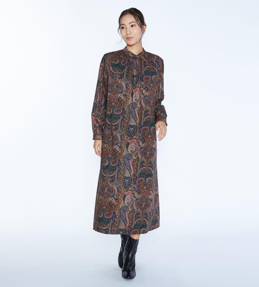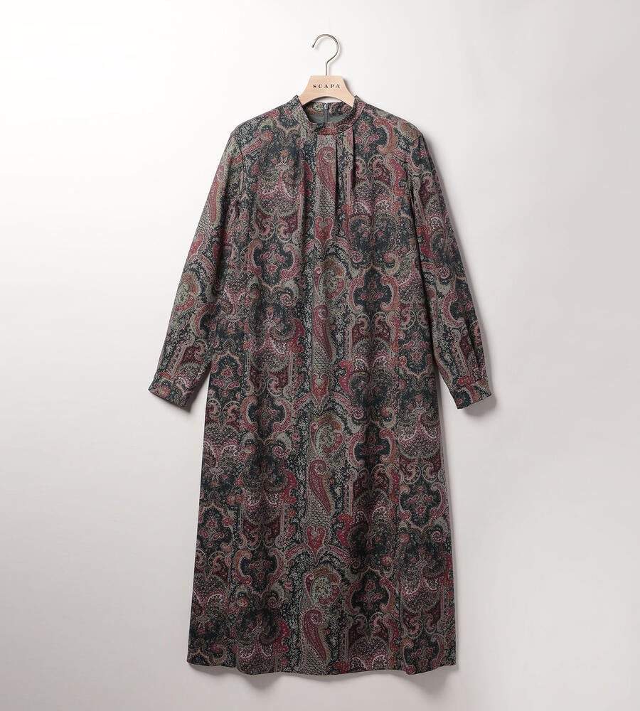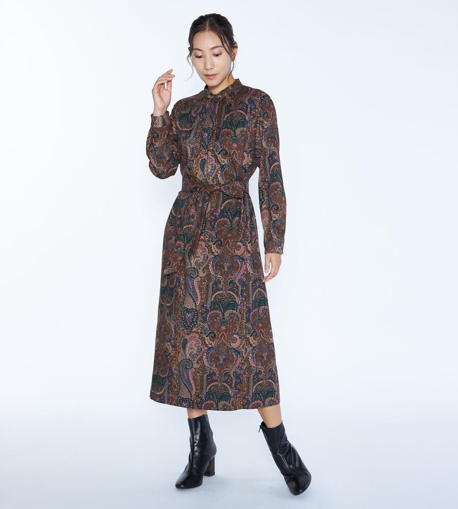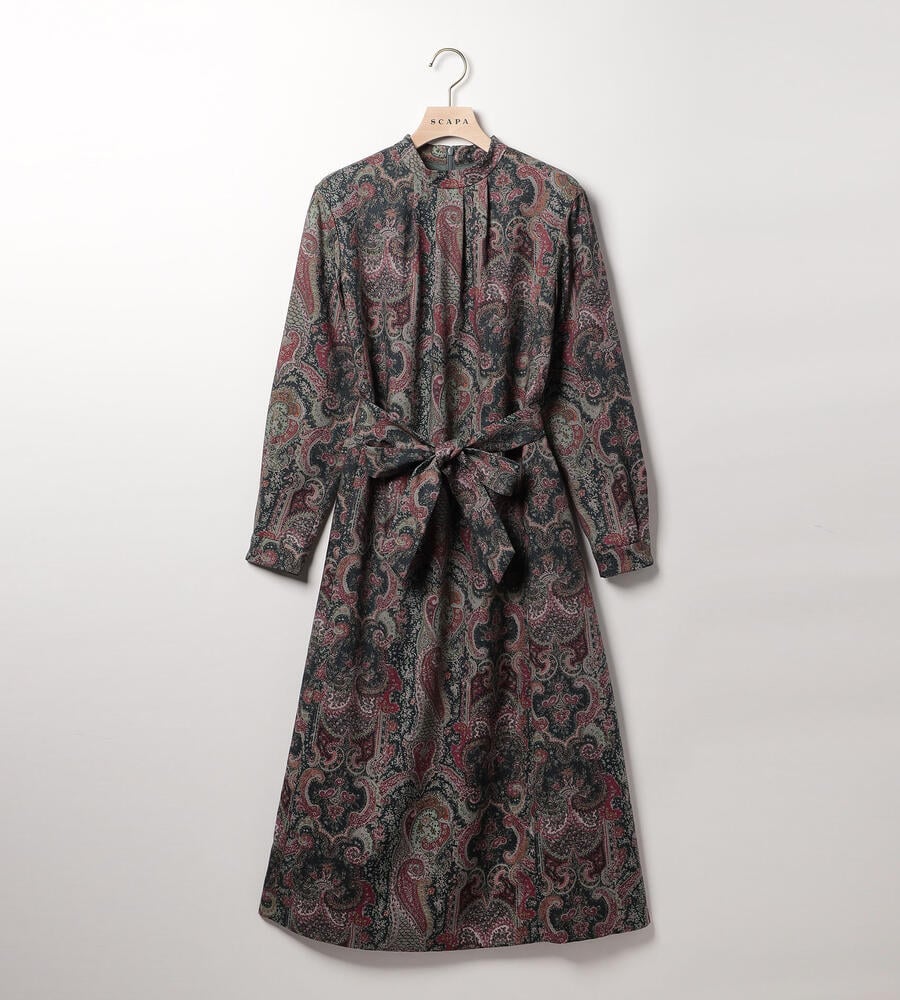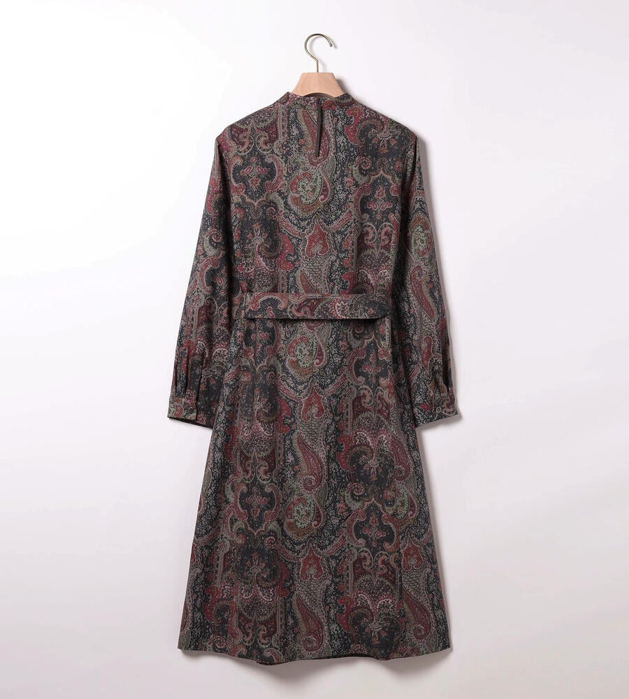 モダンシックに着こなせる、ヴィンテージペーズリー柄のワンピース。スタンドカラーデザイン、袖口はカフスで切り替え、フロントにタックを取り入れて程よいゆとりをプラス。ウエストベルトのオンオフで雰囲気のアレンジを楽しんでいただけます。