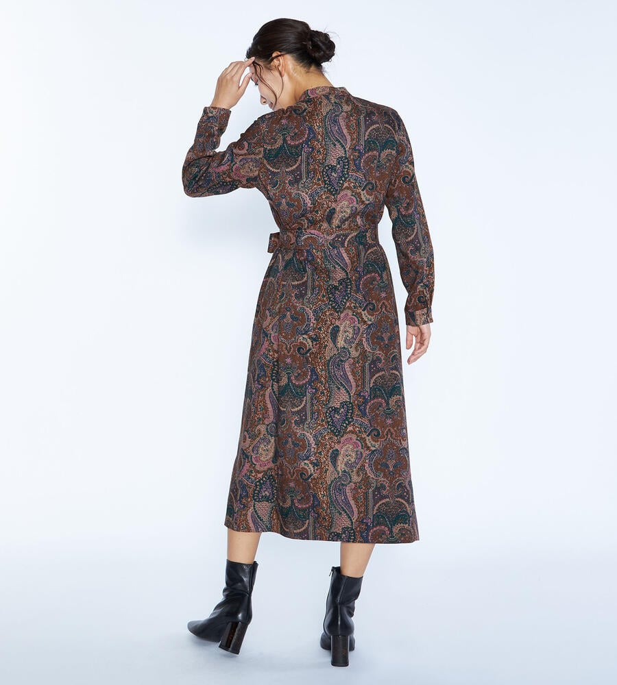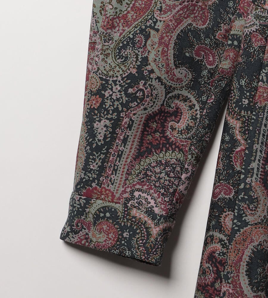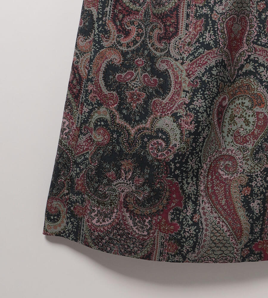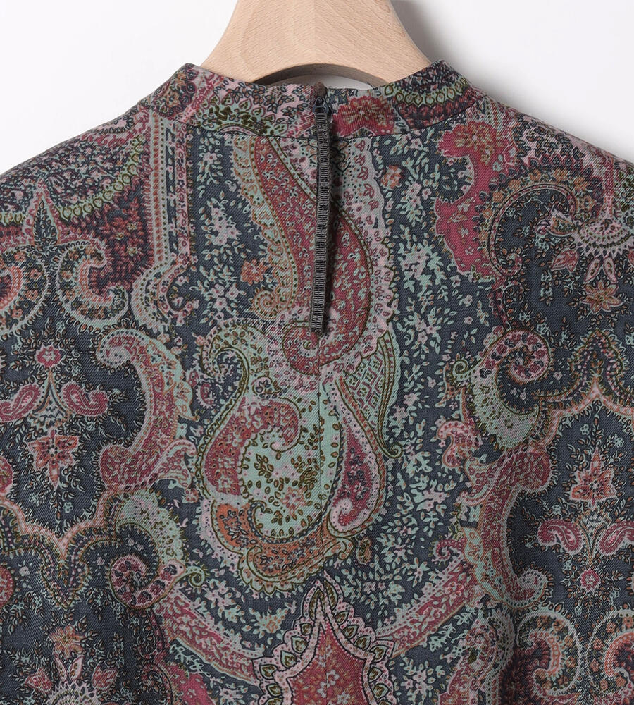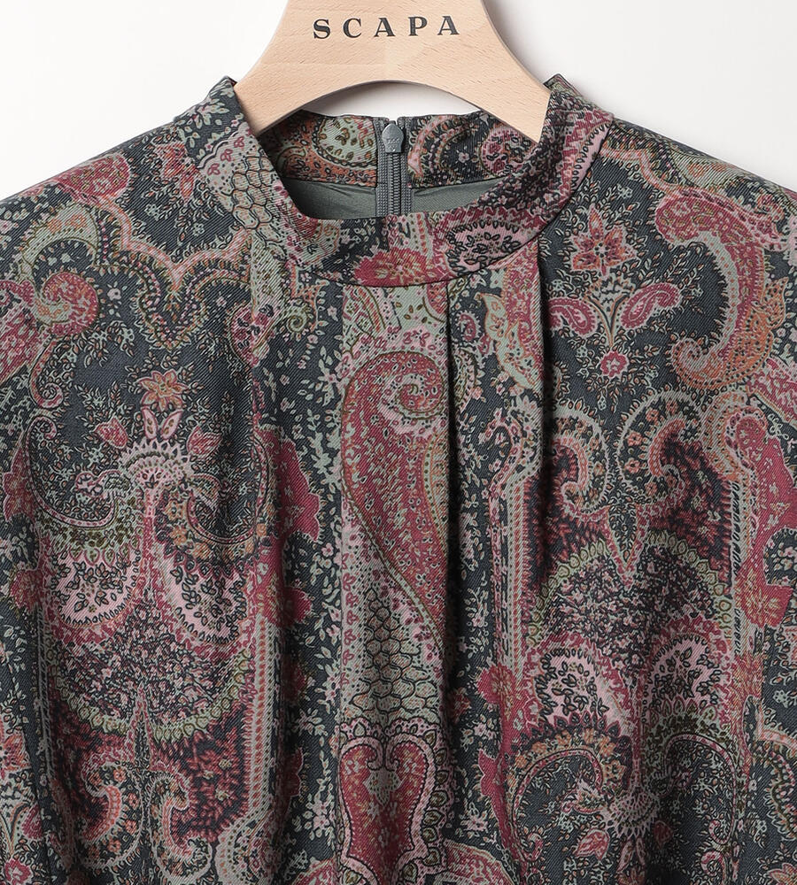 モダンシックに着こなせる、ヴィンテージペーズリー柄のワンピース。スタンドカラーデザイン、袖口はカフスで切り替え、フロントにタックを取り入れて程よいゆとりをプラス。ウエストベルトのオンオフで雰囲気のアレンジを楽しんでいただけます。