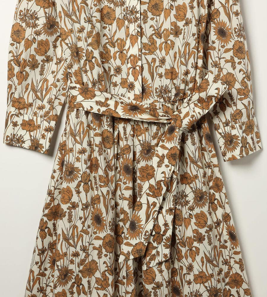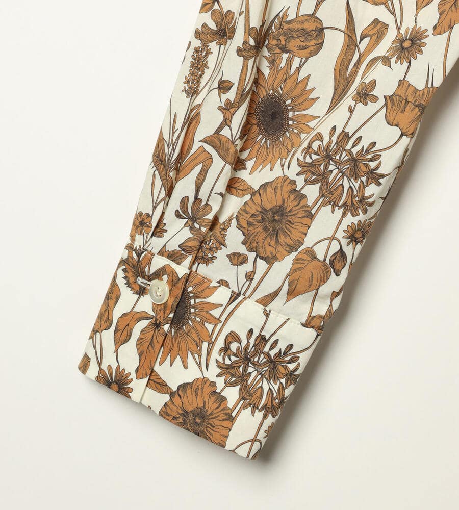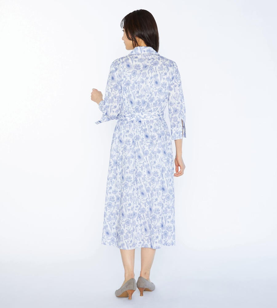デザイン性の高いプリントで有名なロンドンのリバティ社のリバティプリントワンピース。繊細なタッチのボタニカルフラワープリントが華やかなデザイン。エレガントな膝下ミモレ丈。ウエスト位置に同布のウエストリボンのアクセントでメリハリあるシルエットで着こなせます。おしゃれなお出かけコーディネートが一枚で完成するアイテムです。