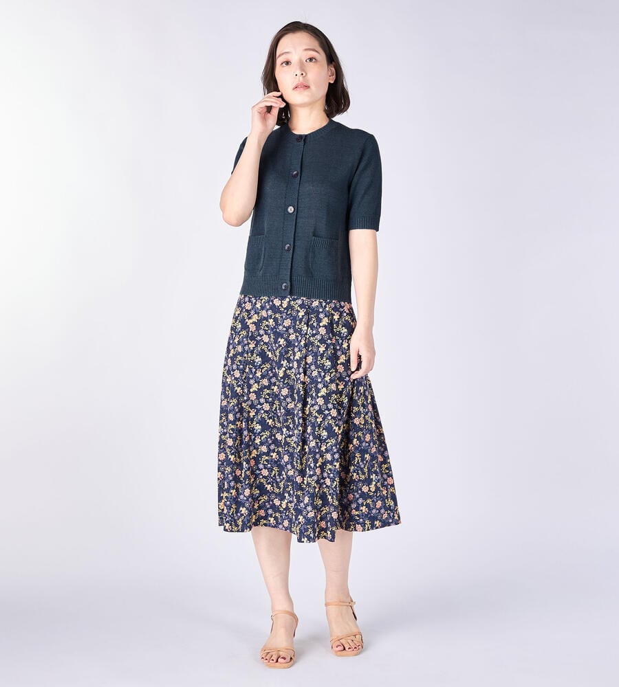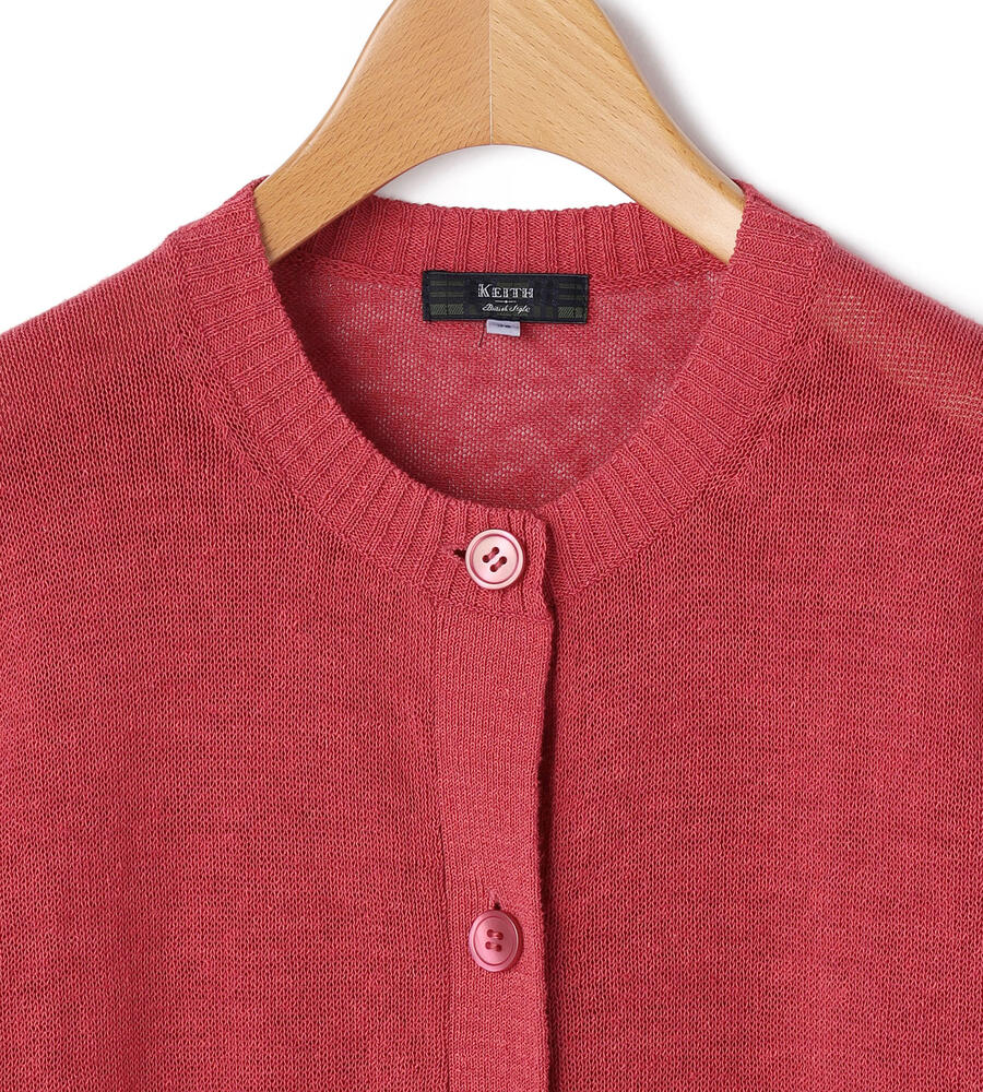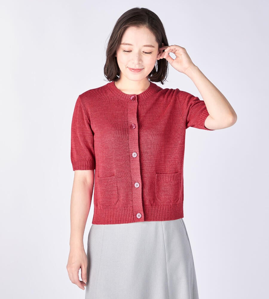 さらっとした肌触りのリネン混合生地で仕立てたさわやかなムードの5分袖ニットカーディガン。フロントの2つの小さなポケット、袖先、裾のリブがシンプルなデザインアクセント。ボタンが首元まであるのでトップスとしても活躍する便利なアイテム。シンプルなデザインで毎日のコーディネートで活躍します。