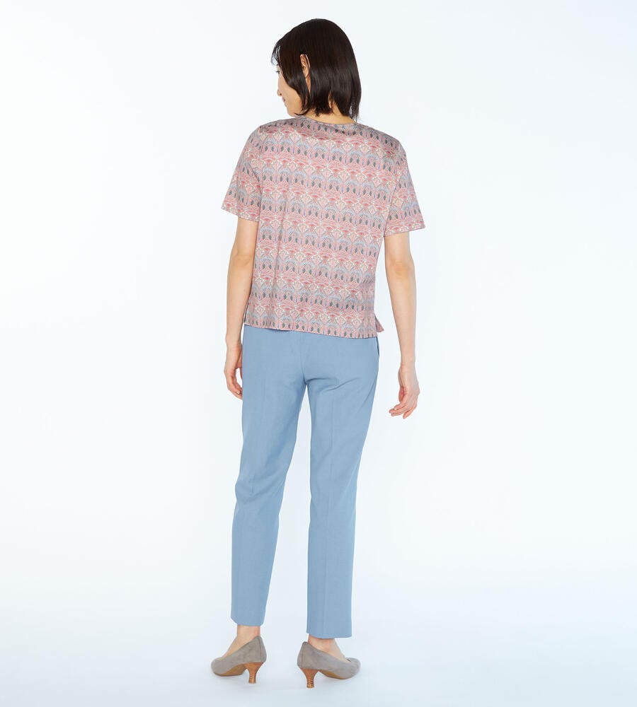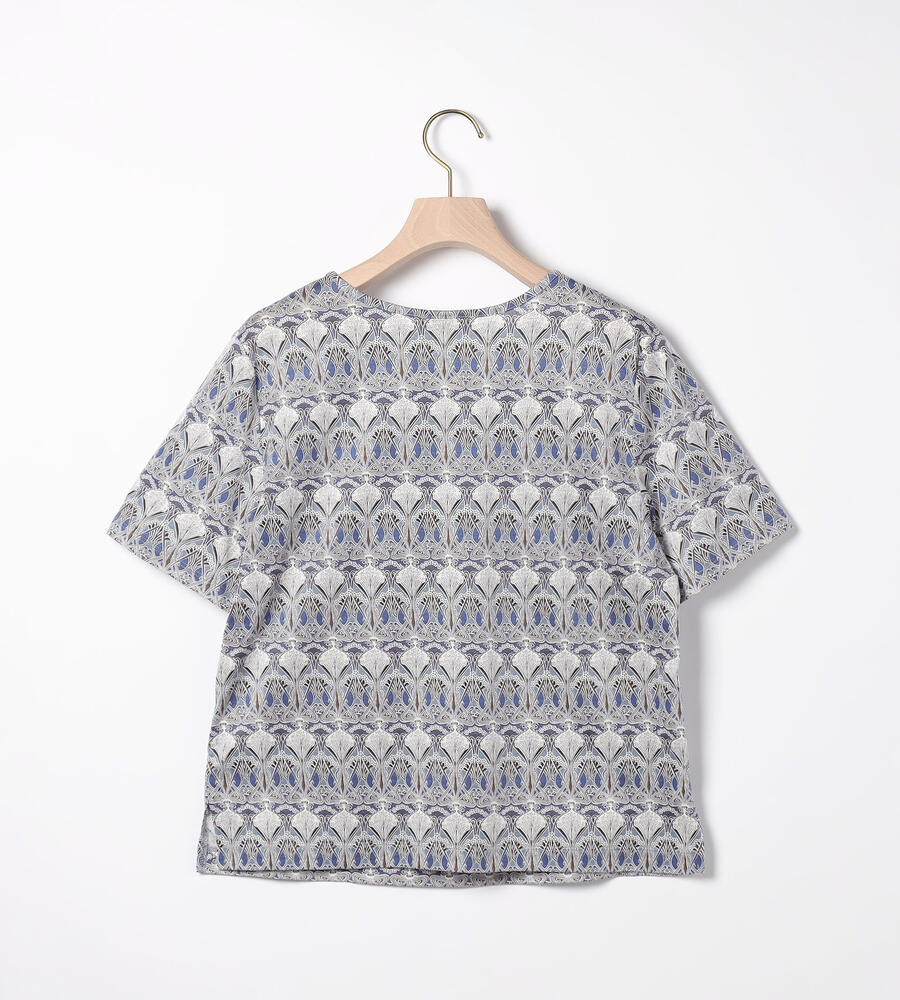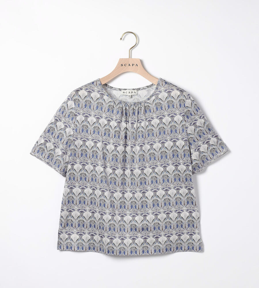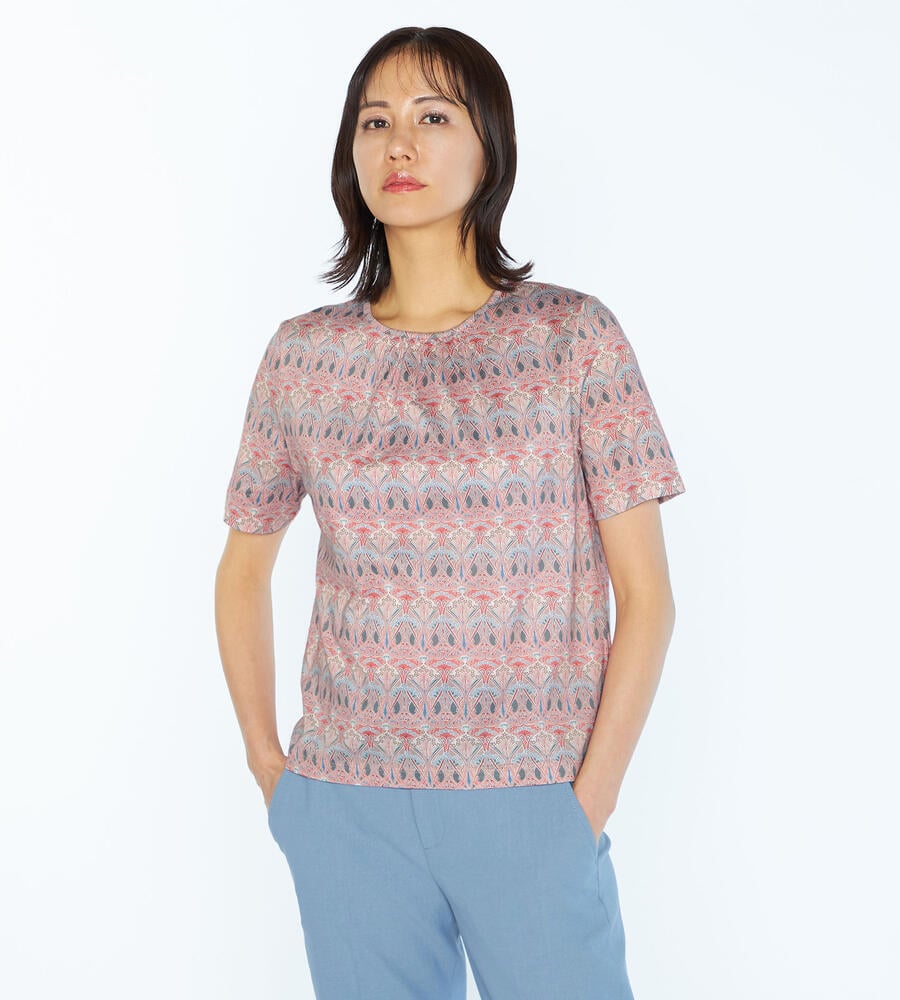 オリエンタルなリバティプリントの半袖カットソー。クリアな表面感と肌触りの良さが魅力のジャージー生地を使用しています。首元にはタックを入れて優しい雰囲気に仕上げました。快適ながらも上品に着用でき、大人の日常スタイルにおすすめのアイテム。一枚着はもちろん、カーディガンやジャケットのインナーにも最適です。