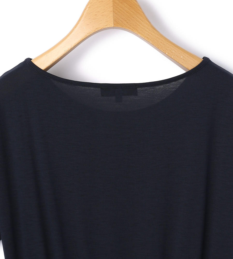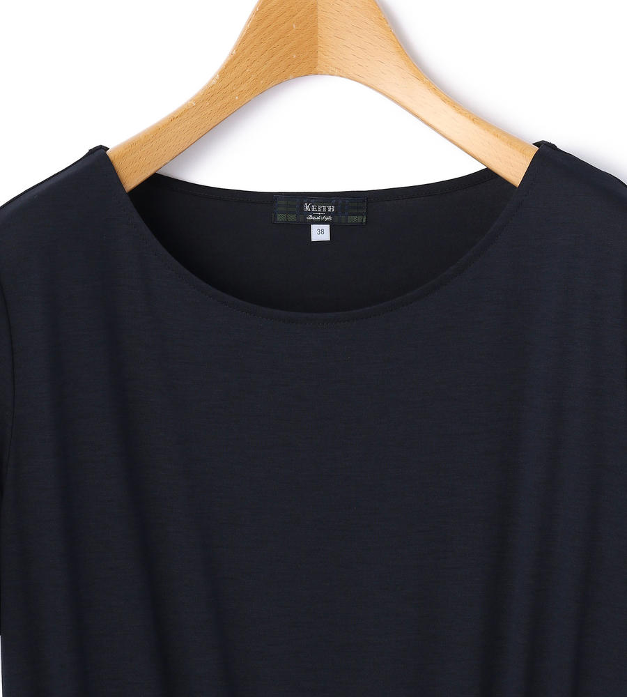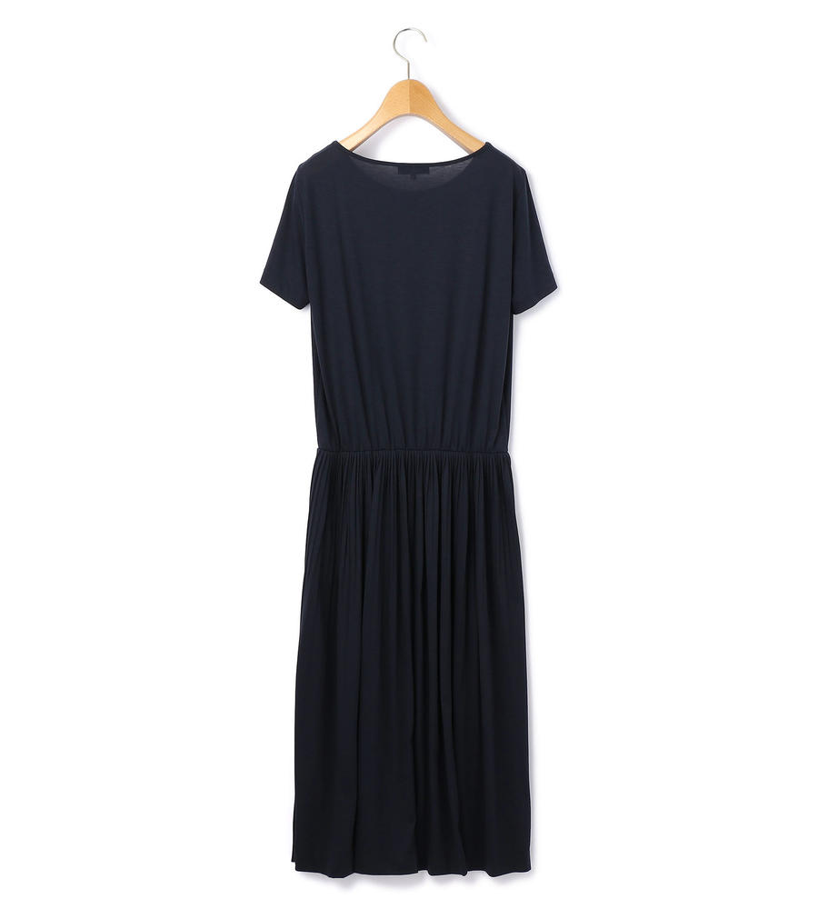 ベーシックなワントーンカラーのラウンドネックワンピース。ゆったりと開いたネックラインが抜け感を演出。やさしい肌触りのレーヨン混ファブリックを使い、全体にギャザーを寄せて女性らしい柔らかなニュアンスに。上からカーディガンやジャケットを重ねたコーディネートもバランスよく仕上がります。