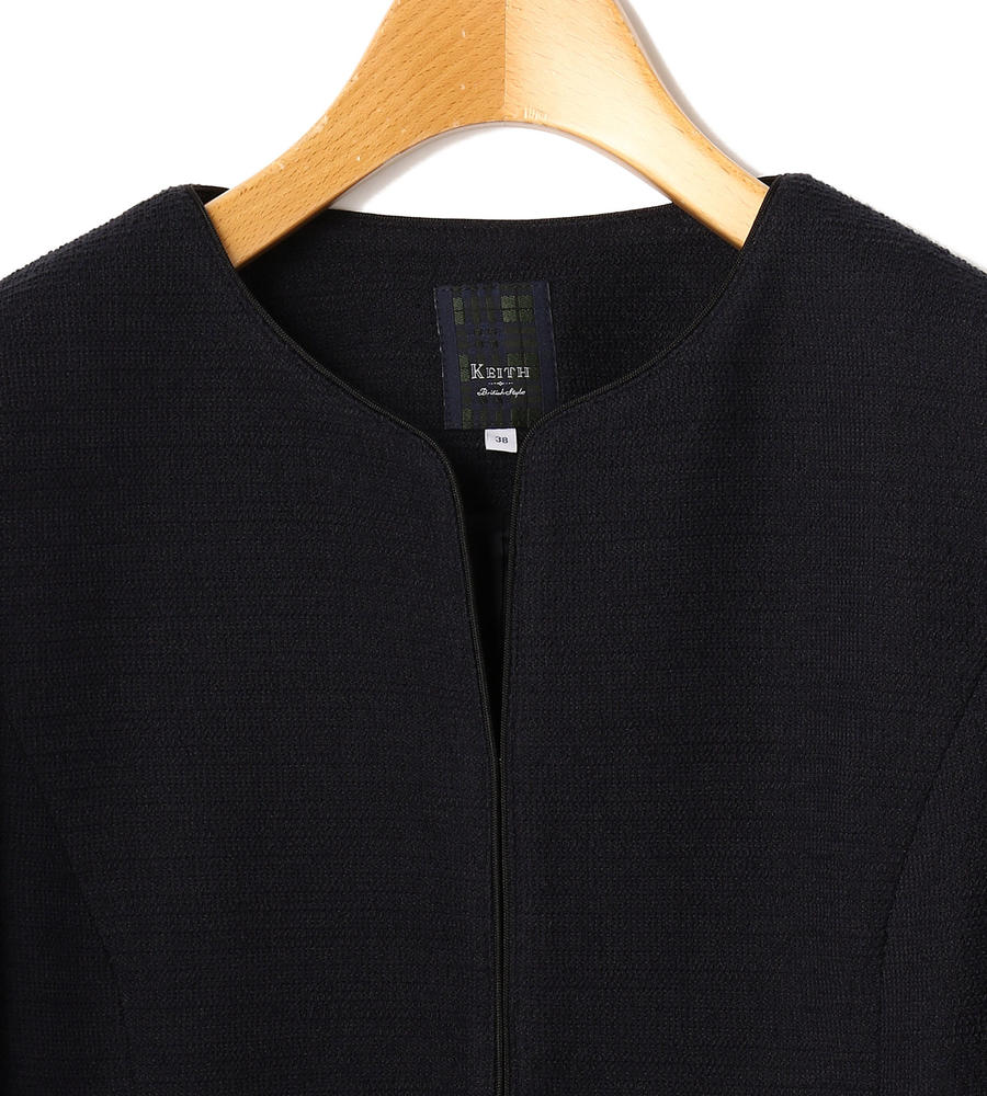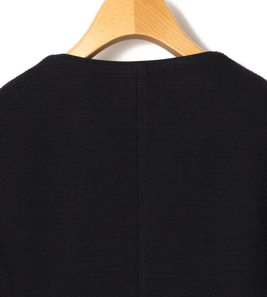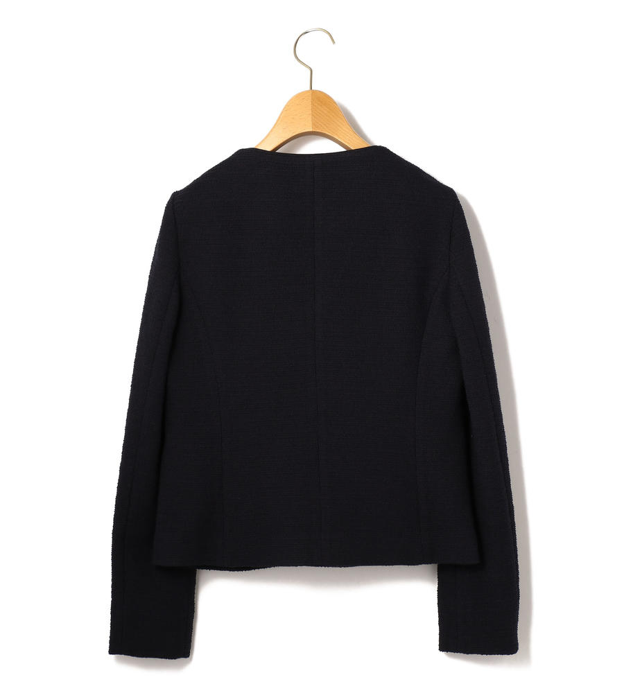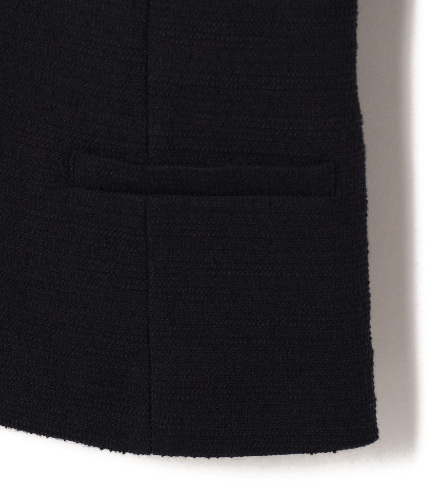 エレガントなツイードジャージー素材で仕立てたジャケット。顔まわりをすっきりと仕上げ女性らしい印象で着こなせるノーカラーデザイン。フロントにポケットを配置し、前開きはボタンレスのフック仕様でシンプルに仕上げました。コンパクトな着丈がワンピースとも、スカートやパンツともバランス良く着こなせるアイテムです。