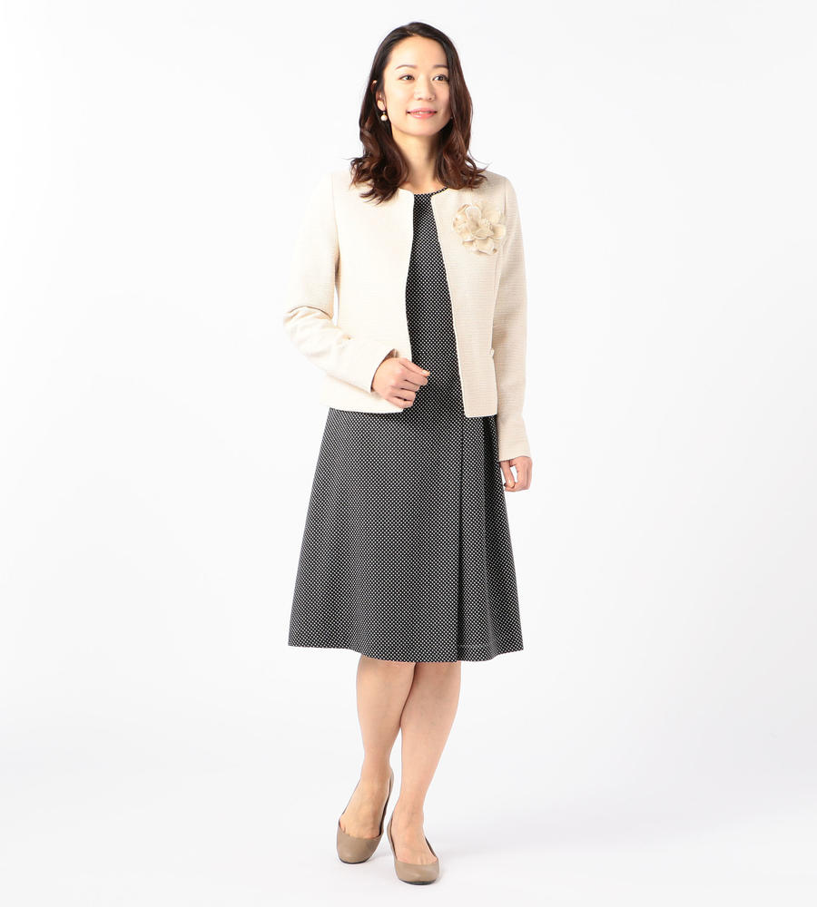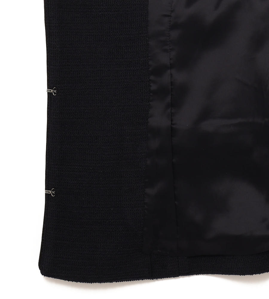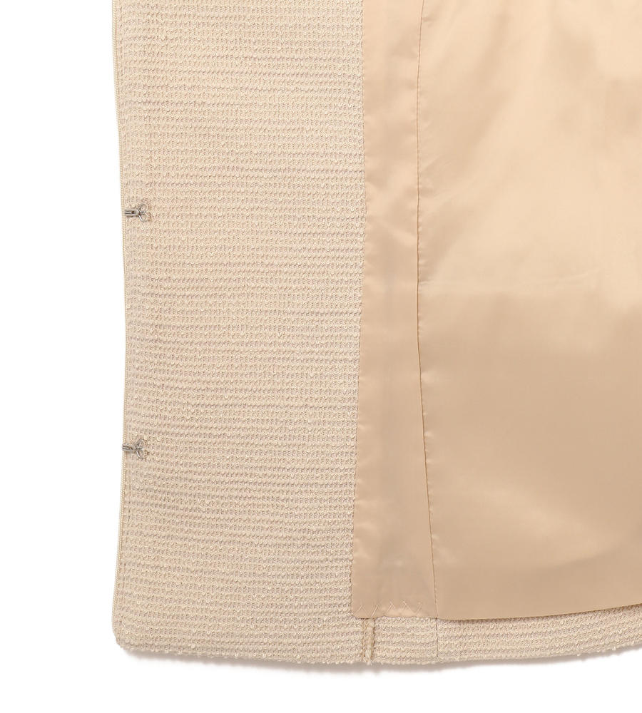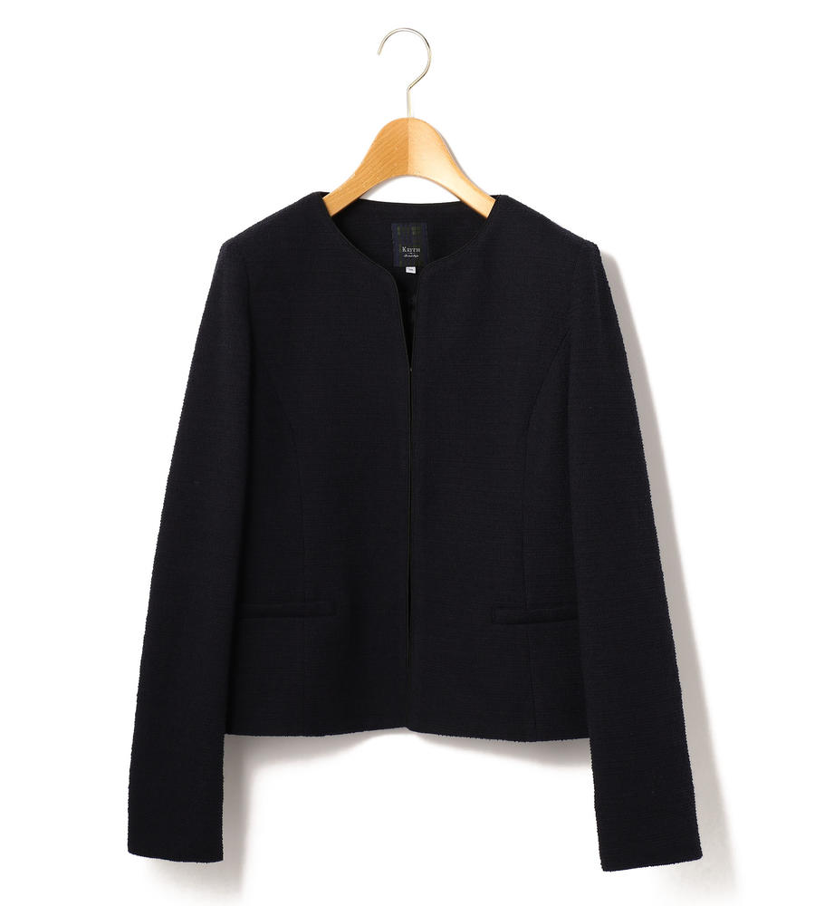 エレガントなツイードジャージー素材で仕立てたジャケット。顔まわりをすっきりと仕上げ女性らしい印象で着こなせるノーカラーデザイン。フロントにポケットを配置し、前開きはボタンレスのフック仕様でシンプルに仕上げました。コンパクトな着丈がワンピースとも、スカートやパンツともバランス良く着こなせるアイテムです。