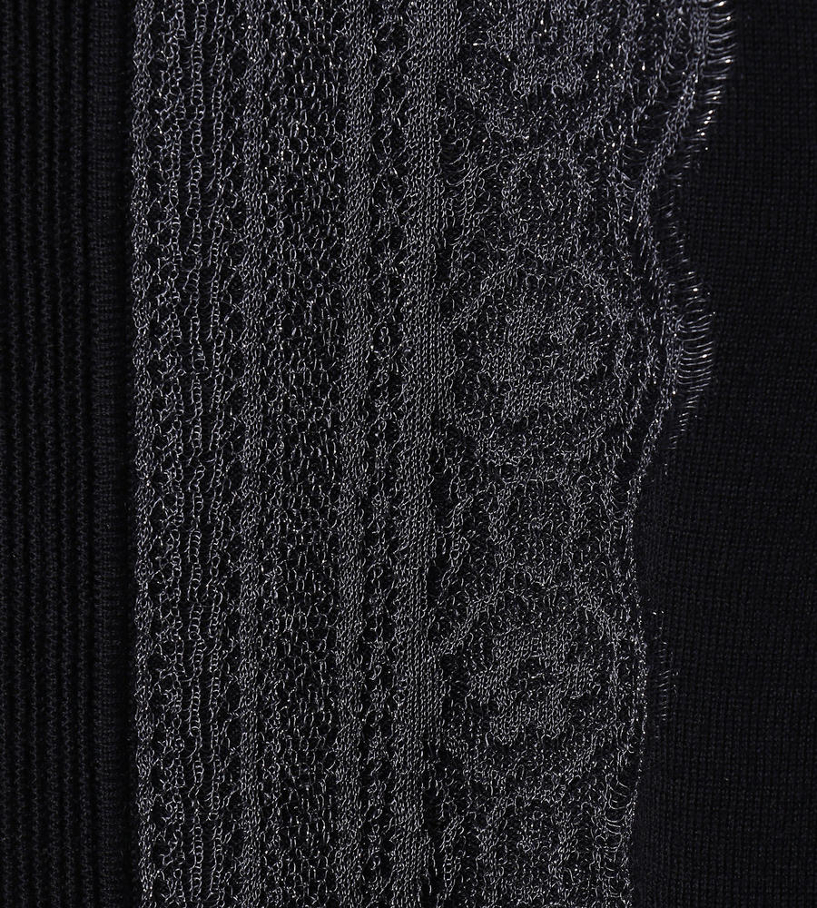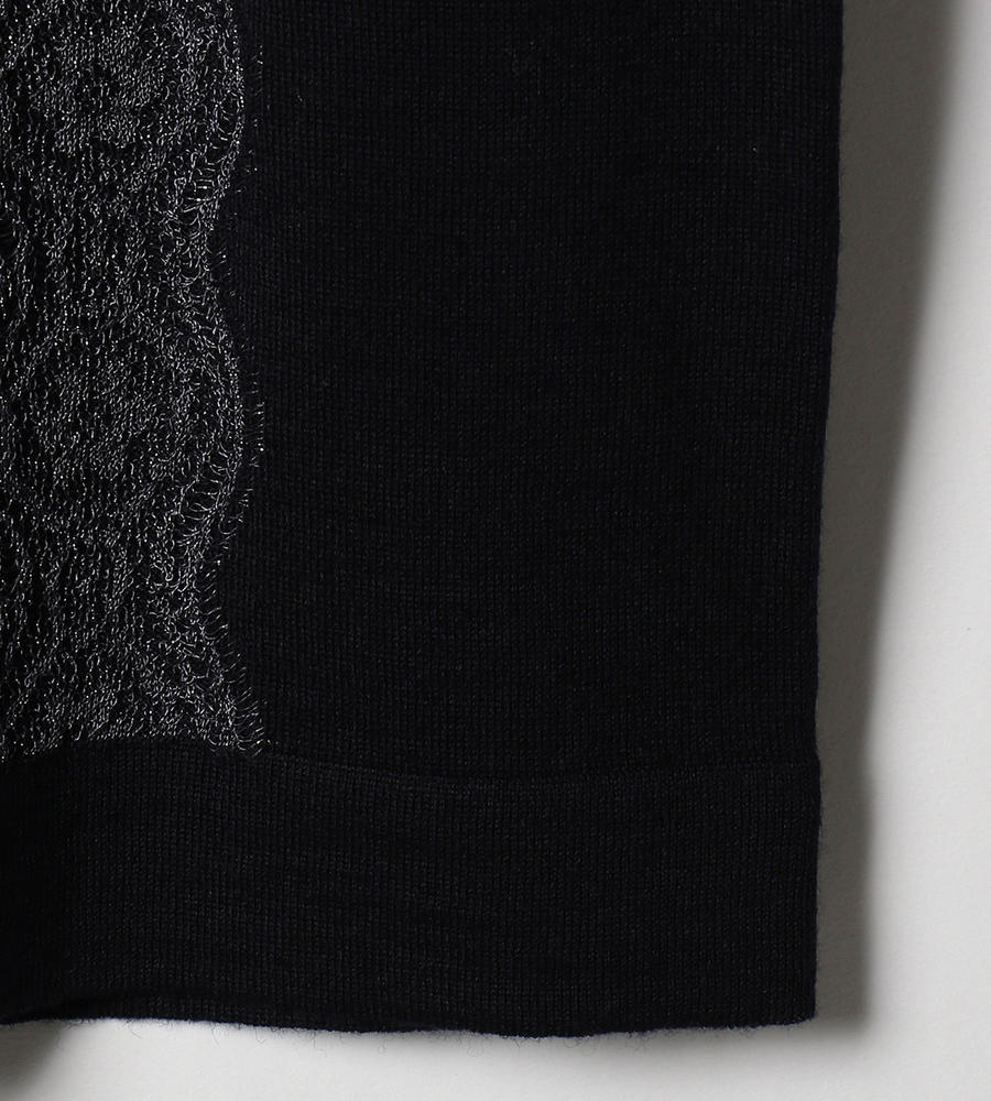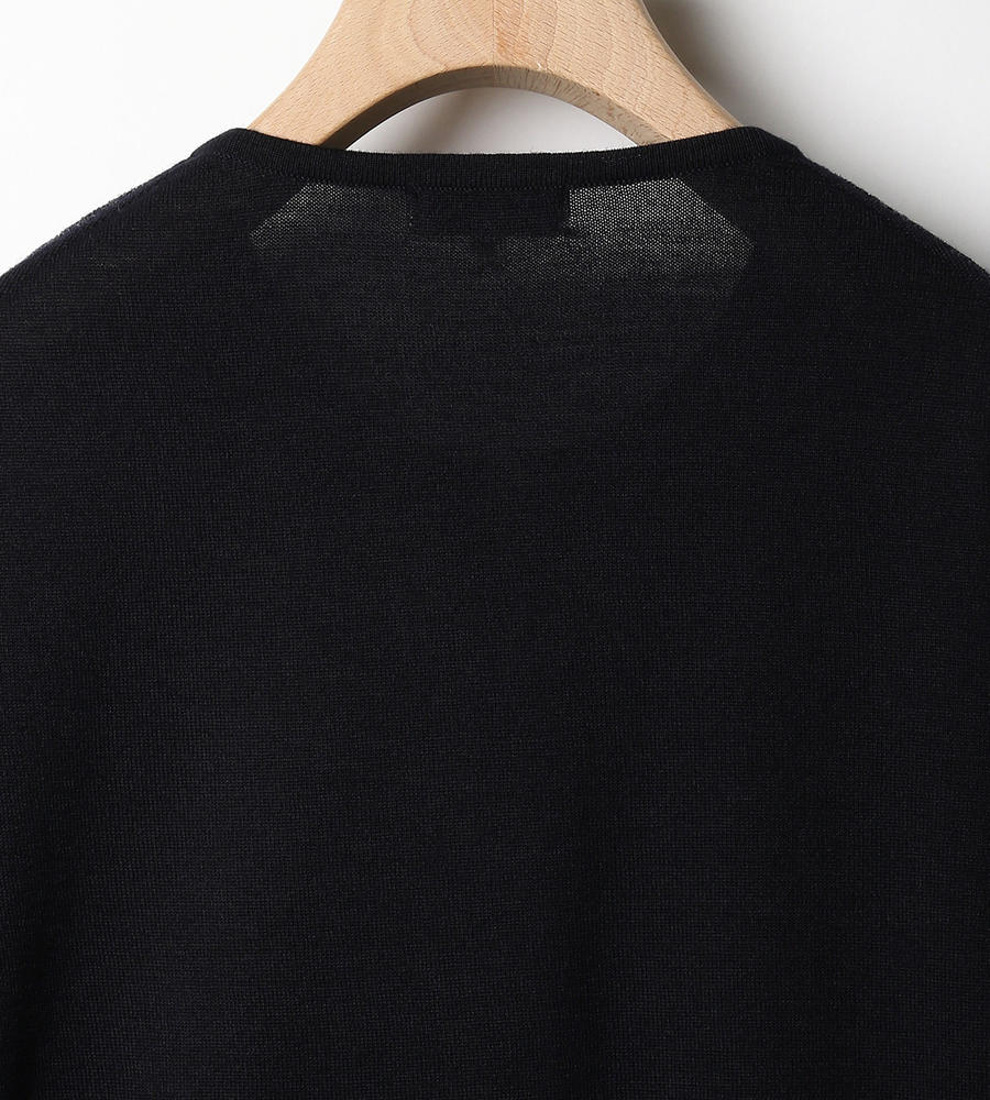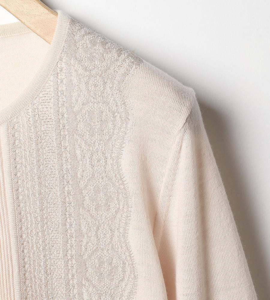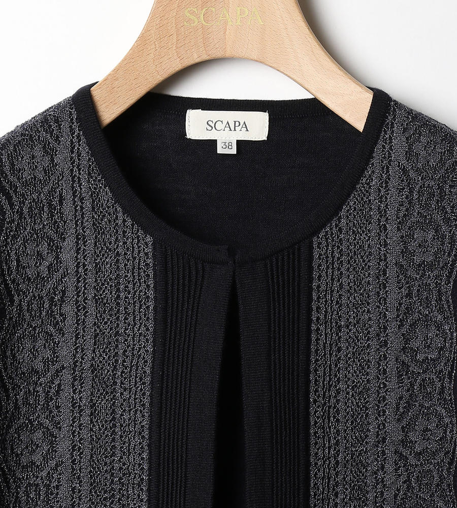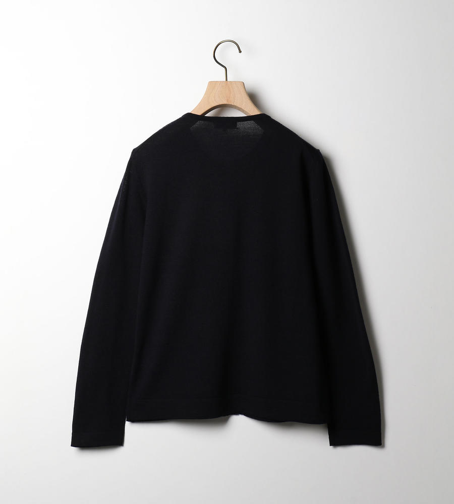 シンプルで取り入れやすい、ノーカラーデザインの長袖ニットカーディガンです。前立てには細かなピンタックを施し、その横にラメ入りのレースを重ねました。ほどよい華やぎがスタイリッシュで、大人の着こなしに馴染む一枚。クリーンなハイゲージ仕立てで、きれいめなスタイルへと導きます。