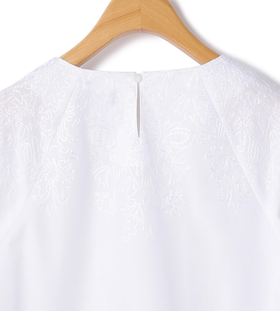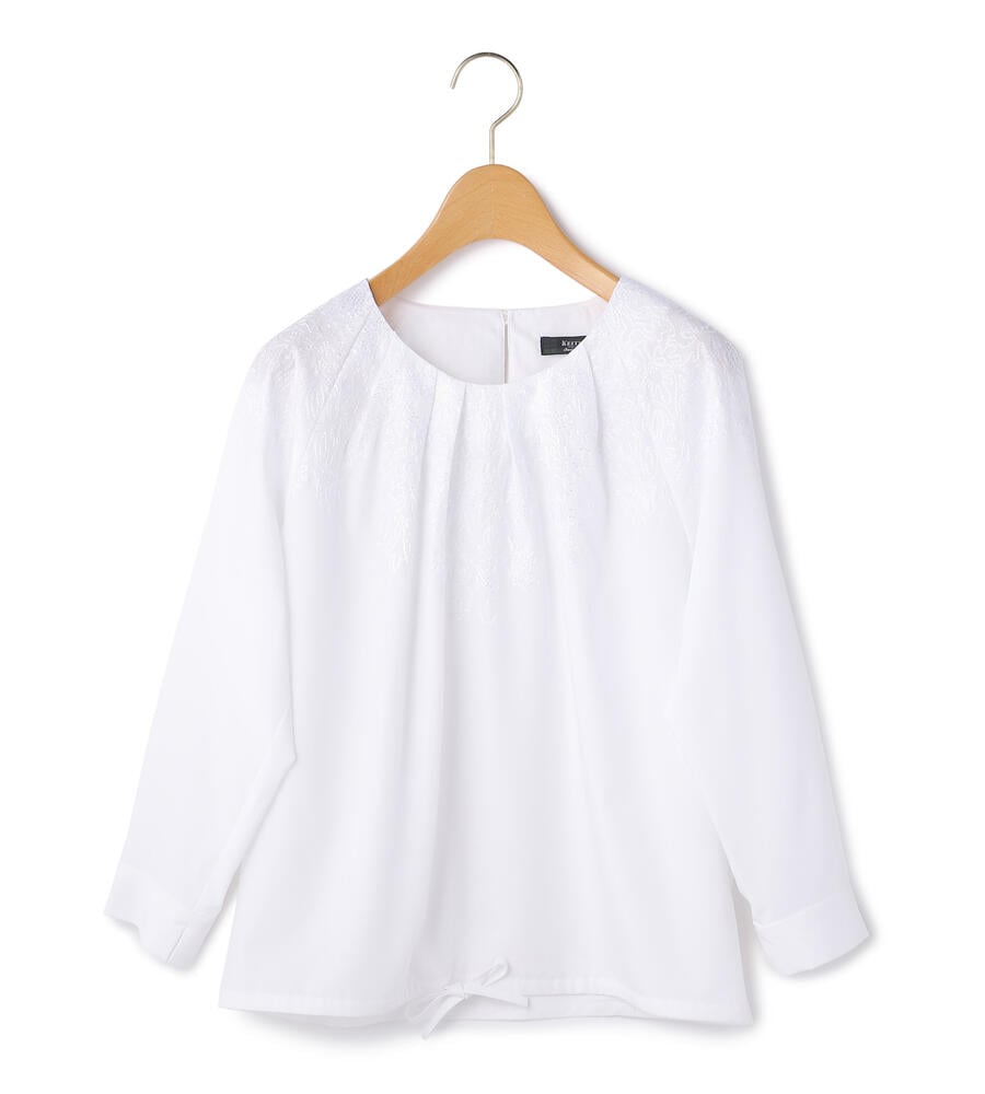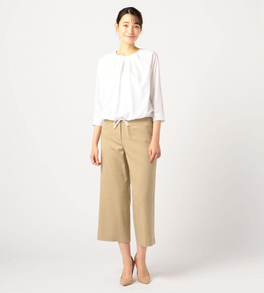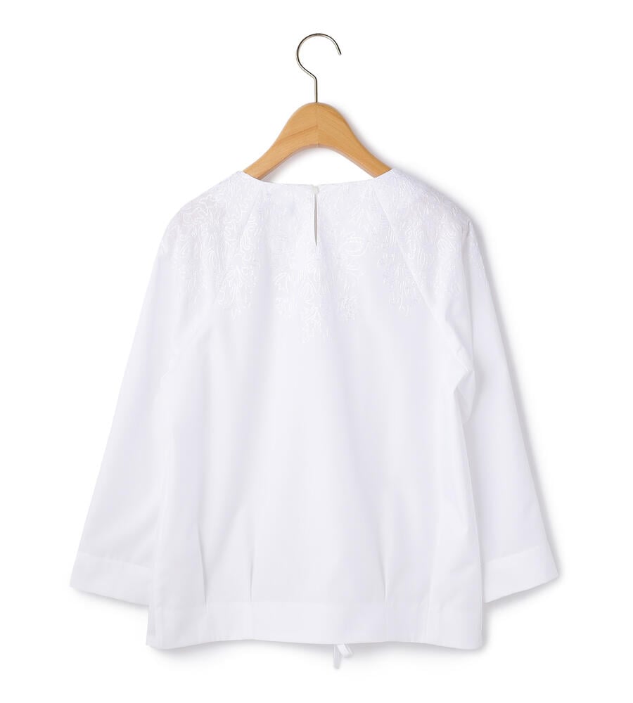 首まわりにあしらった美しいレースが顔まわりに華やぎを与えるブラウスです。フロントにタックをほどこし女性らしくやわらかな印象に仕上げています。バックネックはボタンクロージャー。腕まわりにゆとりを持たせたラグランスリーブがコンフォートなムードに。裾に通した紐を絞ればお好みのシルエットにアレンジが可能です。