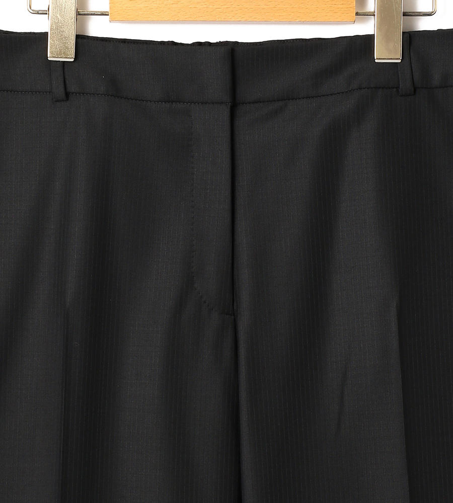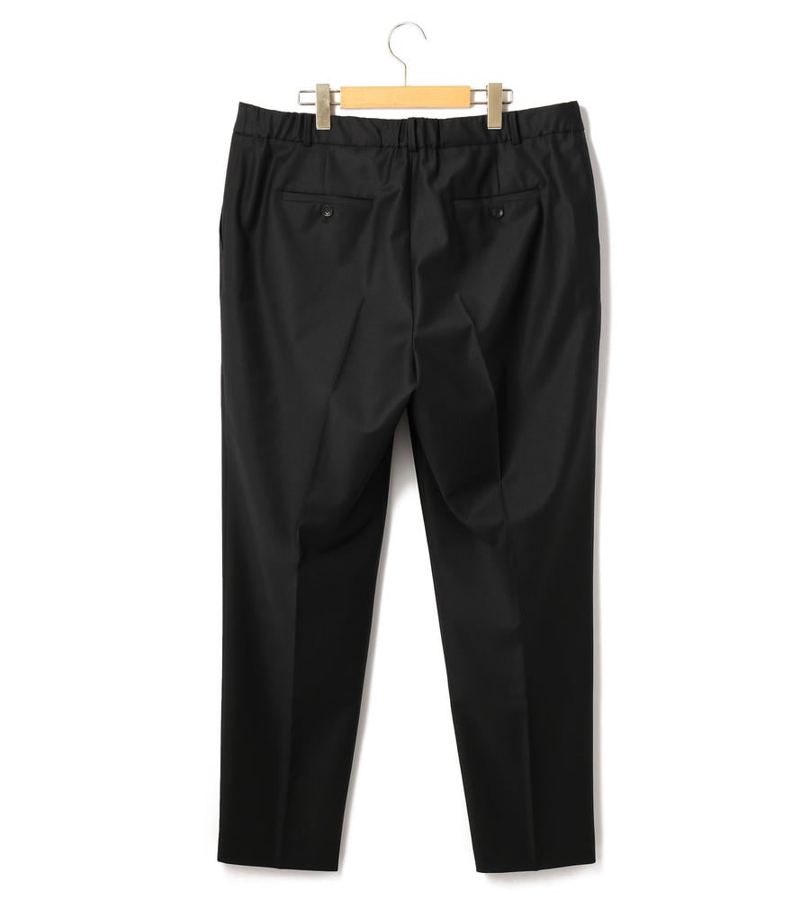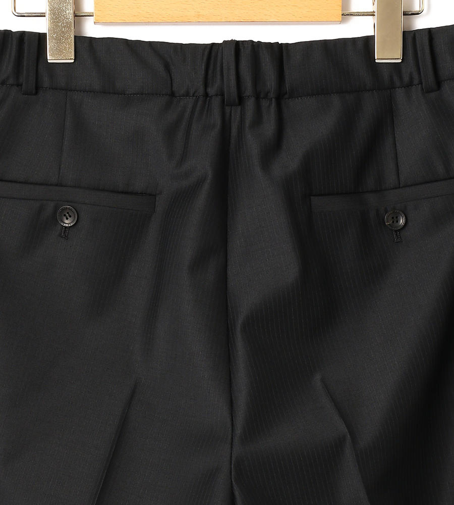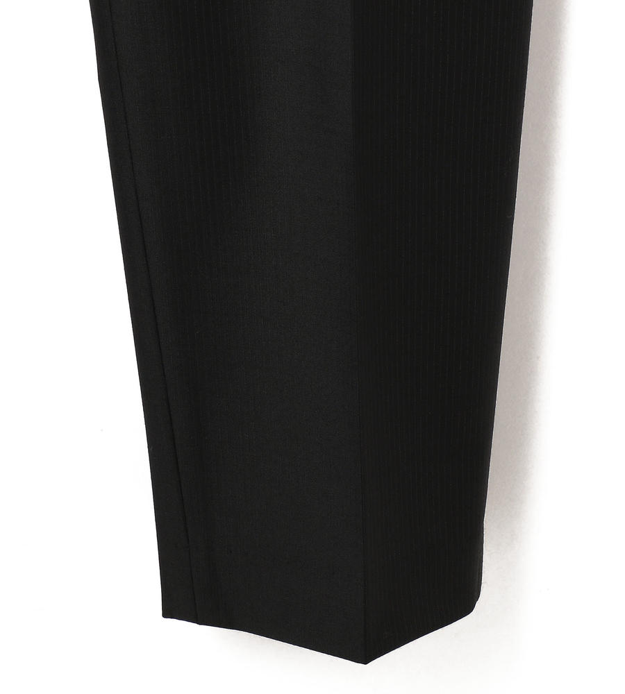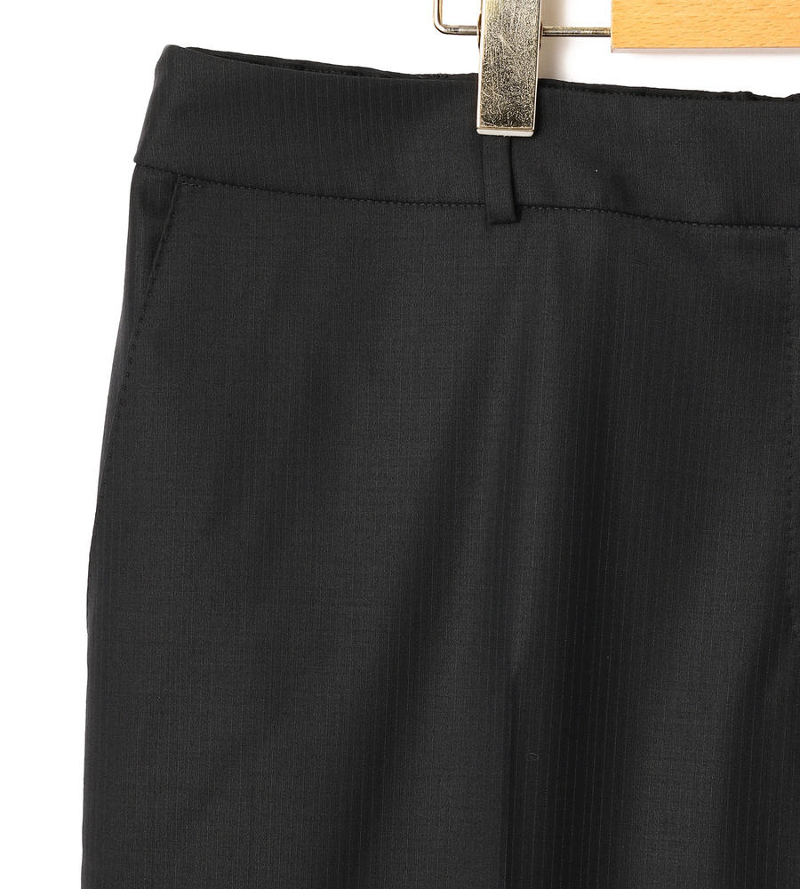 マニッシュなエッセンスが香るストライプ柄のウールブレンドパンツ。裾に向かってスリムになるテーパードシルエットは足元を軽やかに仕上げ、シューズとコーディネートしやすいのがポイント。バックウエストがゴム仕様になった快適な履き心地。センタープレスがすっきりとした脚のラインを演出します。