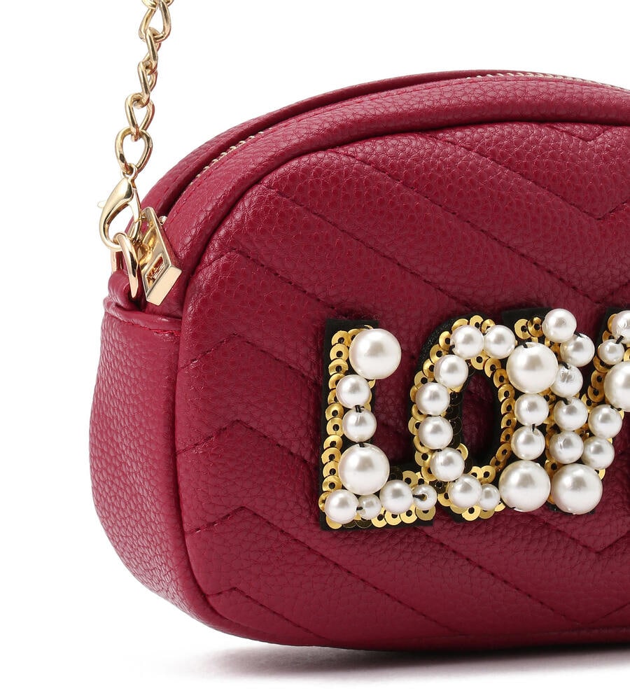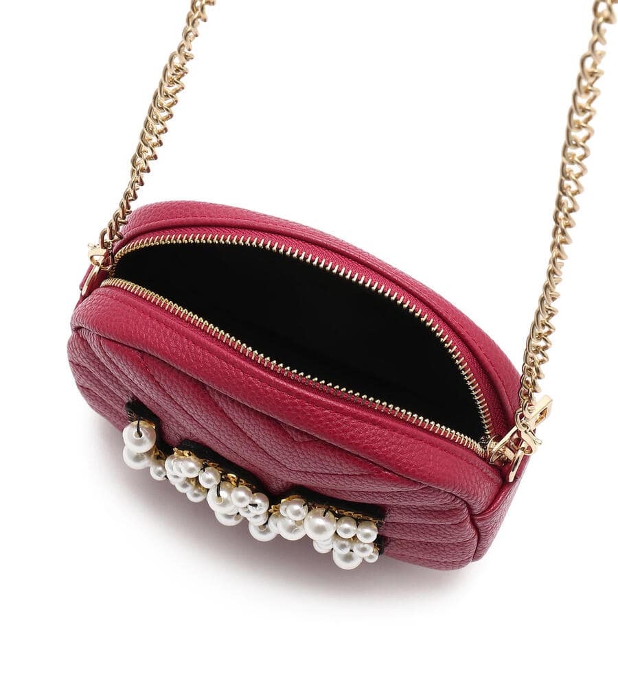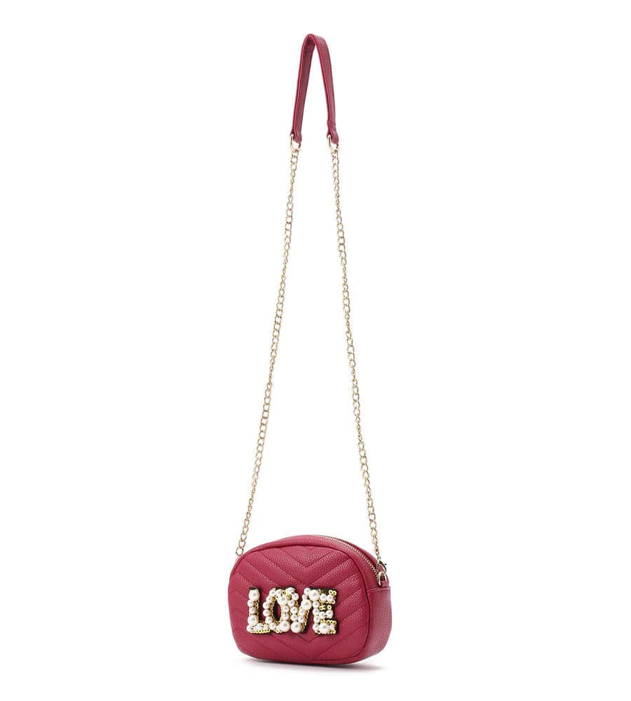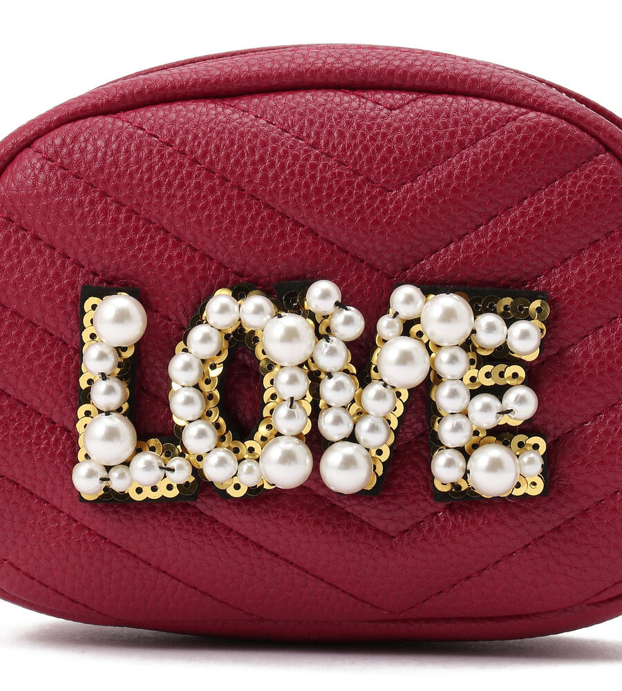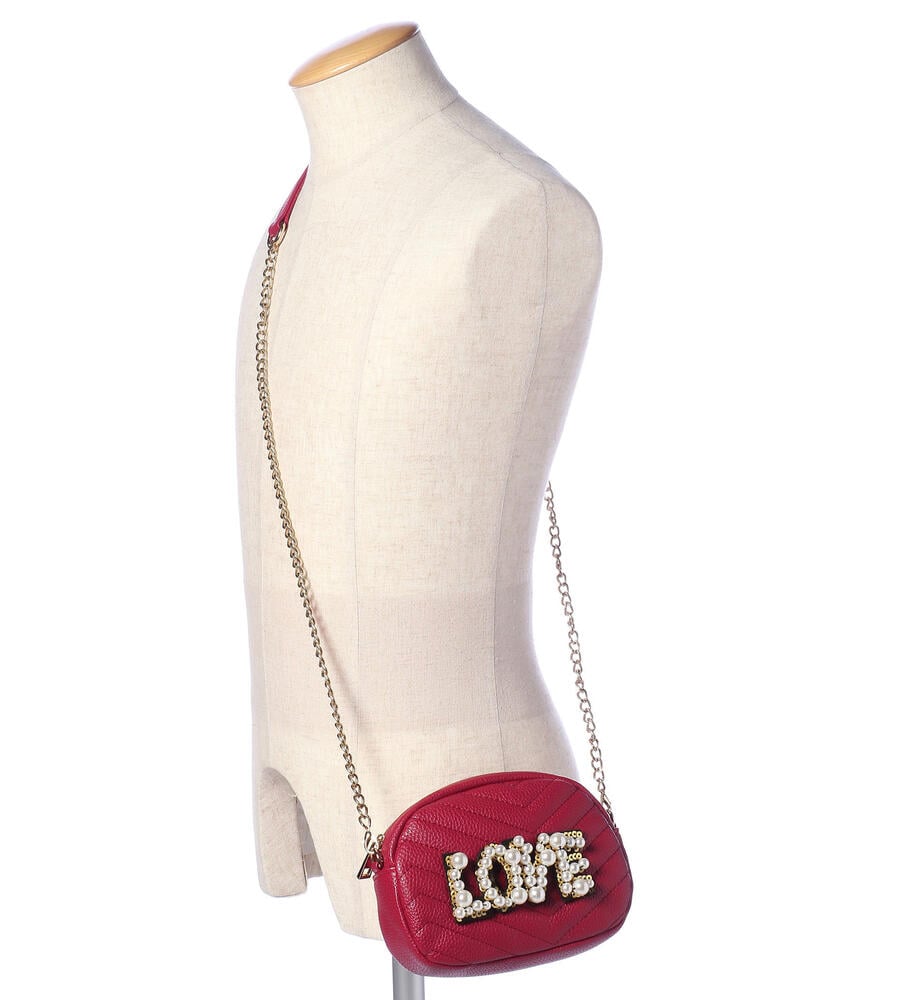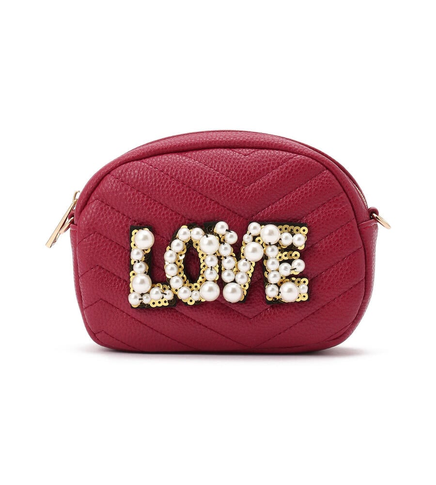大きさの異なるパールモチーフで‘LOVE’を表現したエコレザーショルダーバッグ。コロンとしたフォルム、ステッチワークで表情豊かに仕上げたデザイン。ショルダーはお好みでオン、オフできるフック仕様。チェーンとスパンコールはゴールドを採用し、リュクスなムードを高めています。